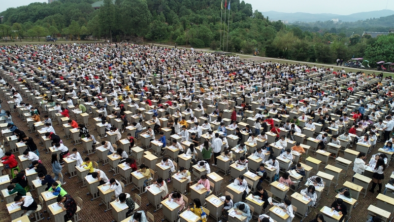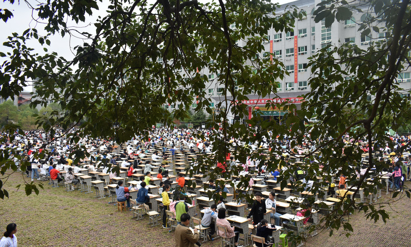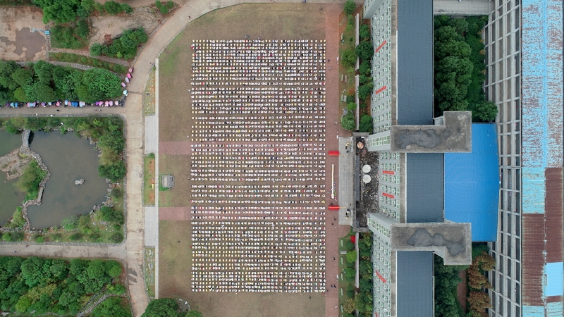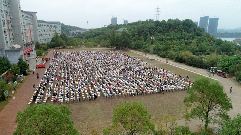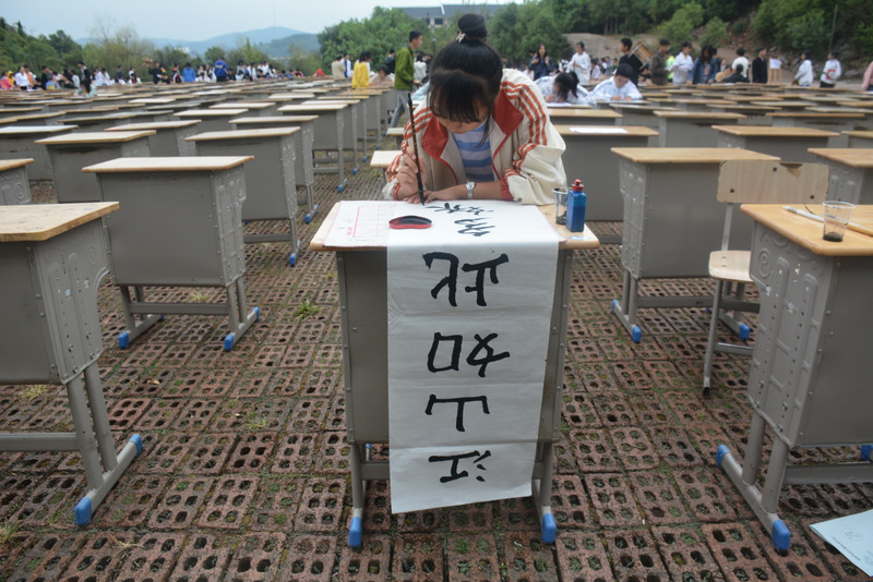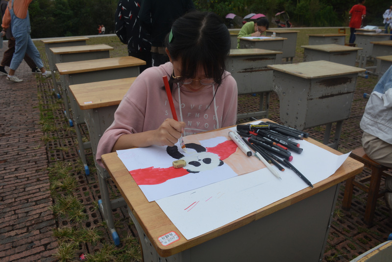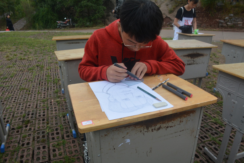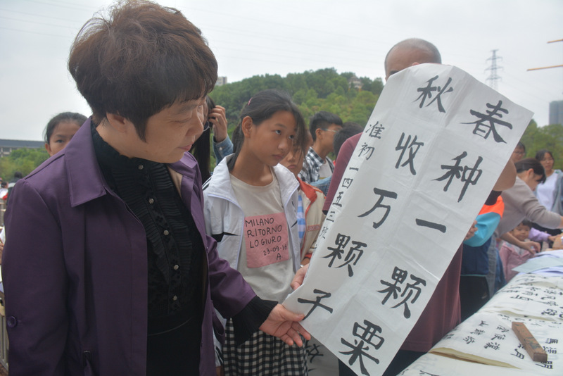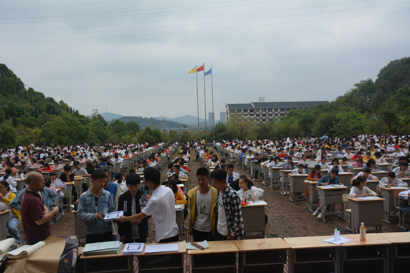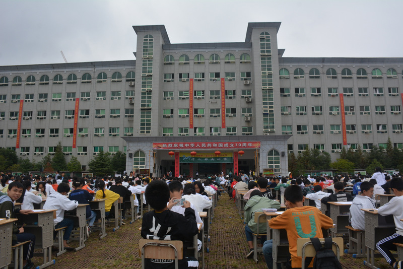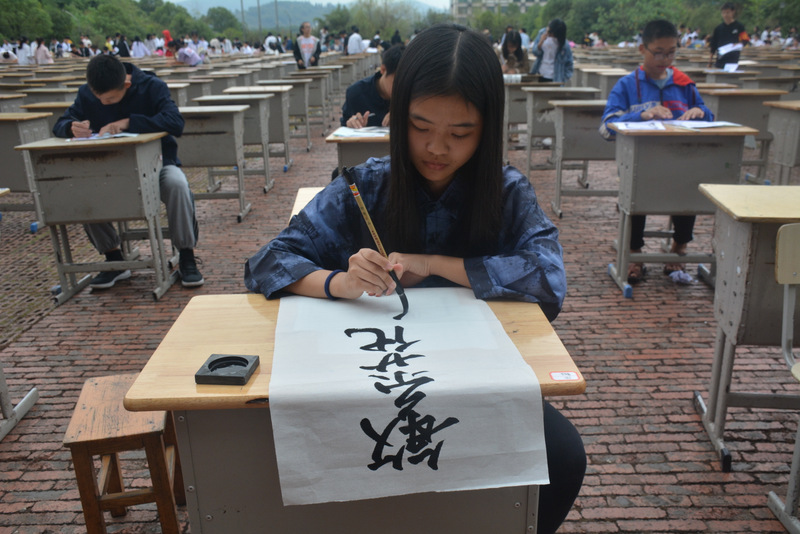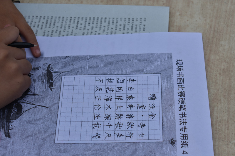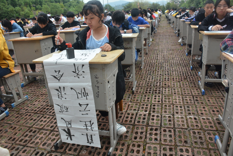 学校广场举行的是第三届中学生体育艺术节千人书画大赛。说是千人大赛,实则报名参与硬笔书法大赛的有1253人,毛笔书法大赛133人,绘画比赛807人,总共2193人。在这里,我们看到了书法老师为庆祝建国70周年、缅怀开国领袖毛泽东、弘扬中华民族传统文化而精心选择的书写内容,毛泽东青少年时期写的《五古·吟天井》《七绝·咏蛙》《七绝·赠父诗》《沁园春·长沙》《沁园春·雪》等大量诗词,以及李白、杜甫、王维、白居易、苏轼、陆游等唐宋名家的名篇赫然在列,同学们既展示了自己的书写功力,又获得了品读品写名人名作的美的熏陶。