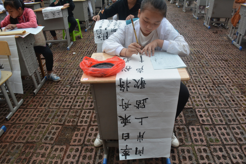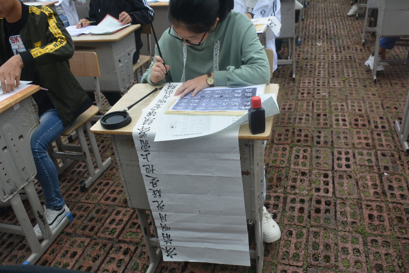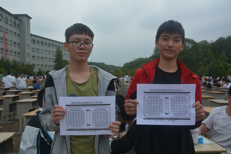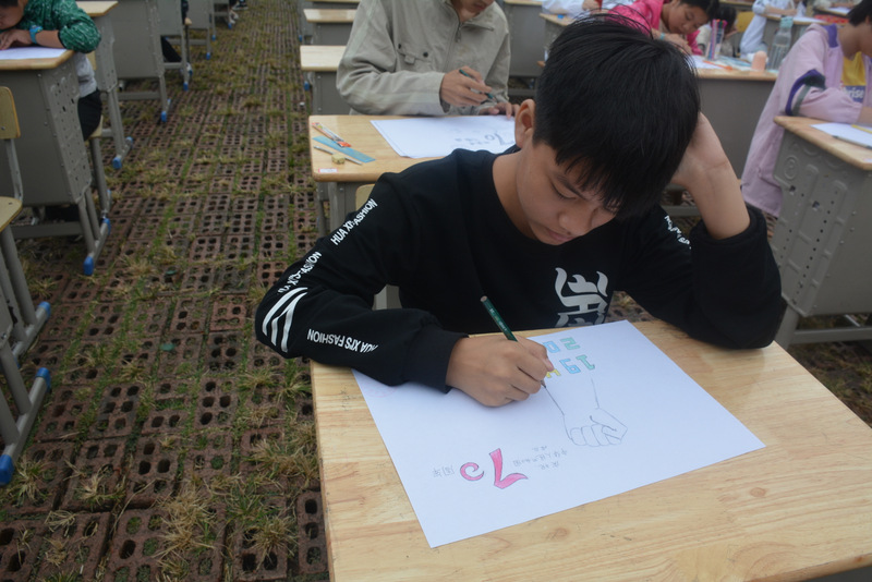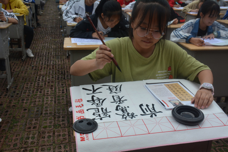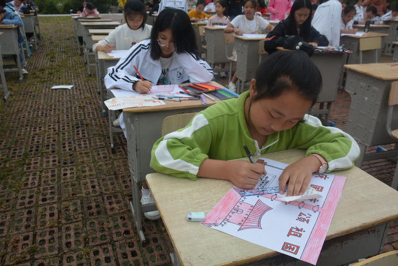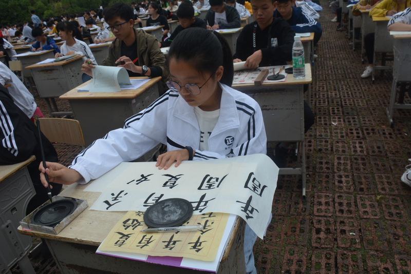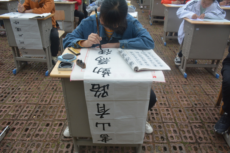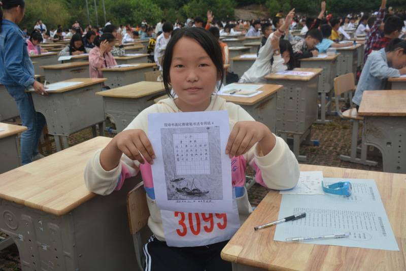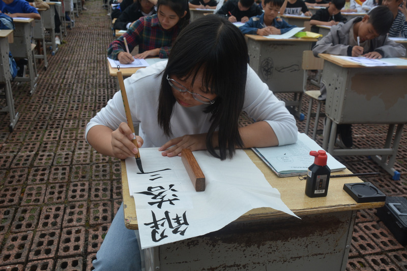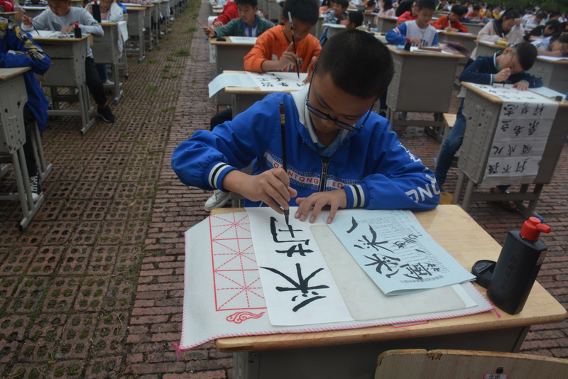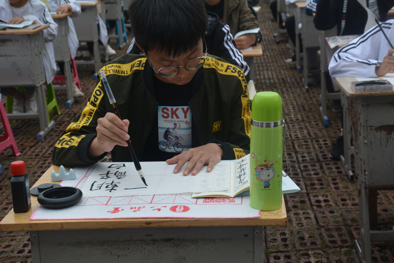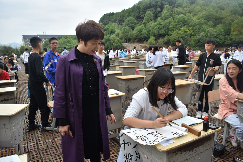 10月12日下午,正源学校好不热闹:东边中学生运动场,喊声震天,龙腾虎跃,群雄逐鹿;中间的学校广场,两千多套课桌凳布兵列阵,井井有条,两千余名中学生在这里气定神宁,笔走龙蛇,或精工细描硬笔书法,或柳筋颜骨挥毫泼墨,或五颜六色涂绘丹青。文武并举,体艺齐飞,把正源学校搞得如火如荼,热气腾腾。