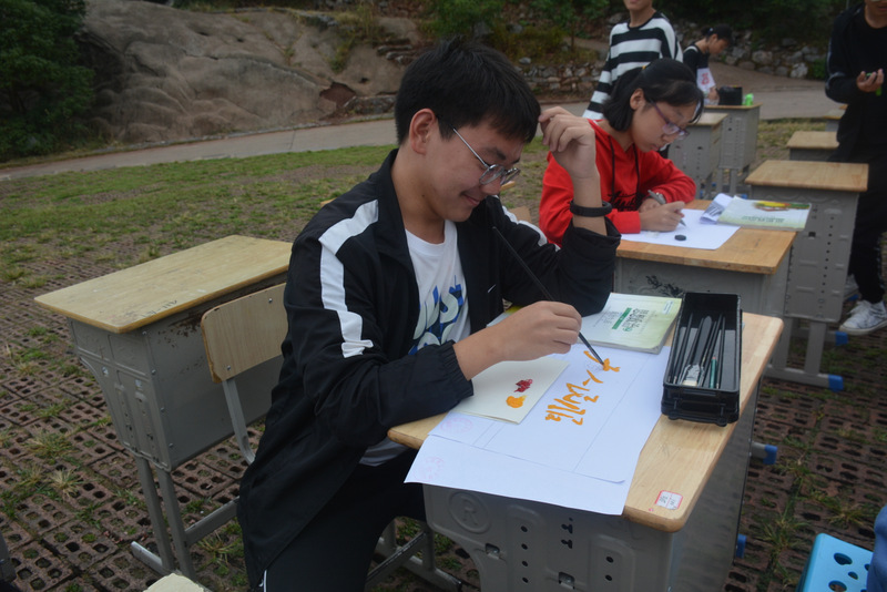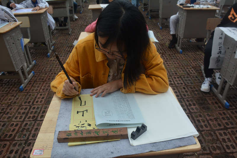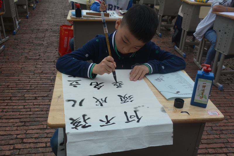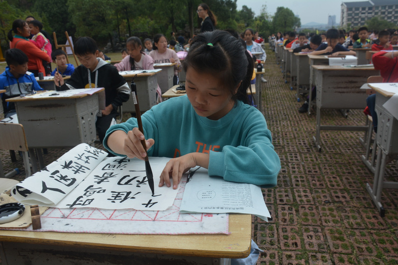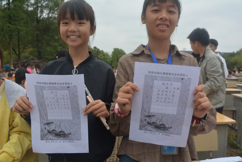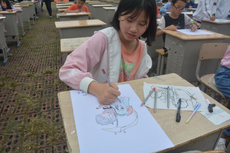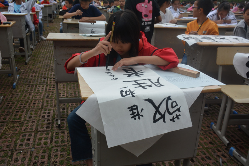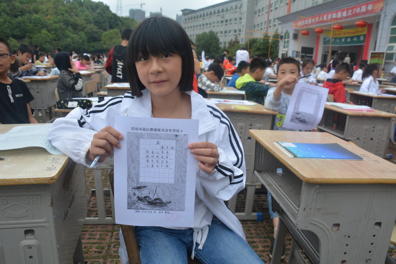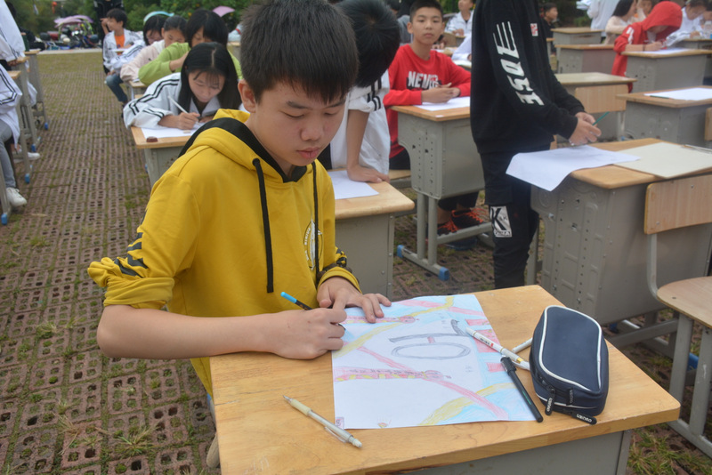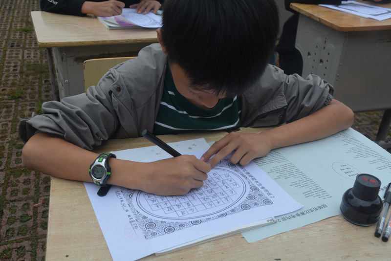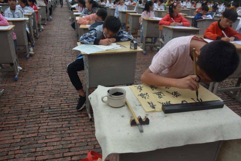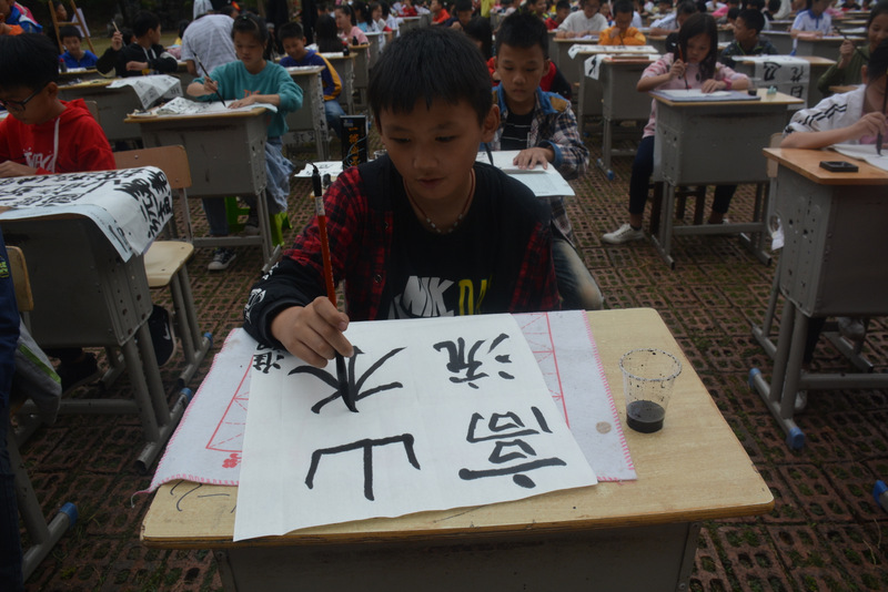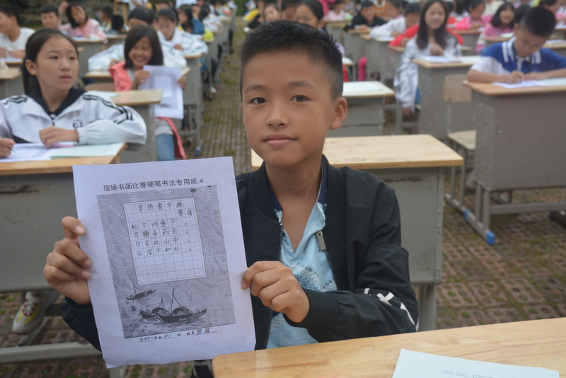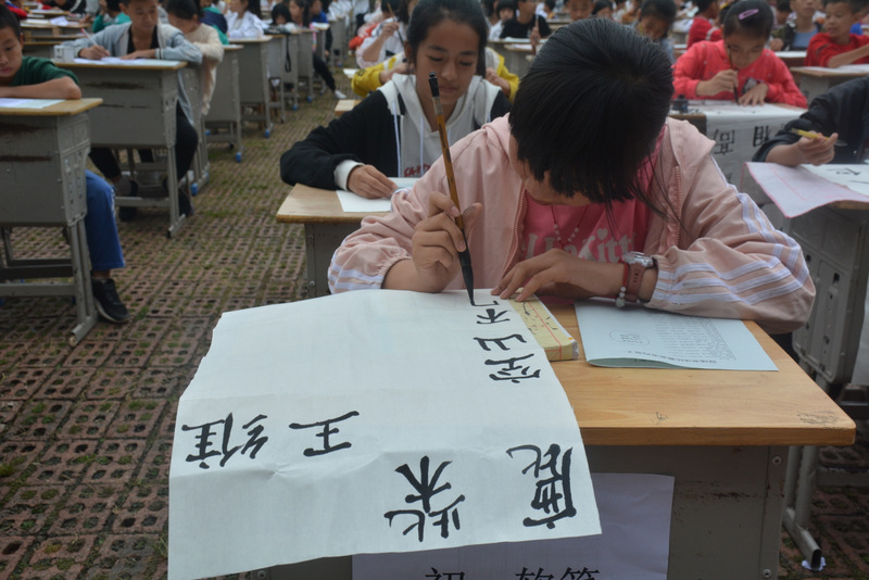 10月12日下午,正源学校好不热闹:东边中学生运动场,喊声震天,龙腾虎跃,群雄逐鹿;中间的学校广场,两千多套课桌凳布兵列阵,井井有条,两千余名中学生在这里气定神宁,笔走龙蛇,或精工细描硬笔书法,或柳筋颜骨挥毫泼墨,或五颜六色涂绘丹青。文武并举,体艺齐飞,把正源学校搞得如火如荼,热气腾腾。
