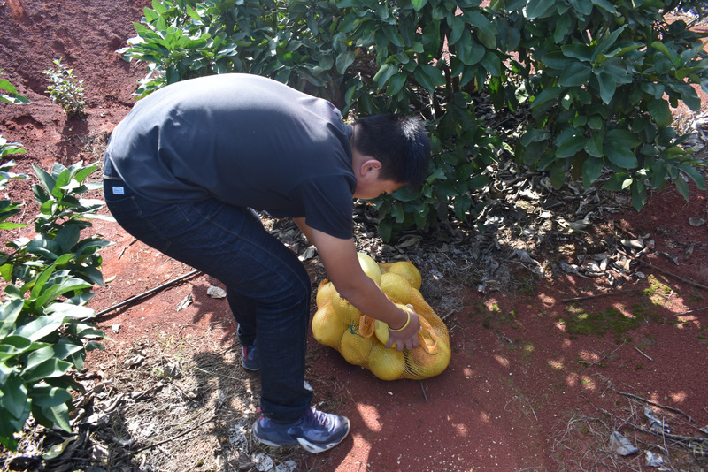 下午一点钟准时出发,校车经过近一个小时的驱驰,到达目的地。同学们走进果园,只见绿油油的果树上挂满沉甸甸的柚子,一个个喜笑颜开,教室里的沉闷气息一扫而光。果园主人交代注意事项,同学们便三人一组、两人一帮地行动起来。果树不高,采摘很方便,很快便一袋一袋地集中放到了路边,等待过磅上车。一个半小时后,果园主人预备能装8000斤柚子的网袋都装上了满满的柚子。