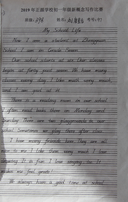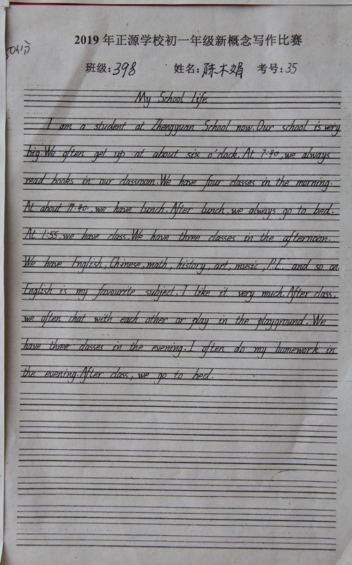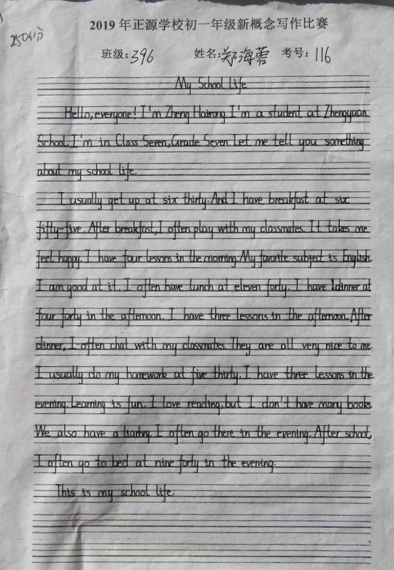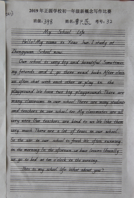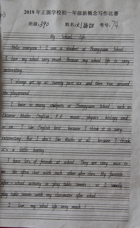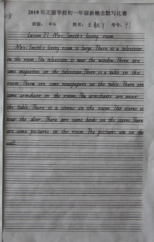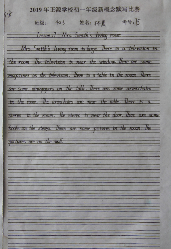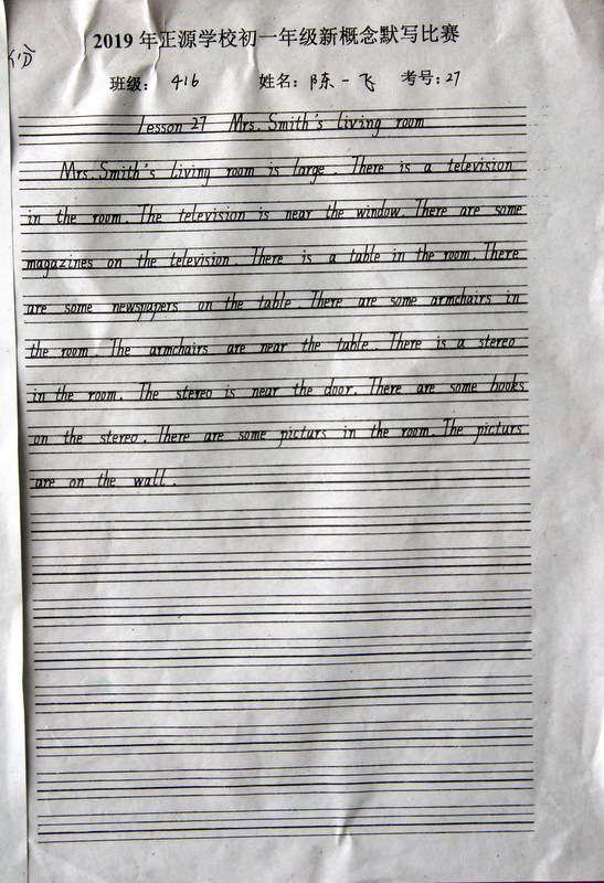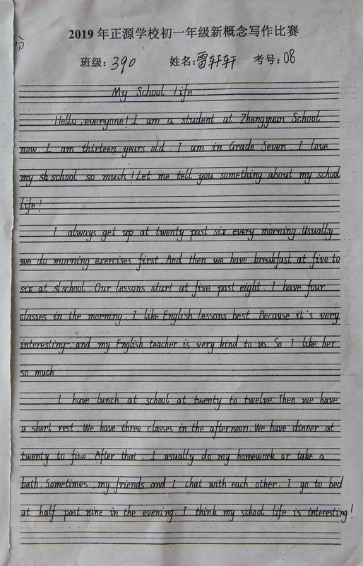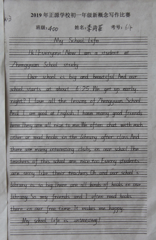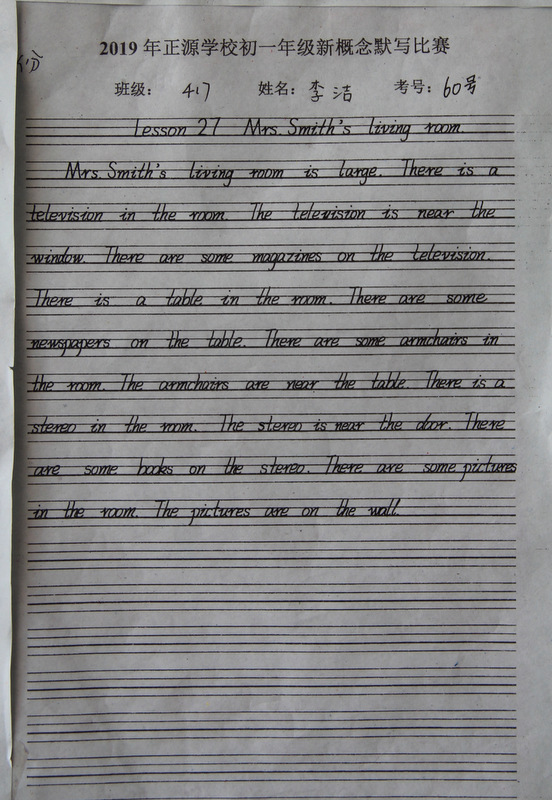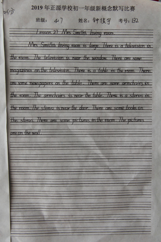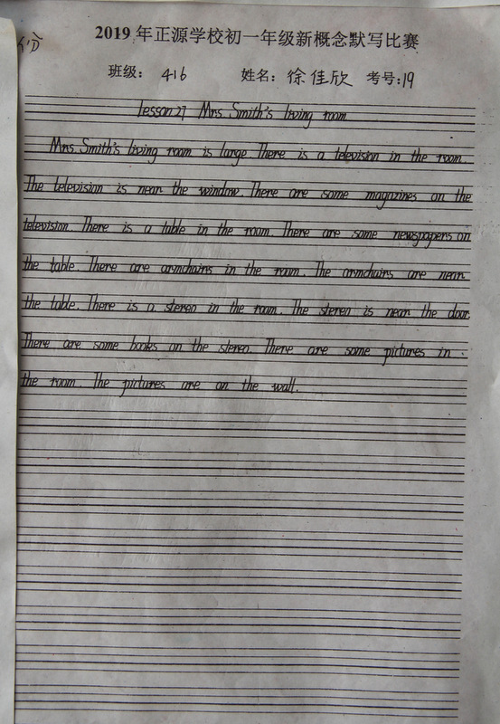 七年级,中学阶段的起始年级。一般情况下,学生对英语的学习才刚刚入门,但正源学校七年级学子们的英语已达到了一定的境界。本届七年级分为A、B两段。A段学生在准初一年级时已完成了仁爱版本七年级上、下册,有一定的英语基础。因此,本次他们进行的是英语写作竞赛;B段学生今年下学期才入学正源,暑假期间进行了为期一个月的暑期强训。强训期间主要学习新概念第一册前30篇课文。因此,B段竞赛的内容是新概念默写。为培养学生良好的书写习惯,本次竞赛对学生的卷面也有一定的要求,以便让学生在创造美、欣赏美的同时,提升英语语言素养和语言综合运用能力。