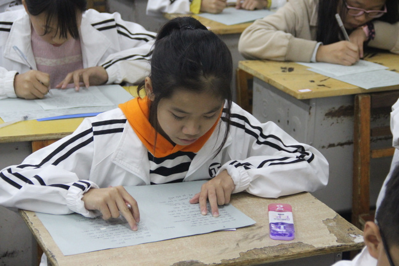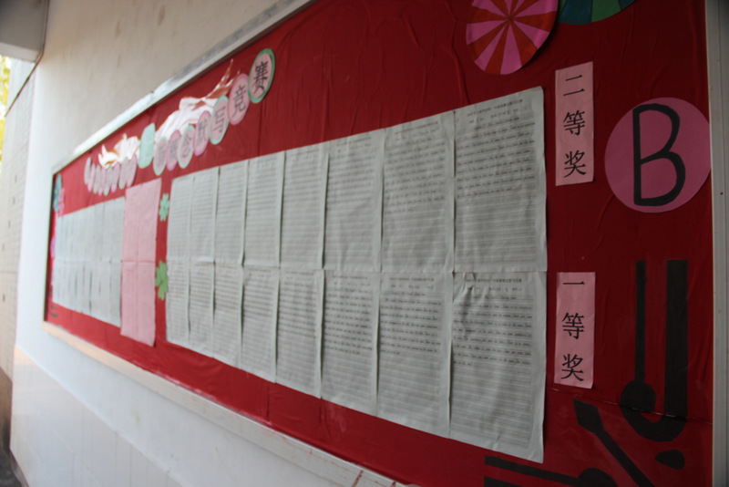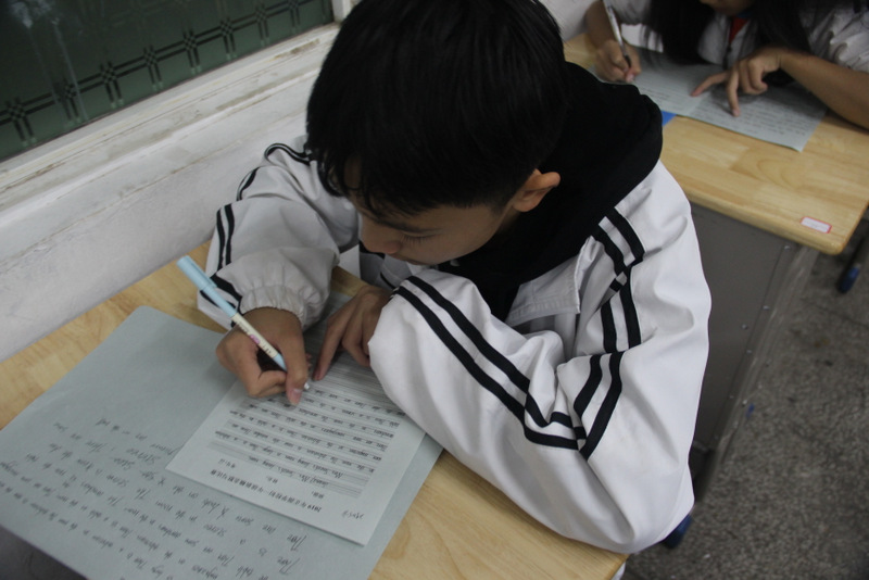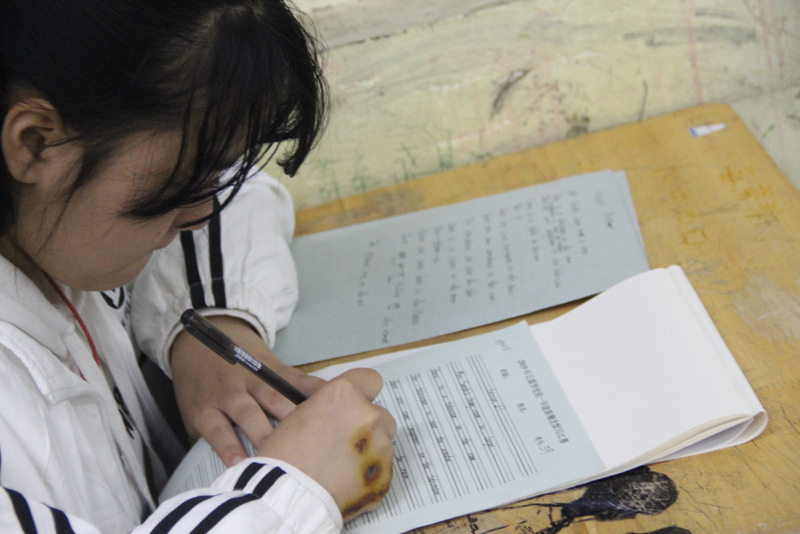 10月28号晚,来自40个班的260名参赛选手集中在四个考室进行最后的角逐。对于A段的学生来说,本次竞赛不仅需要具备一定的语法功底和文学素养,还得有过硬的书写本领。这是一场集写作和书写为一体的较量。因此,这场竞赛对他们来说难度不小。尽管如此,选手们还是胸有成竹。瞧,他们脸上的沉着,字里行间流露出的自信,展现出他们不一般的英语功底。相对于A段的写作来说,B段的这次默写竞赛较轻松:由监考老师随机抽取新概念第一册前30篇中的任意一篇进行默写。这些课文,学生们早已滚瓜烂熟,倒背如流了,只需一笔一画地尽情展示自己的圆润秀美作品。