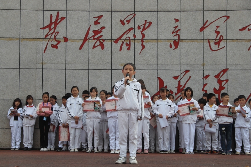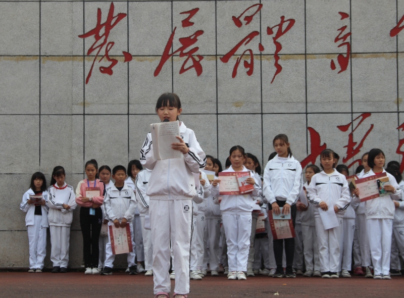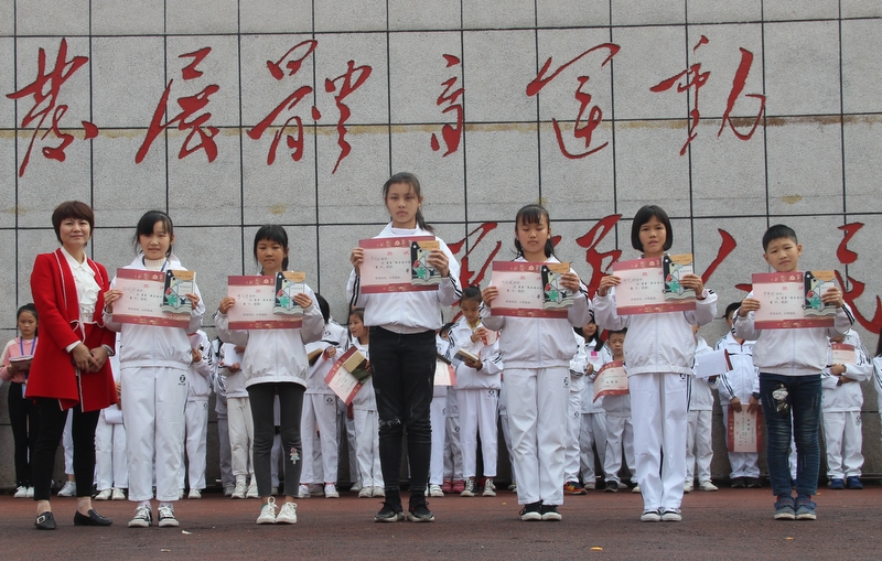 颁奖典礼在主持人谭娟老师优美动听的报幕声中拉开帷幕。首先是活动发起人、组织者贺江云主任发表讲话。她指出读书的意义在于“进德、修业”,在于“明德、亲民、止于至善”,接着指出读书的方法,应读什么样的书。诙谐幽默的贺老师为了让孩子们和怡心堂做亲密的朋友,居然还给怡心堂插播了一条广告:要问书堂哪家好,请到耒阳正源找;要说书堂哪家优,怡心堂堪比拼多多。评书语调把现场同学引得哈哈大笑。