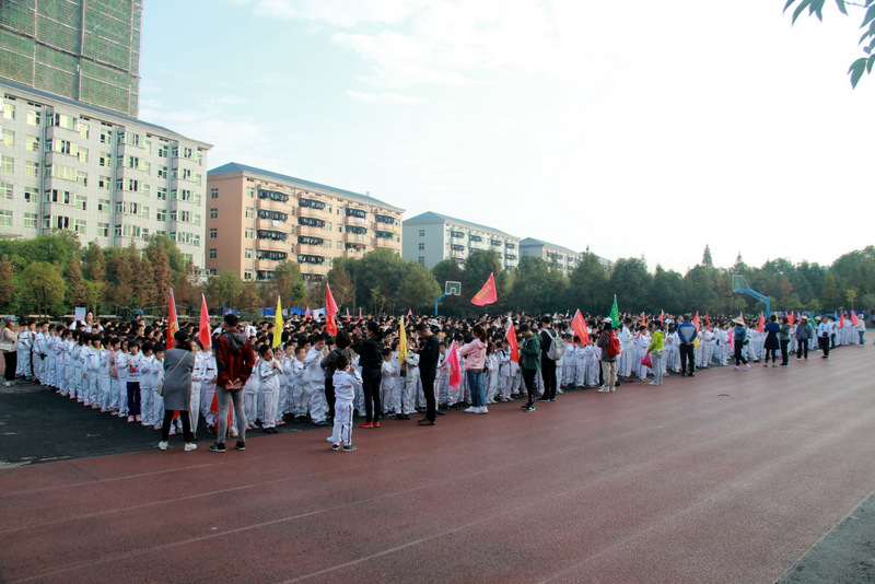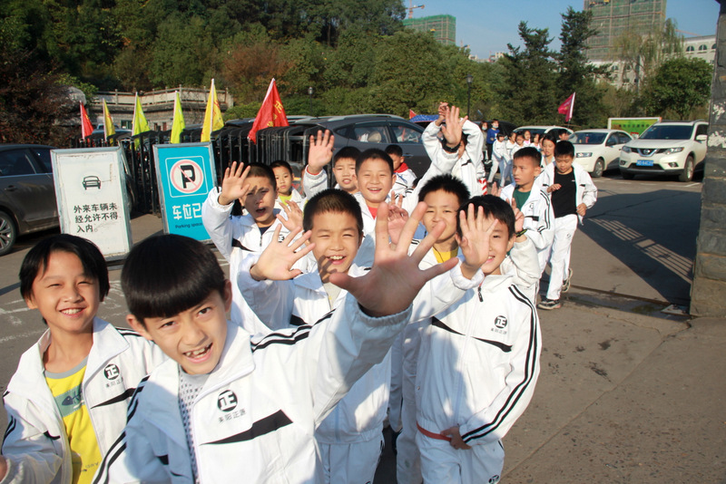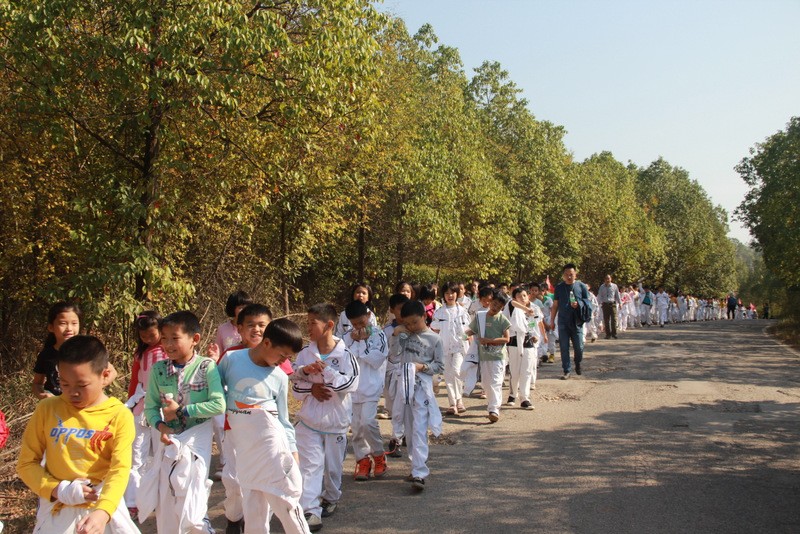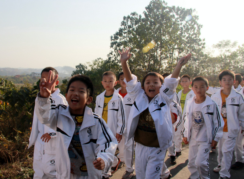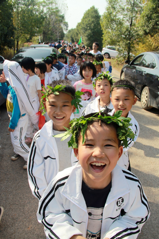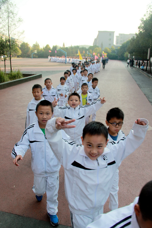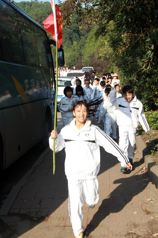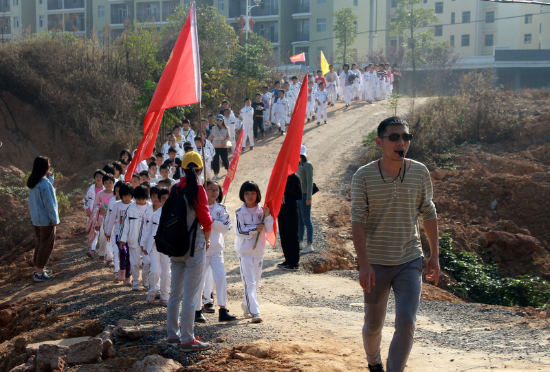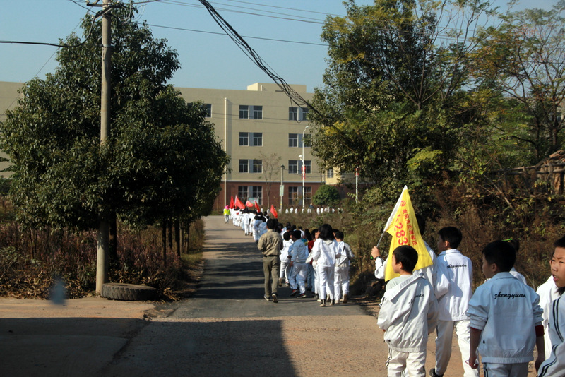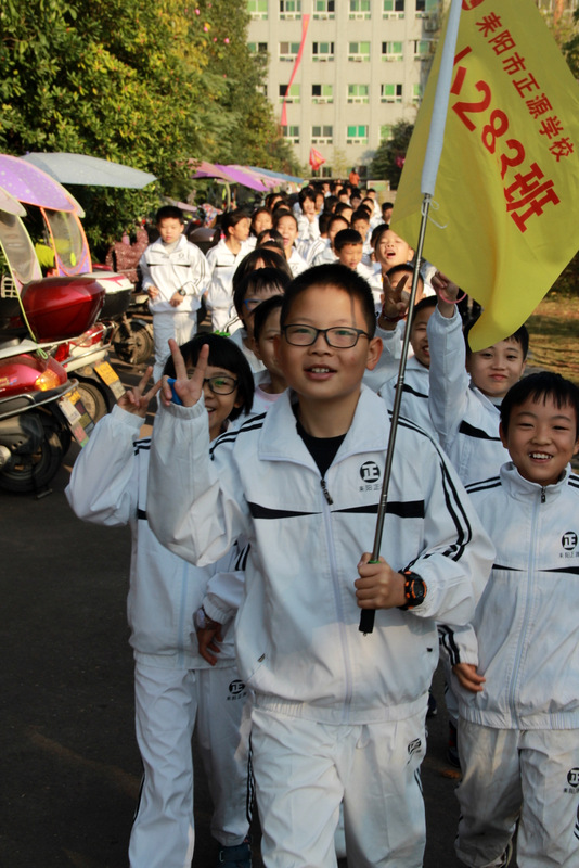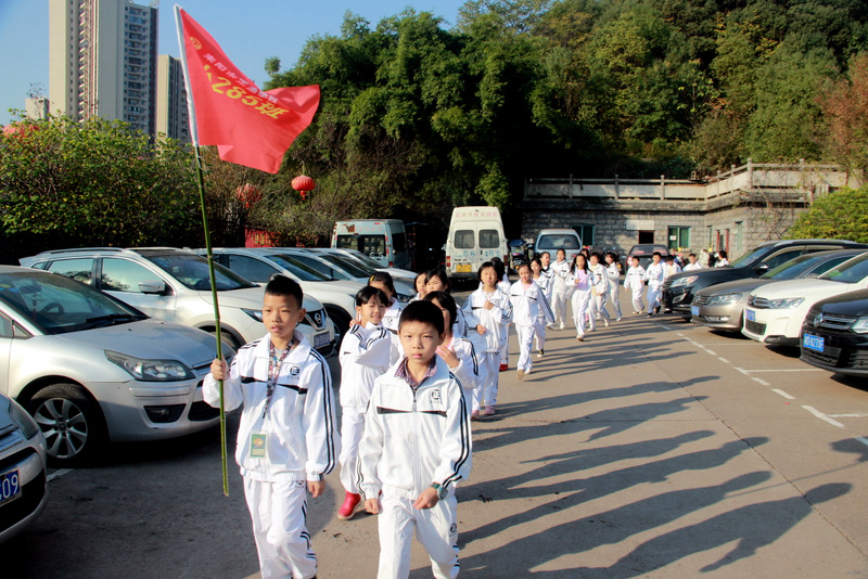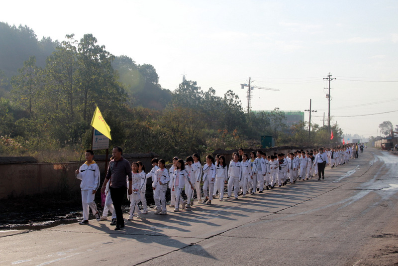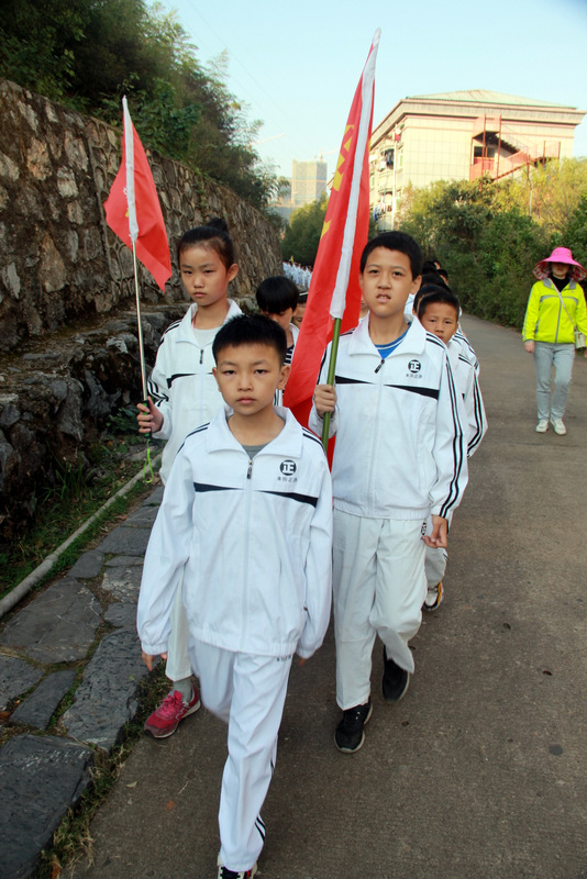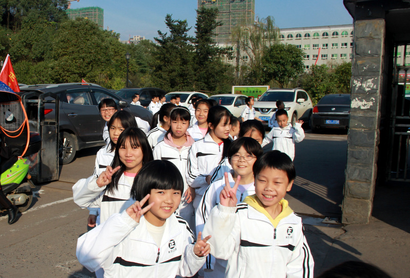 早上8点,小学生运动场上,小学三年级、五年级共29个班1674名学生整装待发,准备直奔蔡伦科技园附近的大金村大金山庄。瞧!那一张张稚气的脸蛋,洋溢着兴奋的笑容;一袭袭洁白的校服,灵动着耀眼的光芒;一面面鲜艳的彩旗,飘扬着绚丽的憧憬。这支庞大的“正源大军”斗志昂扬,豪情万丈,像一条巨龙行进在马路上,真可谓:晴空一军排龙上, 便引豪情到碧霄!