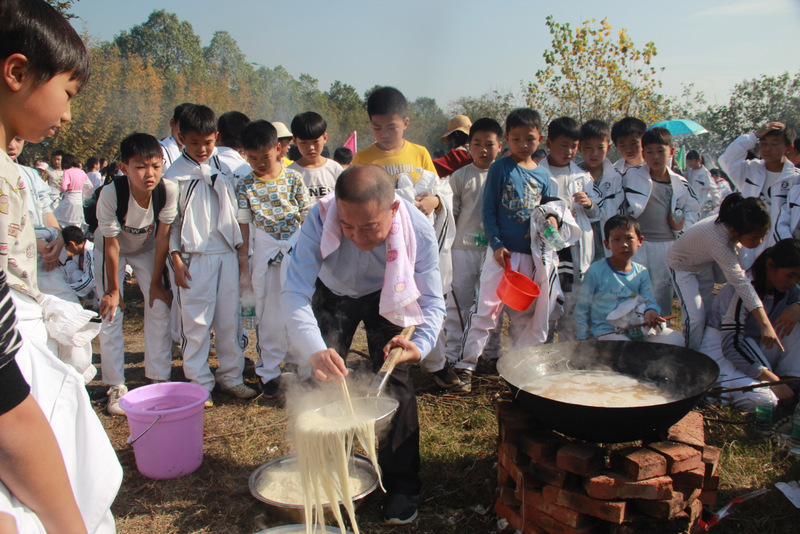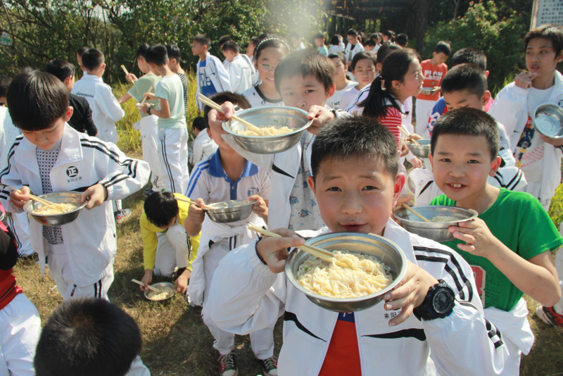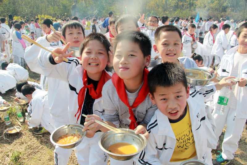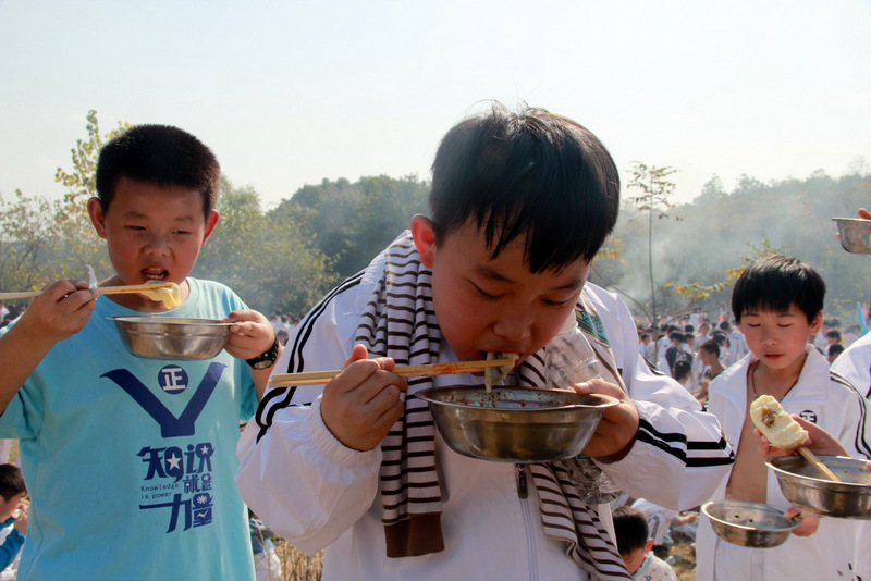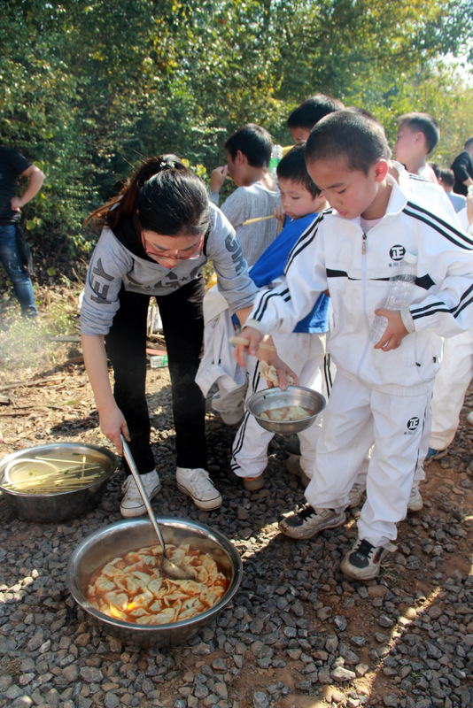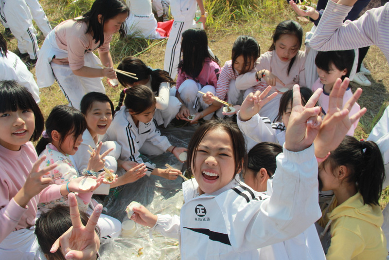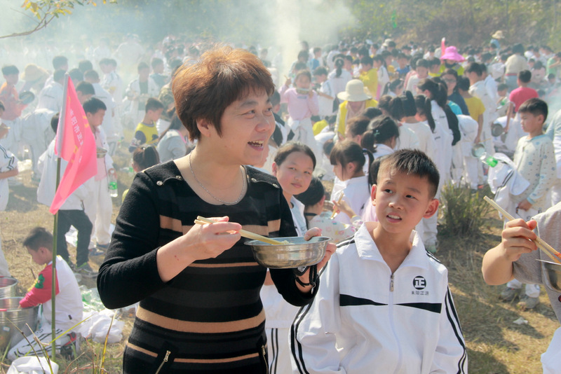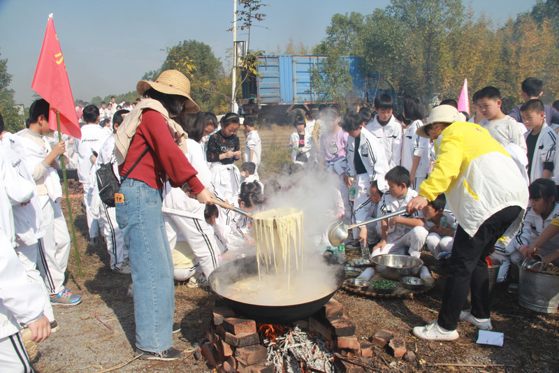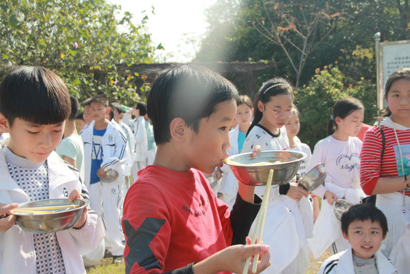 两个年级团结协作,事先做好了领物券。各班均预先就分好了组——炊具组、食材组、柴火组、供水组、包饺组、掌勺组、分餐组、文艺组、安保组、环保组……保障了野炊活动有条不紊。不一会儿,阵地里炊烟袅袅,炉火旺盛,热气腾腾,香味四溢!爽滑劲道的耒阳仁义面、形如元宝的猪肉香葱饺子一锅锅新鲜出炉,老师们组织学生排队有序打餐,孩子们津津有味地享受着自己的劳动成果,甭提多开心了!