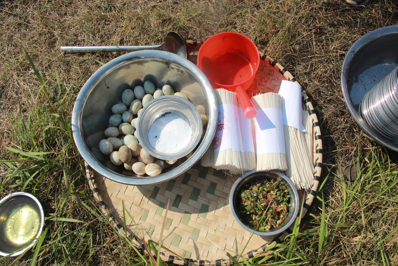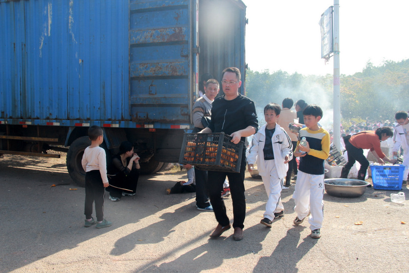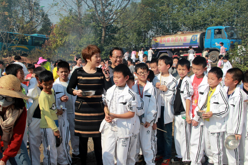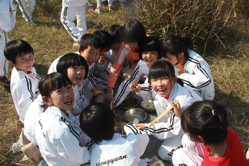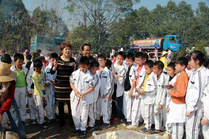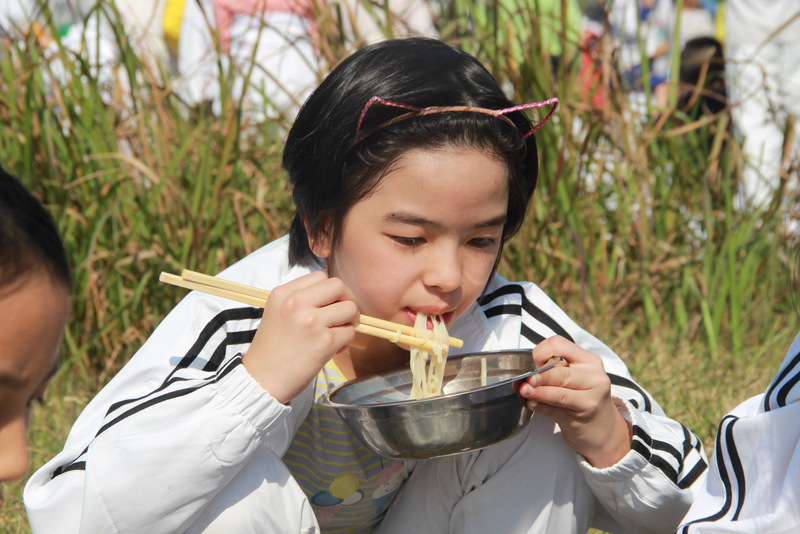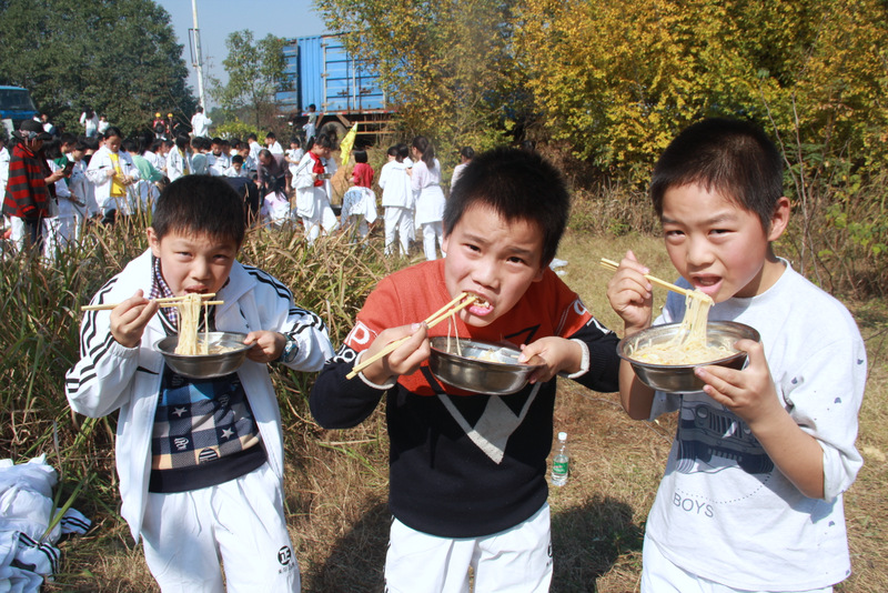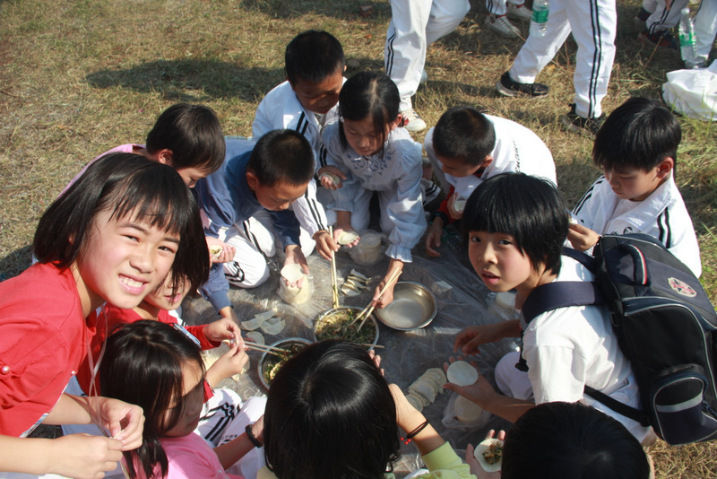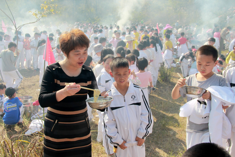 两个年级团结协作,事先做好了领物券。各班均预先就分好了组——炊具组、食材组、柴火组、供水组、包饺组、掌勺组、分餐组、文艺组、安保组、环保组……保障了野炊活动有条不紊。不一会儿,阵地里炊烟袅袅,炉火旺盛,热气腾腾,香味四溢!爽滑劲道的耒阳仁义面、形如元宝的猪肉香葱饺子一锅锅新鲜出炉,老师们组织学生排队有序打餐,孩子们津津有味地享受着自己的劳动成果,甭提多开心了!