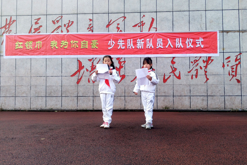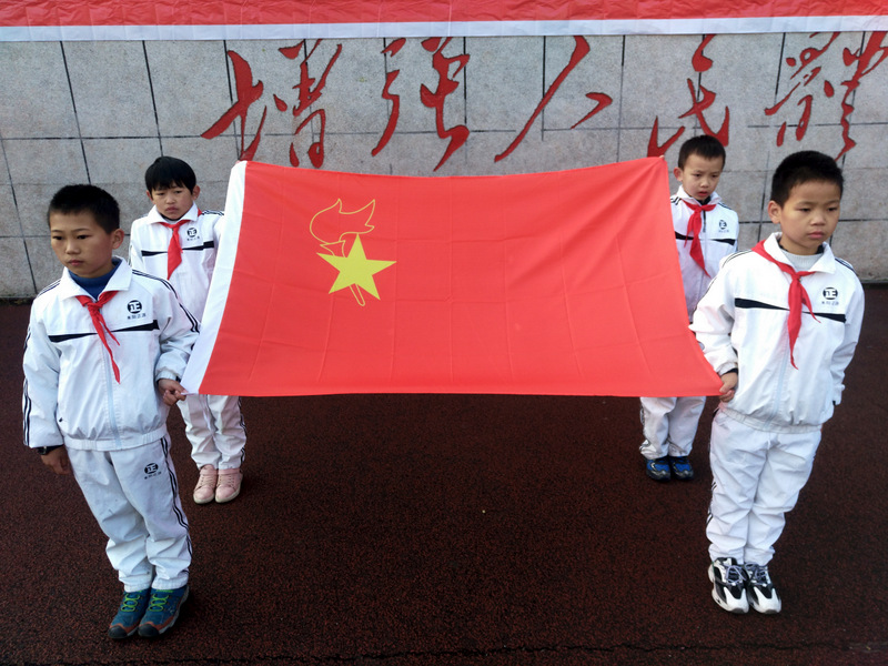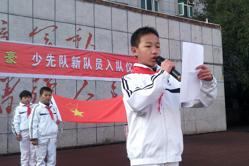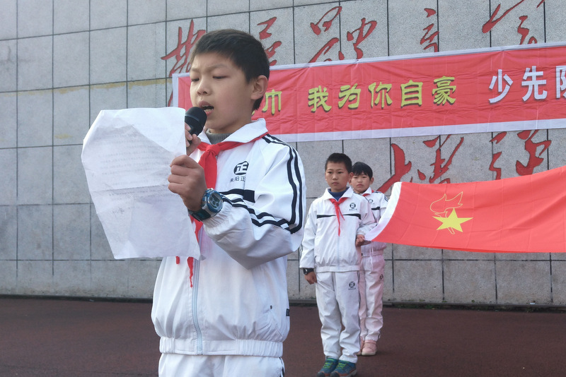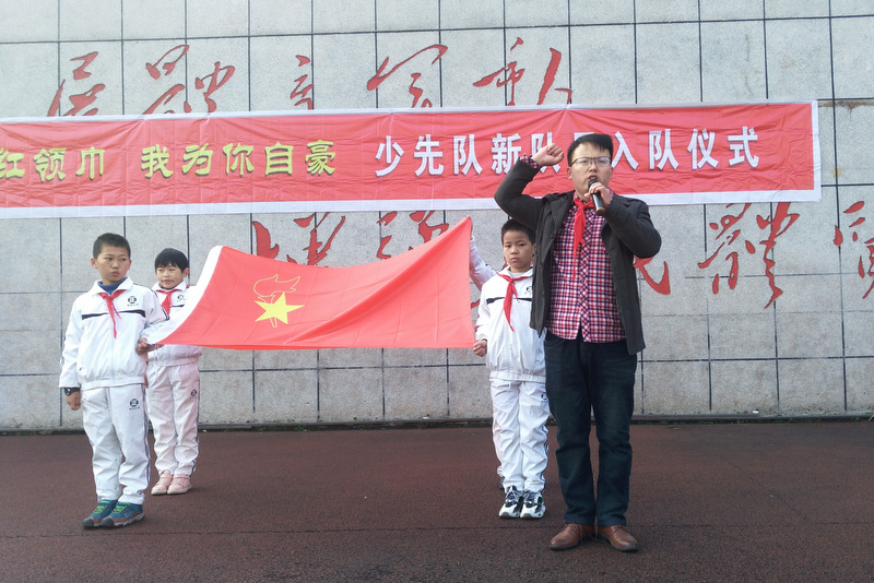 新队员们在少先队辅导员陈登盛主任带领下在队旗下庄严宣誓,表达出他们的共同心声——“为共产主义事业而奋斗,时刻准备着!”