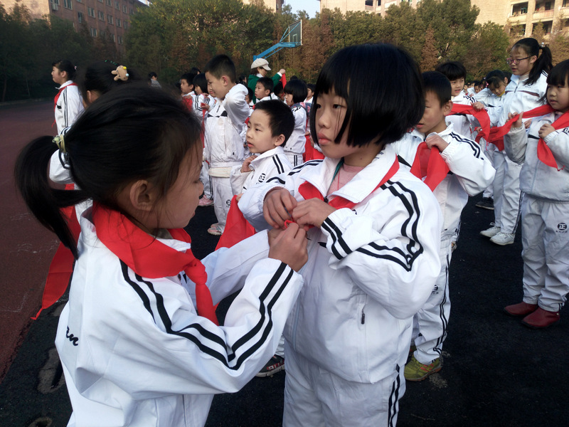 接着,在欢快喜庆的音乐声中,老队员们郑重地为新队员们系上鲜艳的红领巾。新队员们个个神采奕奕,与老队员互敬队礼,露出了骄傲而自豪的神情。
