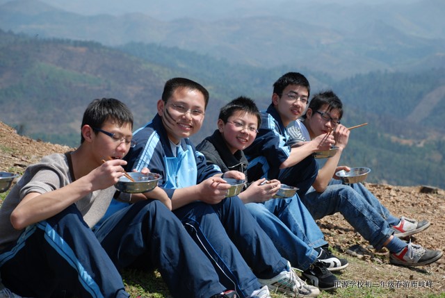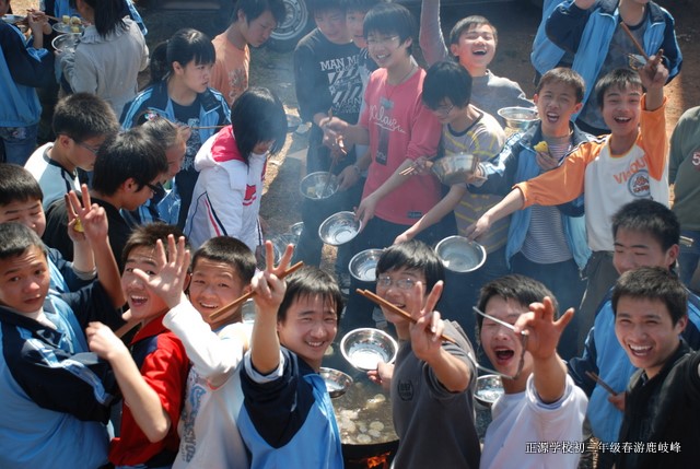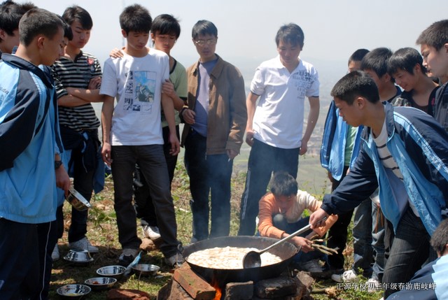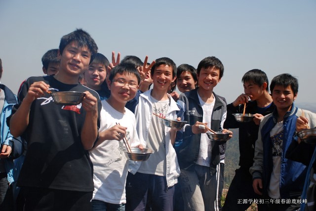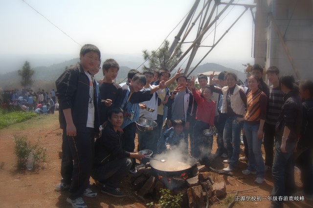 置身在春意盎然的绿野之中,感受着大自然的芬芳气息,同学们一个个精神抖擞,心旷神怡。大部分师生仅用两个小时就到达了目的地,最慢的用两点二十分也胜利到达。站在鹿岐峰顶,欣赏了四周景色之后,学们自己动手,拾柴垒灶搞野炊,有的包饺子,有的刨土豆、有的剥玉米,有的煮面条,个个笑逐颜开,倍添青春活力。同学们吃着自己亲手做的食物,格外开心。下午三点半钟,大家聚集在峰顶上合影留念。然后,排着整齐的队伍,又徒步返回学校。