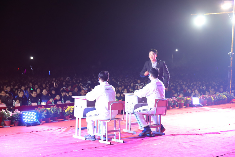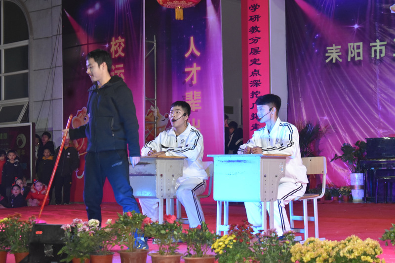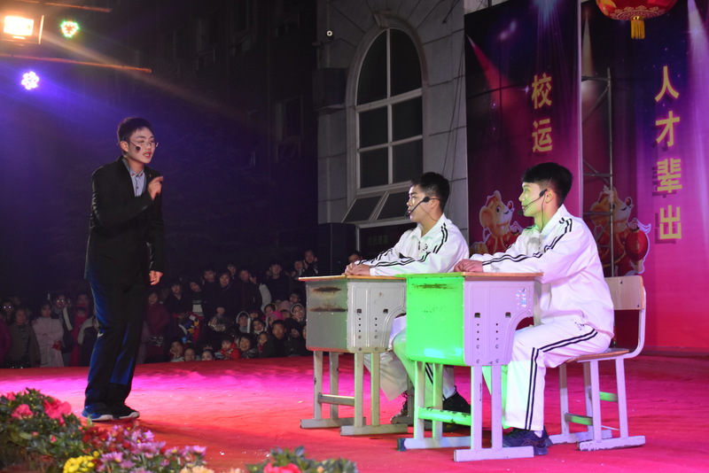 高二年级曹忠辉等同学表演的小品《上课了》,通过一个老师和一个优秀生、一个差生的提问和作答,幽默风趣,让人捧腹。