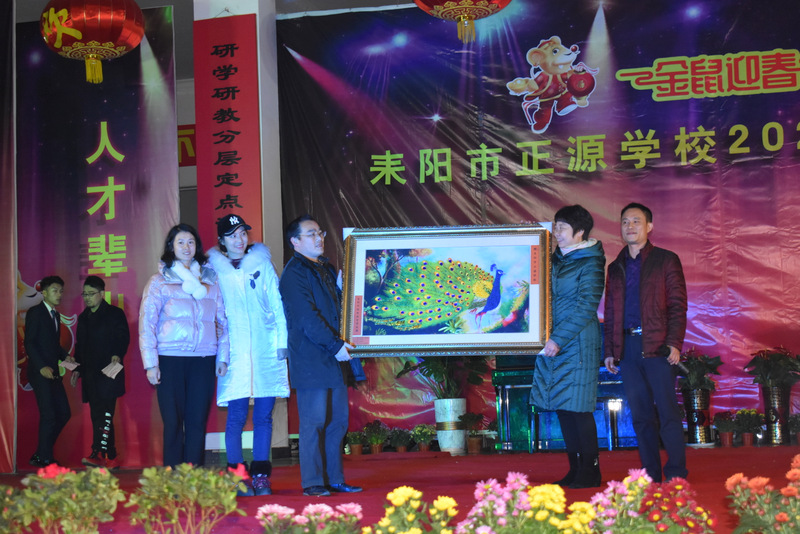 耒阳市特殊教育学校校长许光明代表全校师生向正源学校赠送同学们自己刺绣的手工艺品“富贵吉祥”孔雀开屏匾牌。许校长说:没有爱,就没有教育;没有大爱,就没有特殊教育。衷心感谢这么多年来,正源学校给予耒阳市特殊教育学校的大爱!的确,正源学校每天为市特殊学校师生赠送去米粉和猪肉,让同学们吃在嘴里,暖在心头,对正源学校的感激之情无以言表。