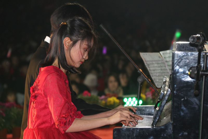 从小学部,到高中部,二十几名红衣少女的古筝合奏,琴韵悠扬。陆美美、肖羽玲等三十多名学生的笛子合奏欢快婉转。
