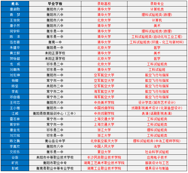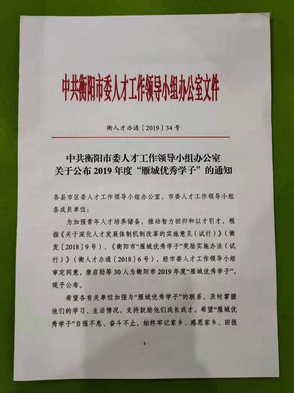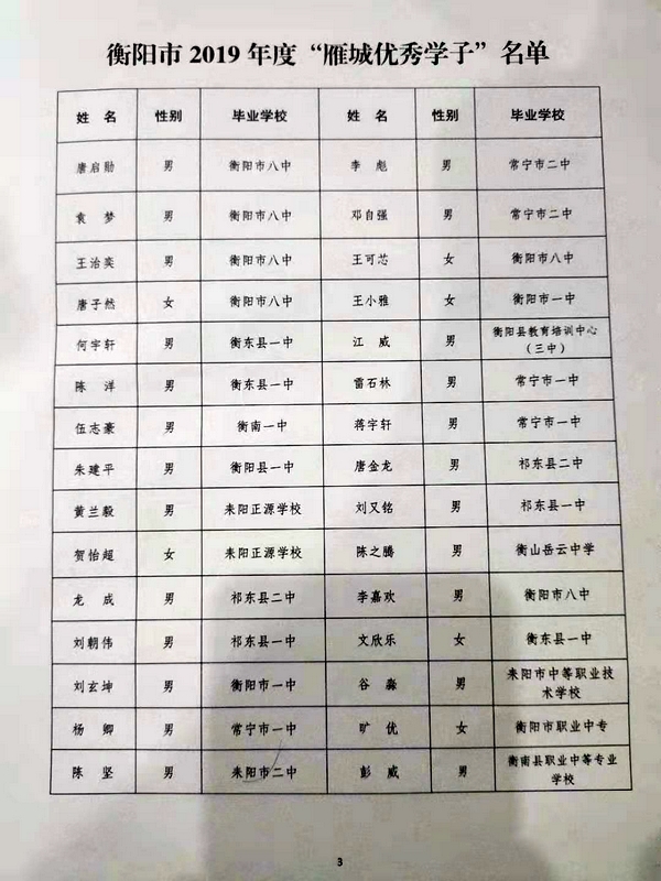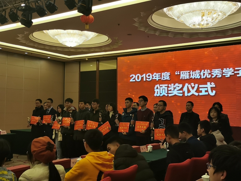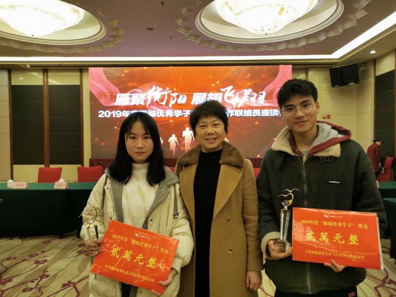1月20日上午,衡阳市“2019年度雁城优秀学子暨人才工作联络员座谈会”召开。30名雁城优秀学子及毕业学校校长参会,衡阳市委、市政府、市教育局、团市委等相关领导,以及50名人才工作联络员出席了会议。会议由龚学余副市长主持,市委常委、组织部长胡绪阳、市教育局局长程少平、蒋勋伟副部长等领导做了重要讲话。依据《衡阳市“雁城优秀学子”奖励实施办法(试行)》,经过严格的筛选,我校黄兰毅、贺怡超同学被评选为“雁城优秀学子”。衡阳市委人才工作领导小组给予每人2万元奖励,并颁发了“雁城优秀学子”奖杯。这不仅是对我们优秀学子勤奋努力的肯定,也是对学校,对我们教育工作者辛勤育人的肯定。2019年,黄兰毅同学以全省美术联考排名第三,高考理科568分的成绩被清华大学设计学专业录取;贺怡超同学以高考理科668分的高分被北京大学医学部录取。