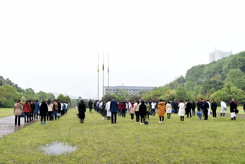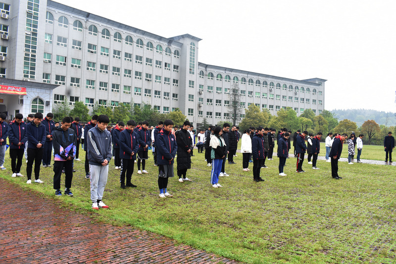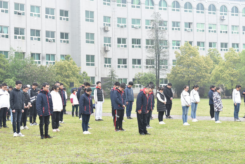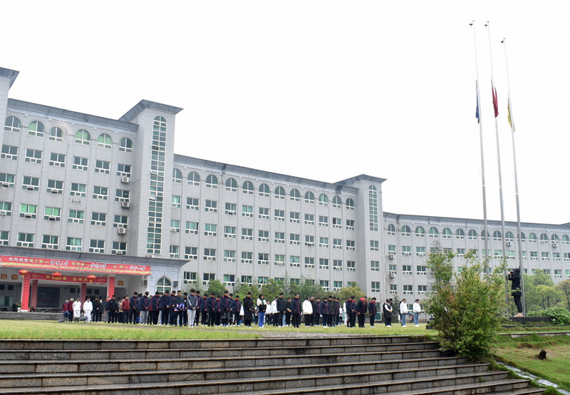 细雨霏霏,冷气飕飕。学校早已降下半旗,在学校党支部书记毛小波等领导带领下,一百八十余位师生员工默哀三分钟。