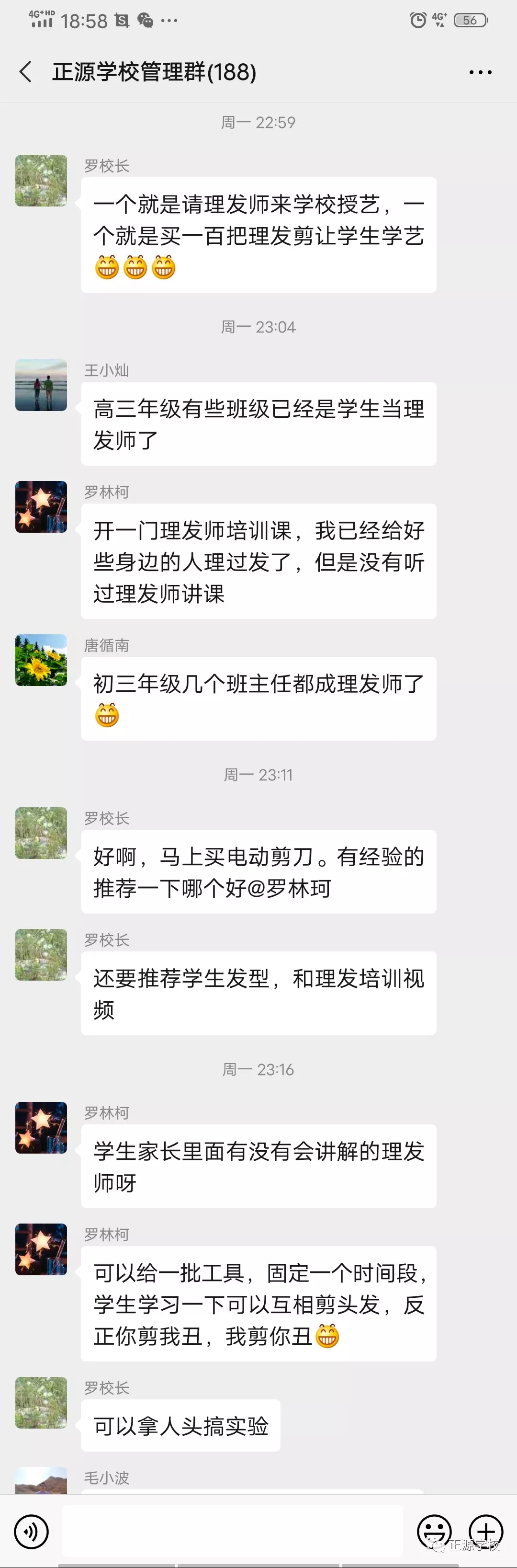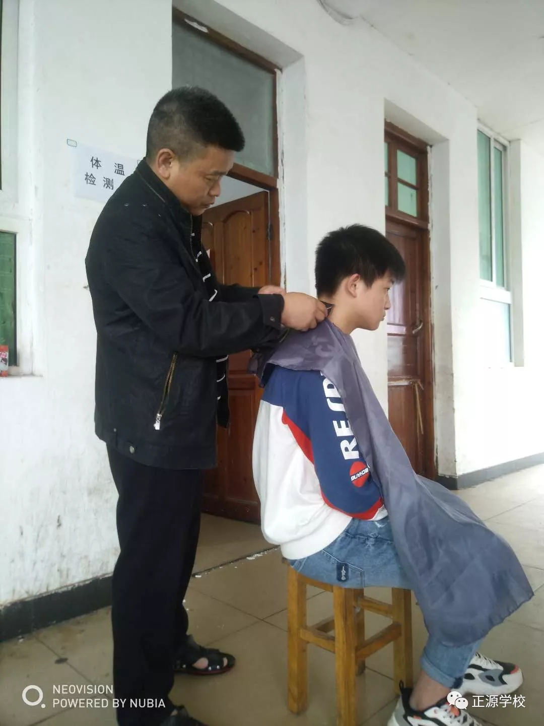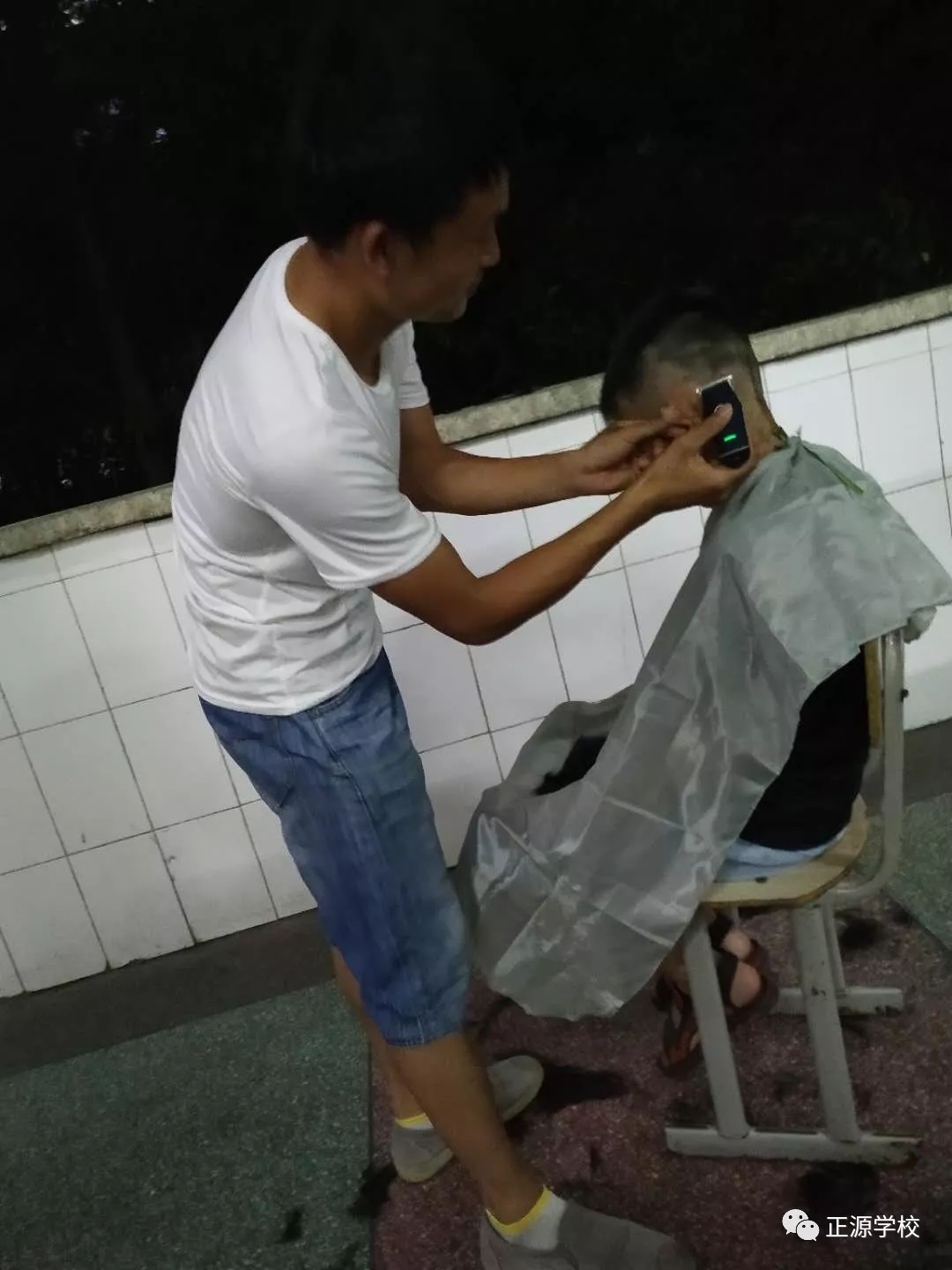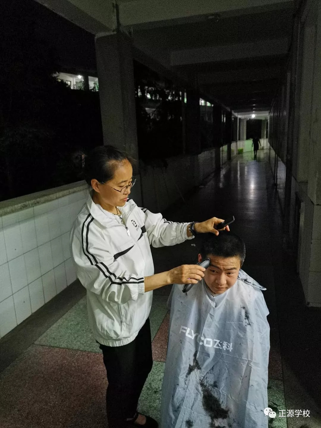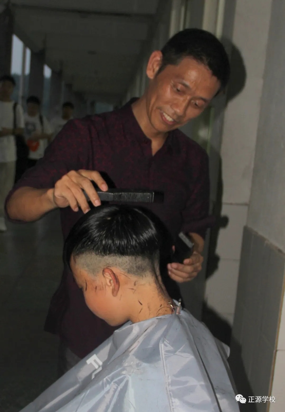 在正源校园里,这样的“便民服务站”多处可见,有年级把理发的场所设在老师办公室,同学需要理发,利用课余或者自习时间,走进办公室就可以解决。有年级把理发场所设立走廊上、教室门口等,理发师有学生也有老师,怎么方便怎么剪,没有限制,没有要求。罗校长在学校管理群里指示,为解决学生理发的问题,准备请一个理发师在学校授艺,购买来理发工具,给同学们学艺。现学校已向人社局申请美发师来校传授技艺。