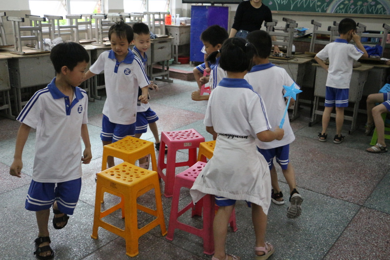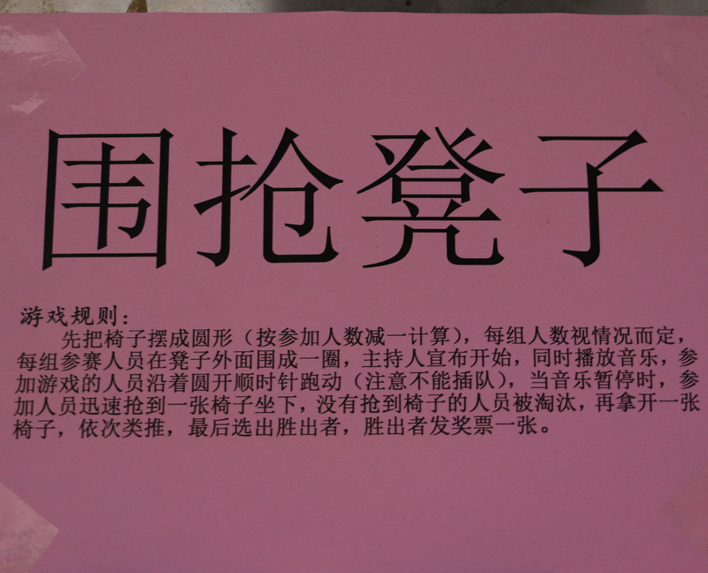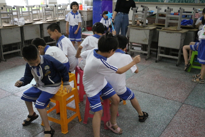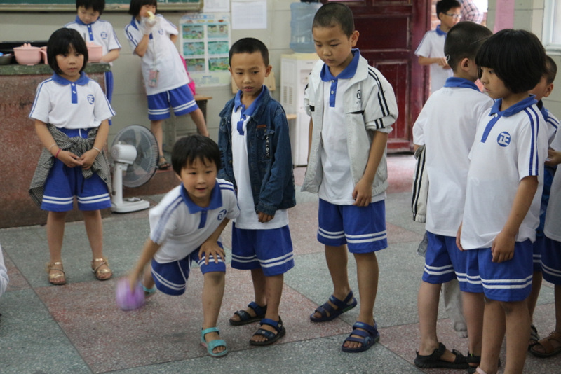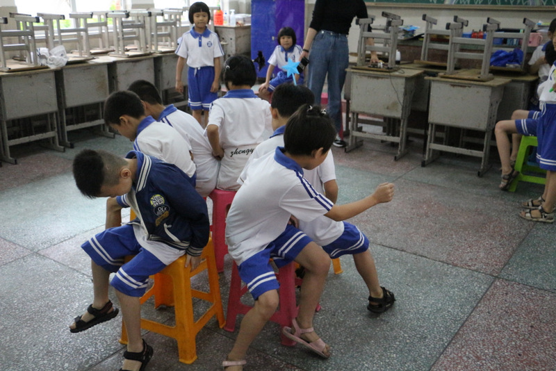 接着来到了围抢椅子区(354班),教室中间五张椅子紧挨着摆放,文慧明,蒋继谦等五名同学已经站好位置,体育老师何笃员童心未泯也加入了孩子们的抢椅子大战。他们围着椅子随着音乐转圈,音乐一停就抢座椅子,谢佳杭稍有分神,未能抢到椅子,一屁股坐在一个女生的腿上,那个女生急忙推开他,就这样第一个淘汰出局。音乐忽起忽停,椅子越转越少,最后只剩下了何老师和一名女生PK,体育老师反应敏捷,技高一筹,抢到了最后一把椅子,满载而归。一组完成,一组又起,奖票不完,转圈不息。355班是夹玻璃珠,只见几位同学均手持筷子,聚精会神地盯着玻璃球,可是筷子才刚碰到珠子,珠子就滚到了旁边,要想夹起一颗珠子还真不容易,真是小物件大本领呀!