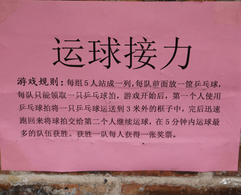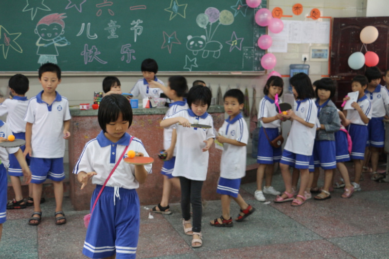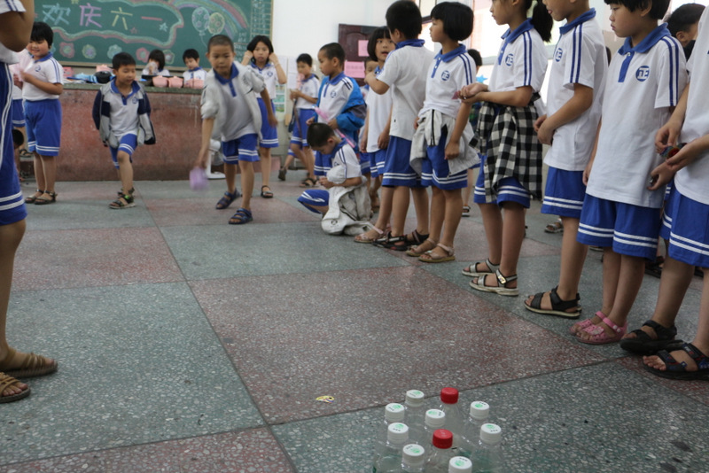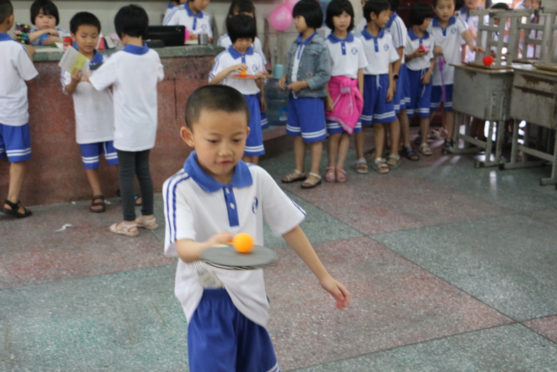 此时此刻,我已经被现场热烈的气氛深深感染,更有一群天真烂漫的孩子拉扯着我和他们一起玩游戏,我就这样被他们裹挟着,伴随欢乐的人群来到了350班。教室里早已是人声鼎沸。近前一看,原来他们在玩投乒乓球。瞧,356班的吴昊右手紧握乒乓球,躬身注视着前方的黄桶,然后将球高高举起,顺势将球抛向黄桶,乒乓一声,小球撞到了桶沿,弹到了地上。但吴昊毫不气馁,一球未进,一球又起,只见黄色的小球在空中划了一道完美的抛物线,准确地落入桶中,现场立时响起了热烈的掌声。351班是运球接力,未进其门,已先闻其声,进门就见357班的黄依欢右手平托乒乓球拍,白色的小球在上面滚来滚去,她目不转睛地盯着小球,小心翼翼地移动步伐,马上就要到达终点,可不知怎么回事,突然小球就滚落下来,眼看到手的奖票就这样飞了,真叫人惋惜。接着上场的是356班的夏忝金,他轻托球拍,目光坚定,上身一动不动,步履稳如铜钟,轻轻松松就绕了椅子一圈,顺利抵达终点,真是强中更有强中手,一山更比一山高。353班是投保龄球,教室的一端10个矿泉水瓶摆成了三角形,,另一端有个同学手持大球正在瞄准,然后弯腰出球,球飞快地滚到水瓶上,10个水瓶应声倒下,一轮游戏就此完成。旁边的许多同学见水瓶全倒,都不约而同地热烈鼓掌,并且学着他的方法上场击球。
