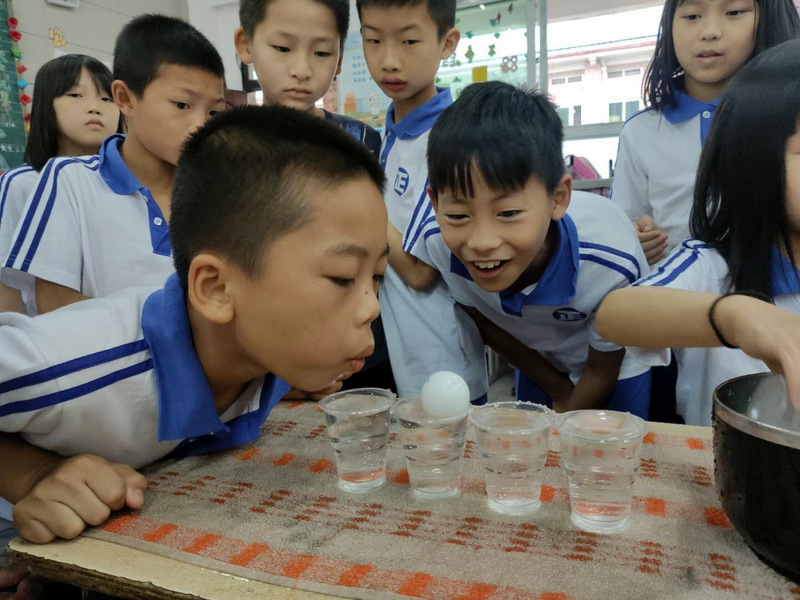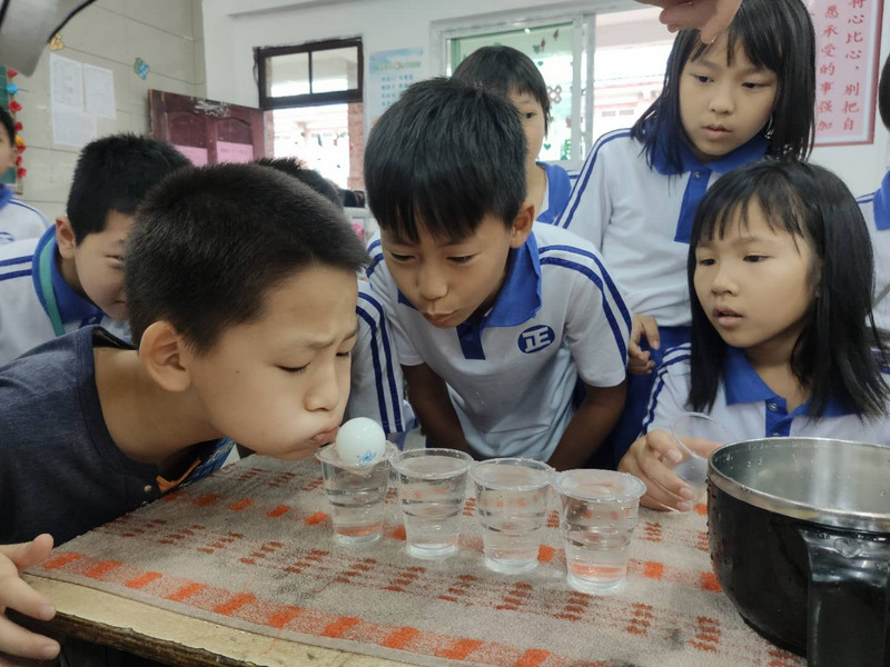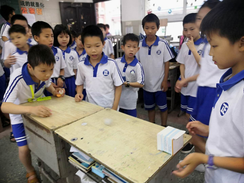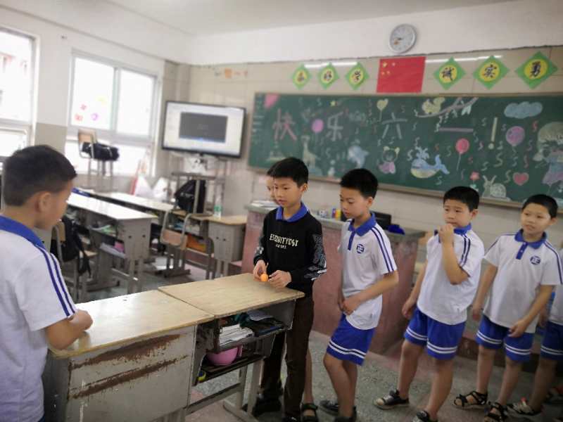 吹乒乓球:孩子们鼓着腮帮,对着杯子里的乒乓球,使劲吹,那不可一世的乒乓球受不了这么大的力,要么,被吹出去,滚落地上,要么,水面受不了,兴起狂风大浪表示抗议,孩子们能够吸取教训,用力均匀,才使得乒乓球依次老老实实地落入下一个杯子。