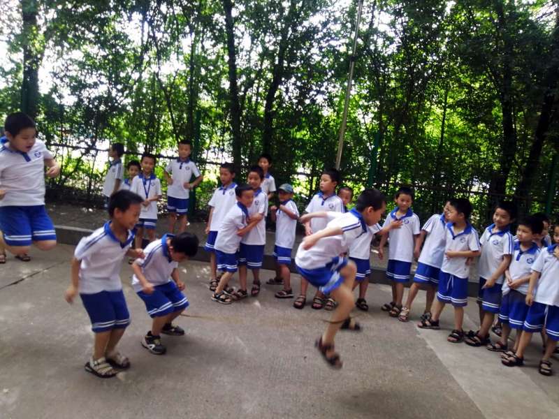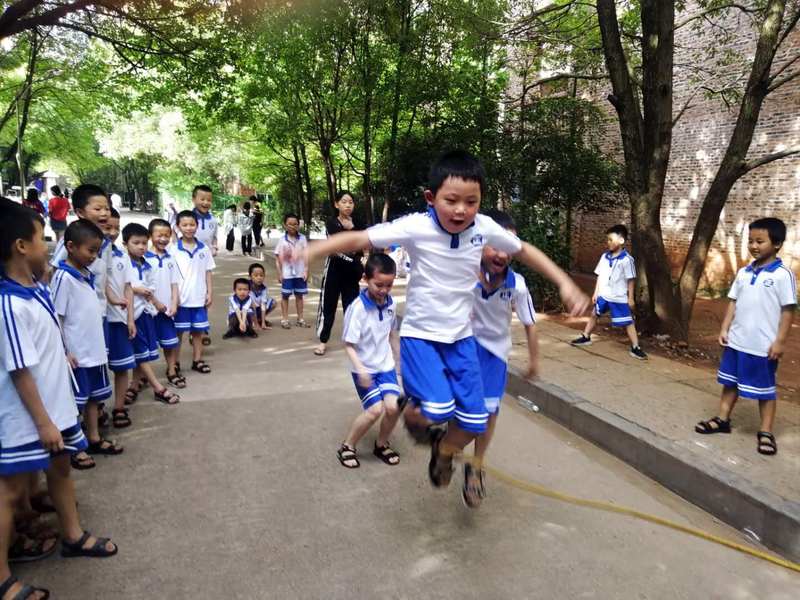 而另外正在跳长绳的同学们也不甘落后,只见甩绳子的两个人抓着绳子的两头,中间并排站着两三个同学,一起喊着一,二,三就开始跳了起来,只要有同学没有跳过去,就立马会有新的同学补上继续。路过的高一的同学们也感受到这种愉快的氛围,和我们的小朋友们一起玩了起来,而我们的同学们也丝毫不怯场,和我们的哥哥姐姐们玩成一片,有的甚至还学着哥哥姐姐们自由进出。你看358班的熊开卿同学一次性就可以跳很多个,两边的同学也一直为他加油呐喊;再看资睿同学,在两个大哥哥的中间也一直都是稳稳的,不输他们半点。特别是353班的梁丕同学,别看他的体型看起来胖胖的,但是跳绳的时候可灵活了,就像脚底装上了弹簧一样,一跳一个准,惹得其他同学不停的为他欢呼。