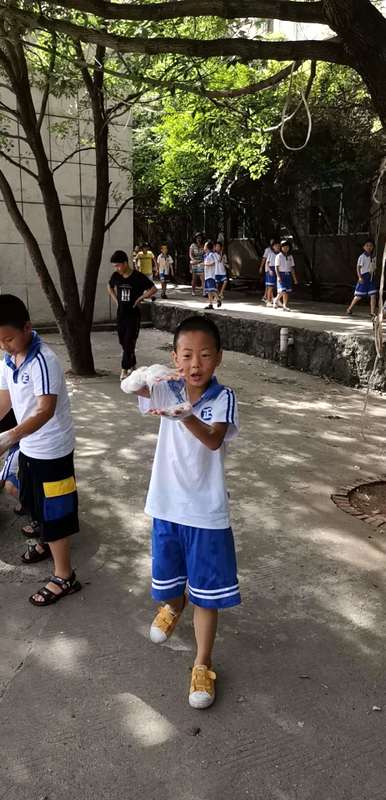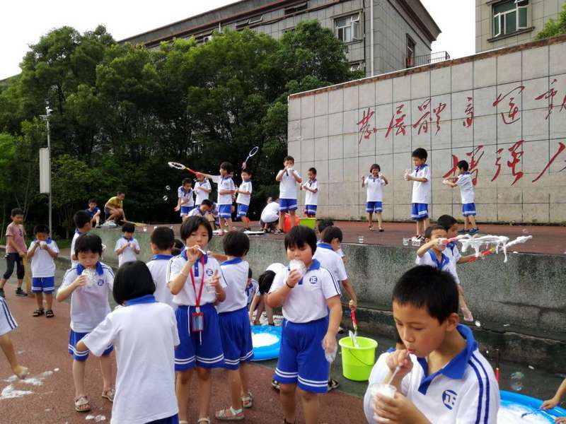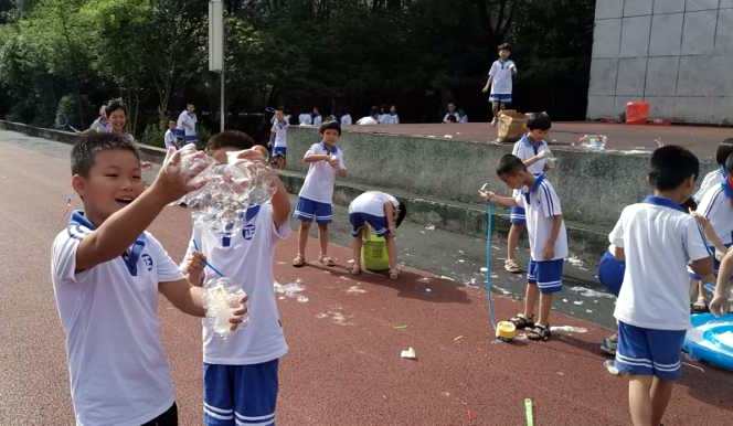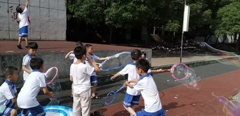 七彩的泡泡晶莹透亮,似乎天生就对小朋友们有一种无穷的魔力。刚一到泡泡游戏区,小朋友们就像离弦的箭一样冲了出去,拿起地面上各式的吹泡泡工具尽情地玩了起来。刚开始的时候还没有掌握方法,泡泡吹得很小,甚至还有同学把泡泡沾到了脸上,就像长了一个大包,惹得孩子们一阵哄笑。不过,同学们真是冰雪聪明,无师自通,才玩了一会就掌握了大圈圈吹泡泡的诀窍,泡泡越吹越多,越吹越大,漫天飞舞,是那么圆润,那么自由,在太阳的照射下闪闪发亮,光彩夺目,美不胜收!没有拿到工具的同学开始的时候只是追着泡泡玩,可是这些泡泡好像在逗同学们玩,同学追得越快它就飞得越高,有些同学小手刚要碰着泡泡,可它们却四散纷飞,消失的无影无踪。后来同学们也不追了,干脆直接用手拢成圆圈就开始自己吹起了泡泡,有的同学甚至摇身一变就成了一个头发花白的老爷爷。所有的同学们都玩的不亦乐乎,每个人都兴奋的跑过来和班主任分享自己的快乐,这时我们的班主任也忍不住的开始和孩子们一起玩了起来,整个场地变成了泡泡的海洋。