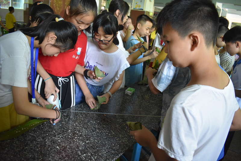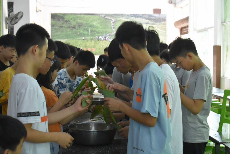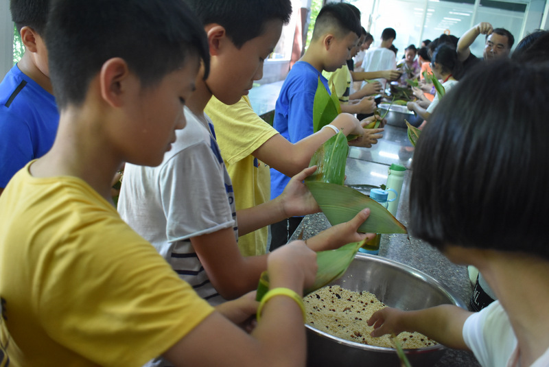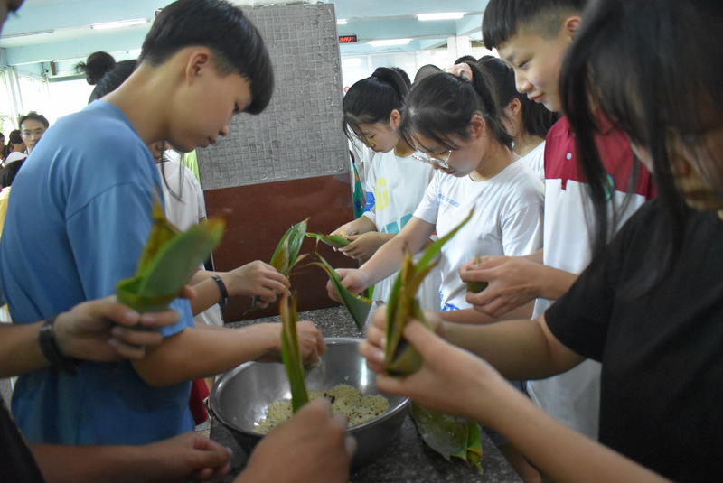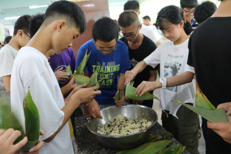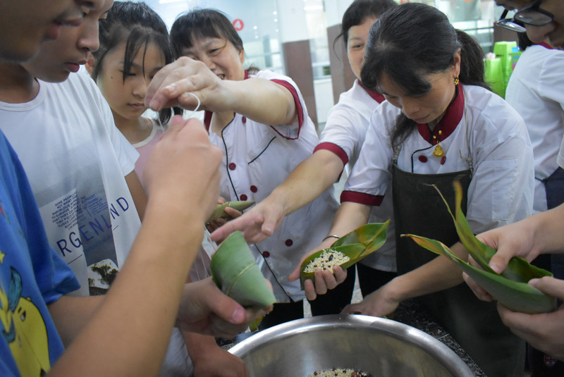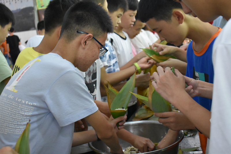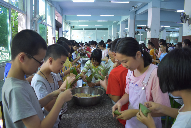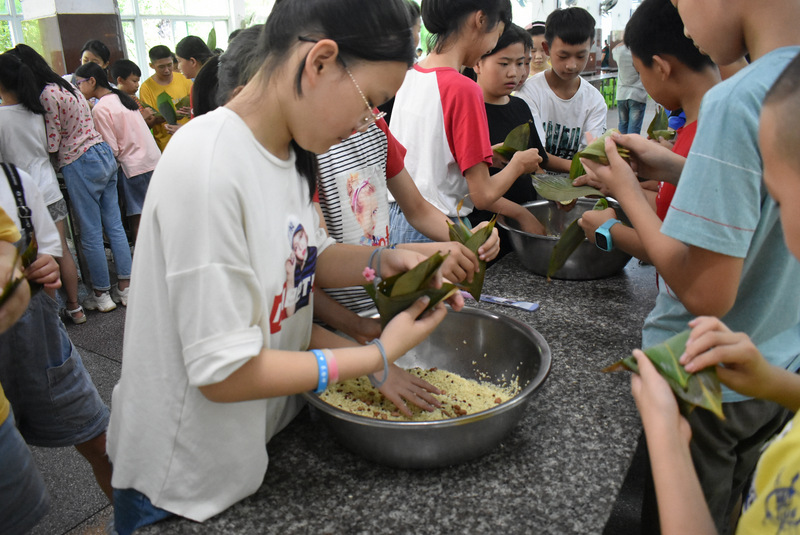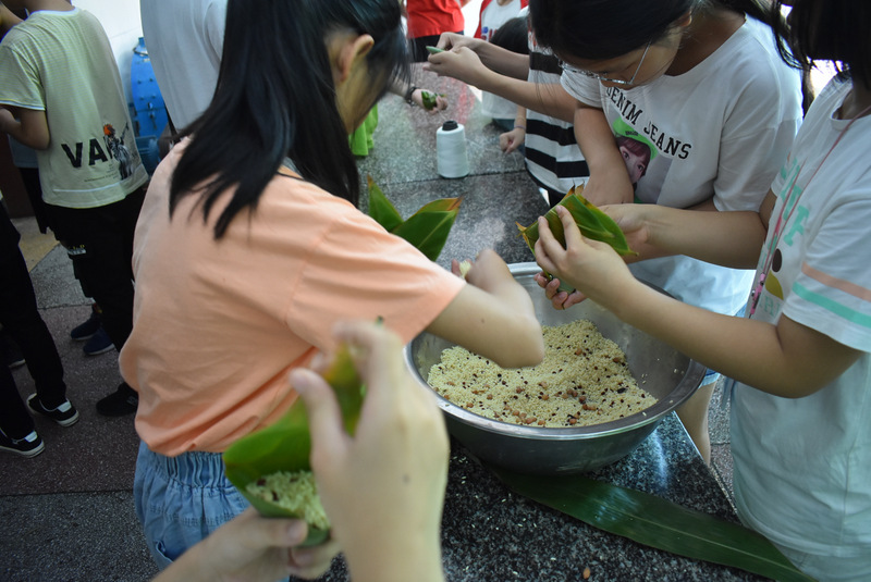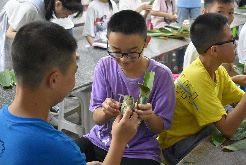 开课第一天,准初一、初一年级的孩子们在就餐食堂,沿餐桌而立,桌子上摆好了包粽子所需食材,粽叶、糯米、红枣、葡萄干、红豆等。在食堂阿姨的指导下,同学们迅速进入状态,选两三片粽叶,折叠成漏斗形状,在漏斗中放糯米、红枣等食材,折叠粽叶包住糯米,用细线缠绕几圈,一个漂亮的粽子就这么包好了。