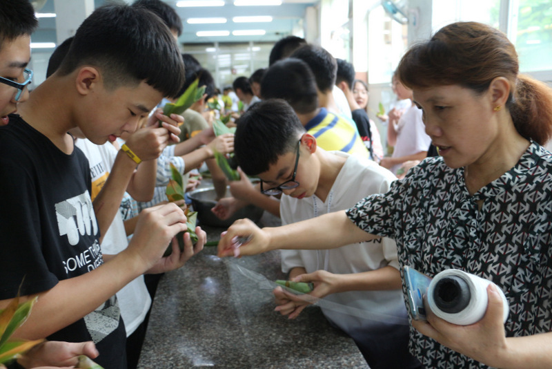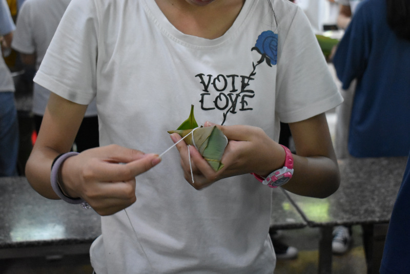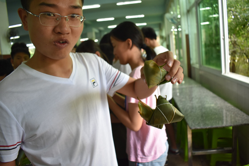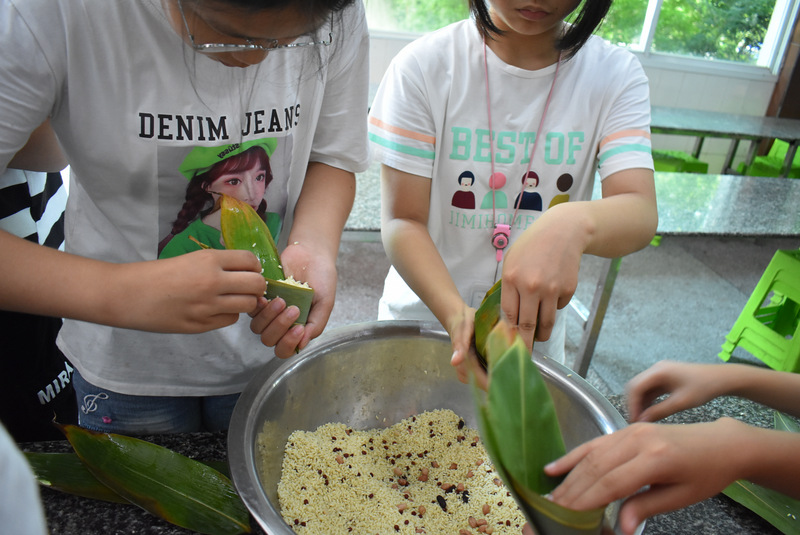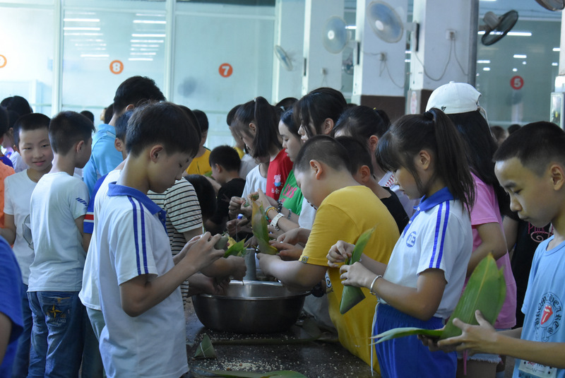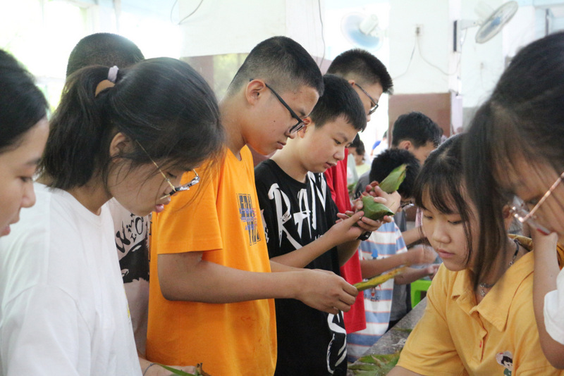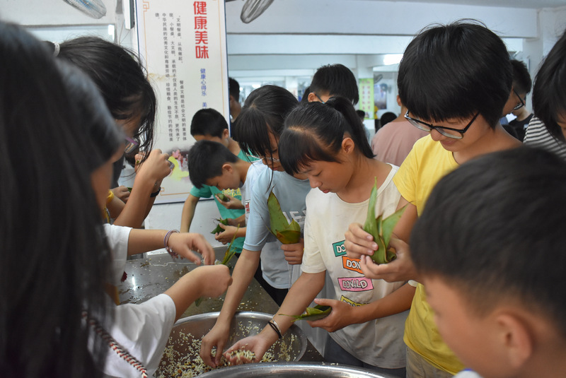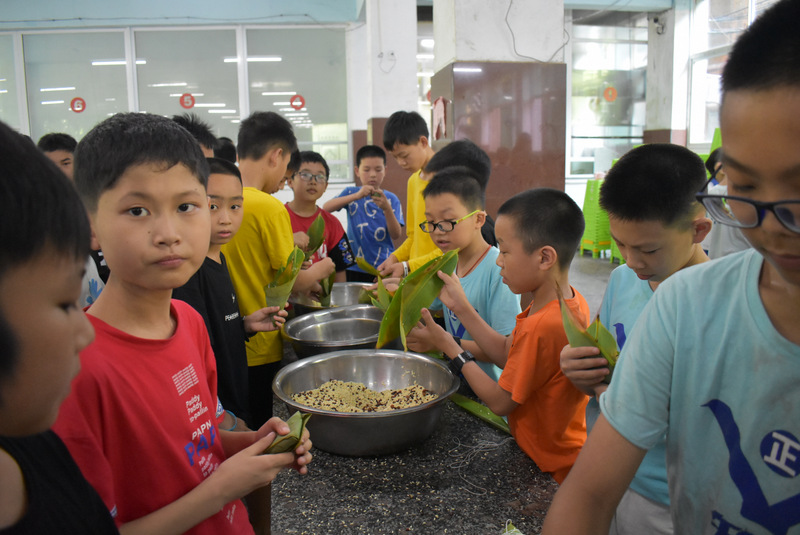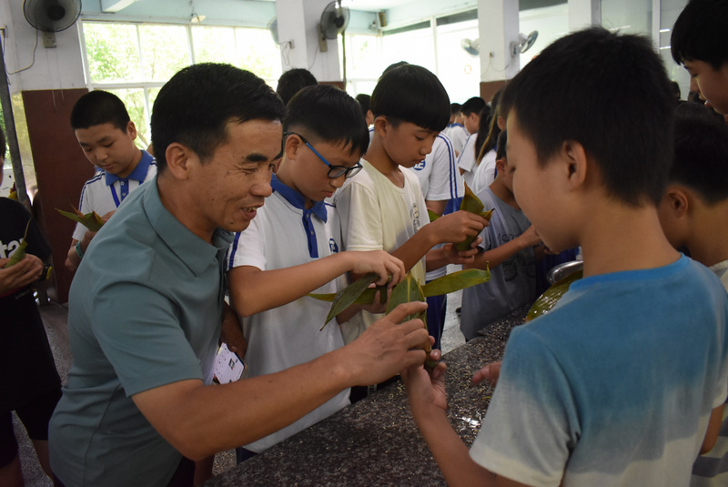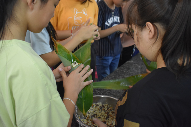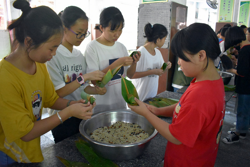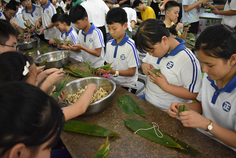 开课第一天,准初一、初一年级的孩子们在就餐食堂,沿餐桌而立,桌子上摆好了包粽子所需食材,粽叶、糯米、红枣、葡萄干、红豆等。在食堂阿姨的指导下,同学们迅速进入状态,选两三片粽叶,折叠成漏斗形状,在漏斗中放糯米、红枣等食材,折叠粽叶包住糯米,用细线缠绕几圈,一个漂亮的粽子就这么包好了。