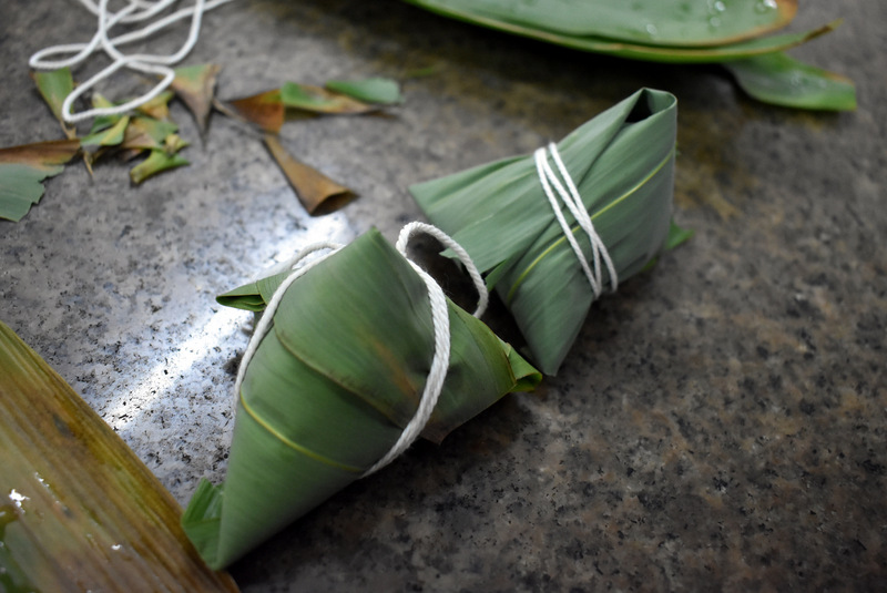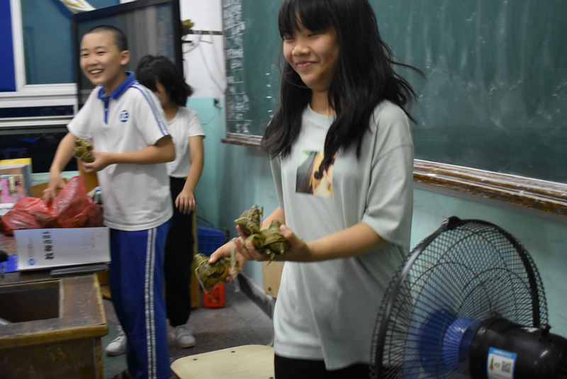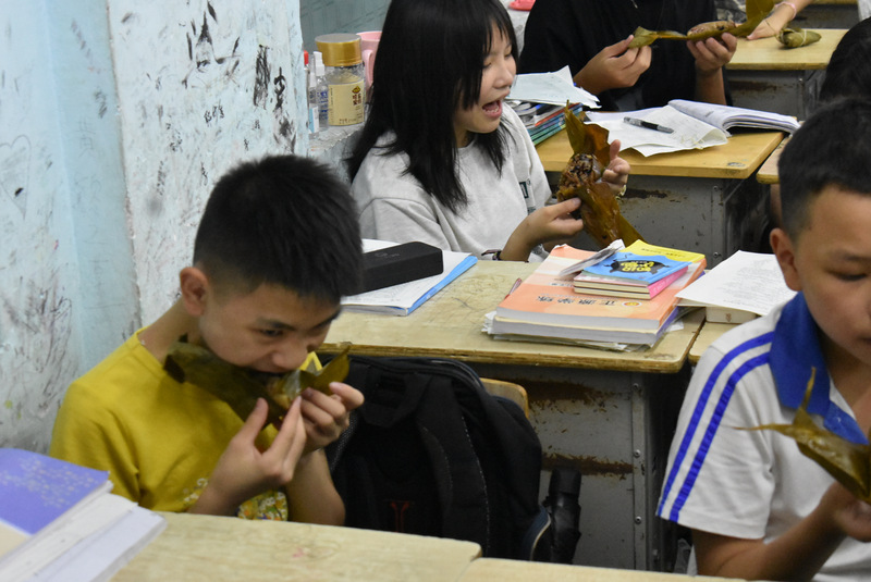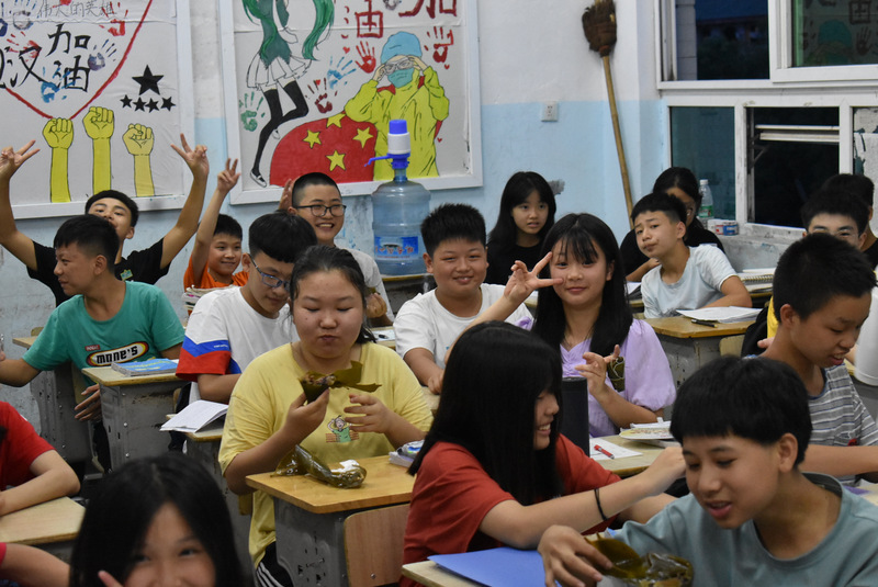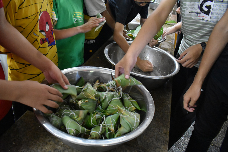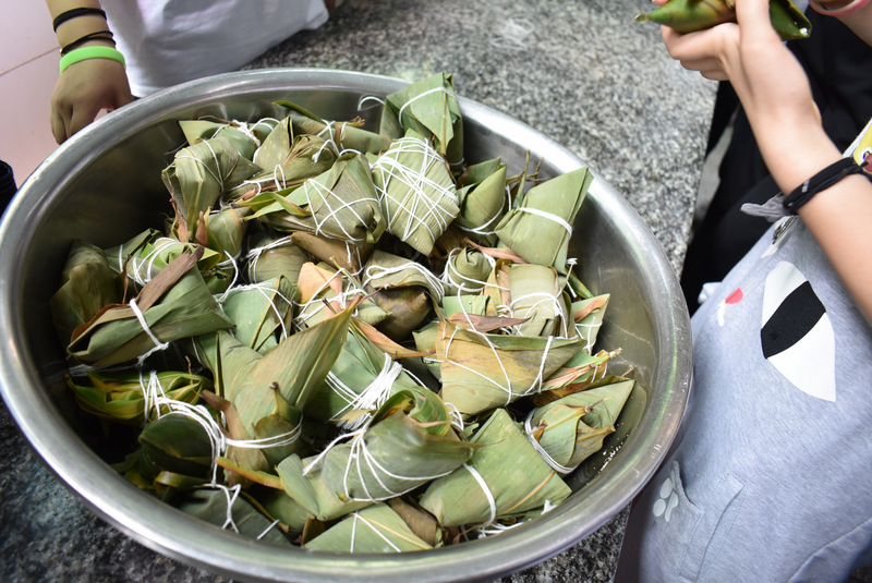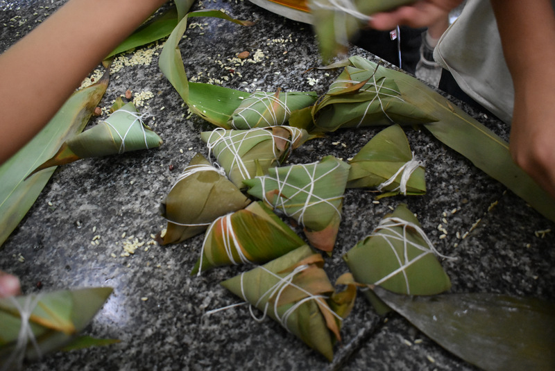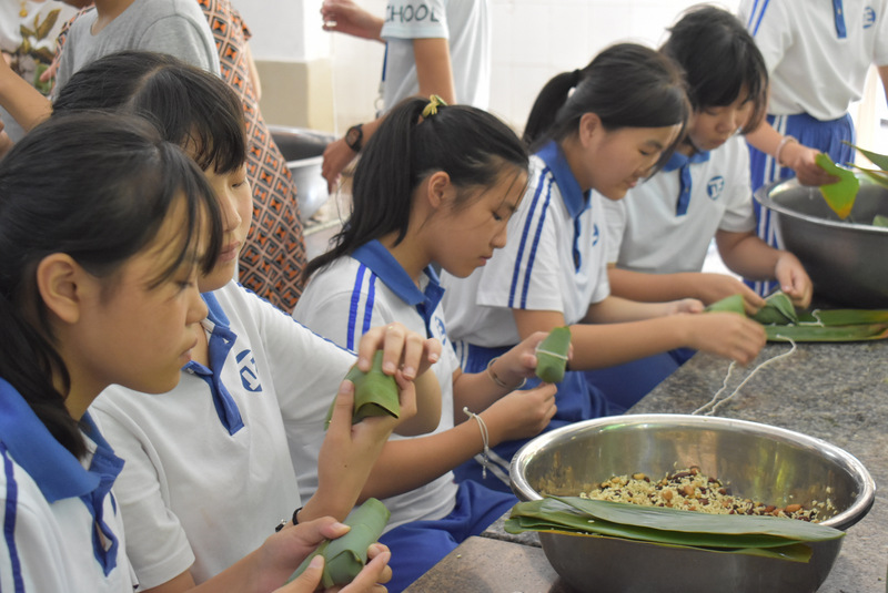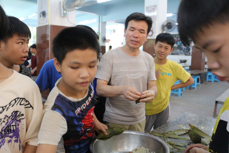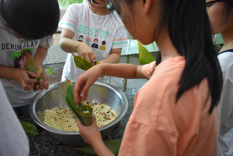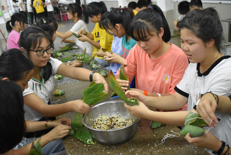 开课第一天,准初一、初一年级的孩子们在就餐食堂,沿餐桌而立,桌子上摆好了包粽子所需食材,粽叶、糯米、红枣、葡萄干、红豆等。在食堂阿姨的指导下,同学们迅速进入状态,选两三片粽叶,折叠成漏斗形状,在漏斗中放糯米、红枣等食材,折叠粽叶包住糯米,用细线缠绕几圈,一个漂亮的粽子就这么包好了。
