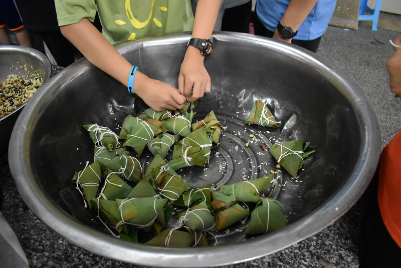 记者在现场发现,三天下来,各个年级包好的粽子形状多样,让人大开眼界。有标准尖角棕、有粗壮的四角粽,有害怕粽子煮跑了的五花大绑粽、有长条粽等等,花样百出,各具特色。