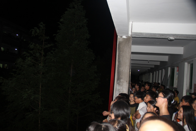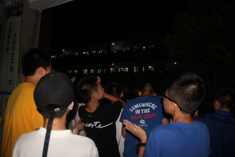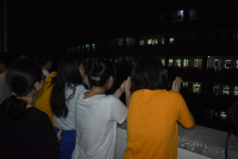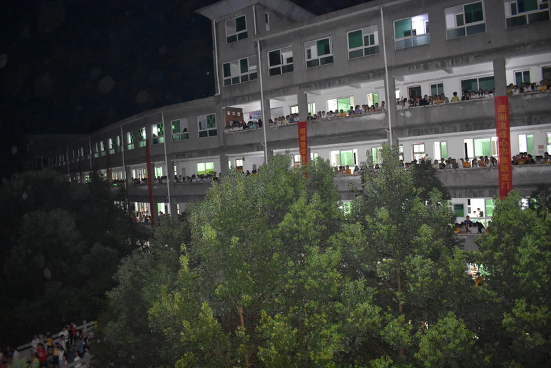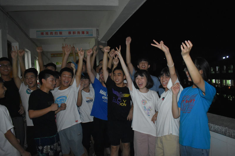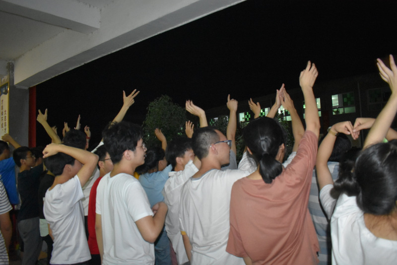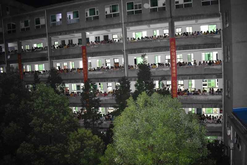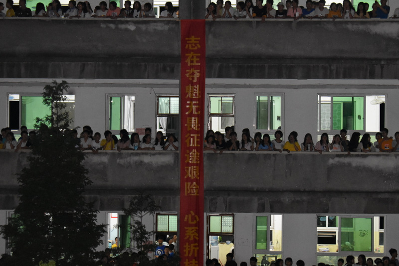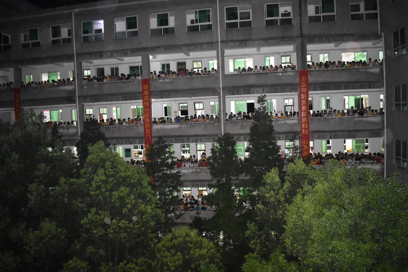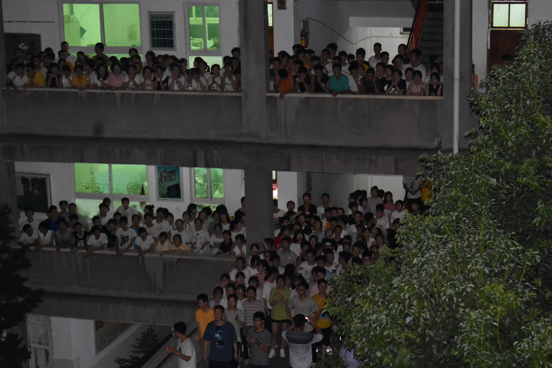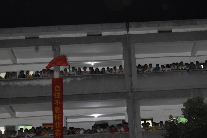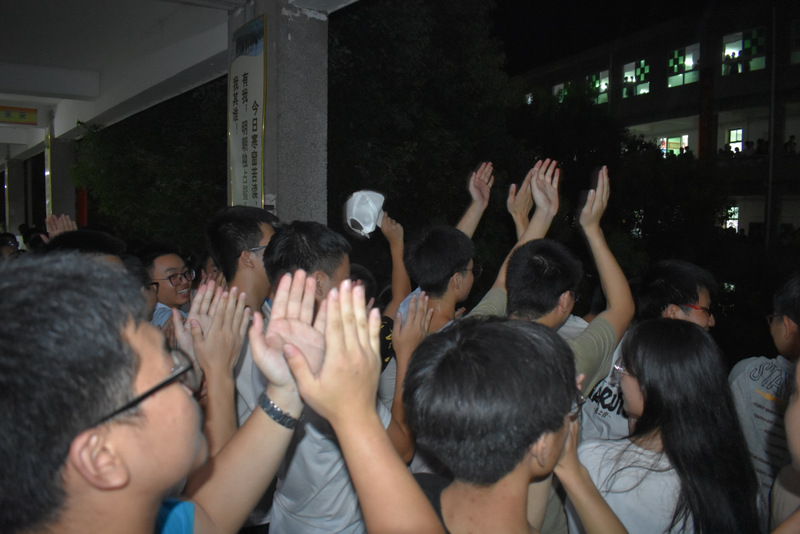7月6日晚8:20,第一节晚自习结束后,前栋教学楼高二年级走廊上传出清脆的喊声“高三加油,学长加油!”。一石激起千层浪,一瞬间,教学楼走廊上的人越来越多,声音越来越洪亮,准初一、初二的同学也为学长呐喊助威!“天王盖地虎,全上985!宝塔镇河妖,全上211!”记者站在教学楼中间的通道上,一浪高过一浪的呼喊,让人血脉喷张,激情四射,呼喊声、歌声、掌声交响成乐,响彻青麓山,经久不息。