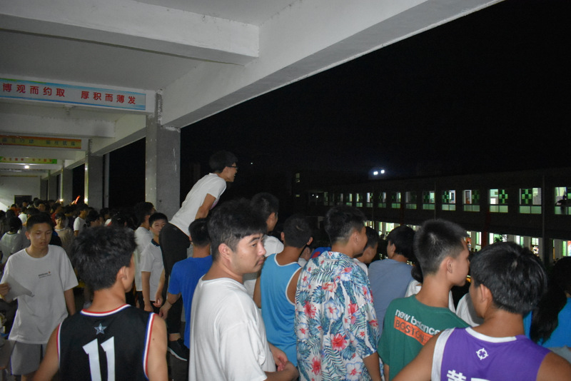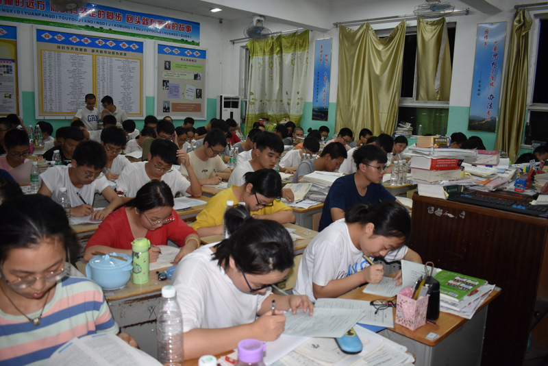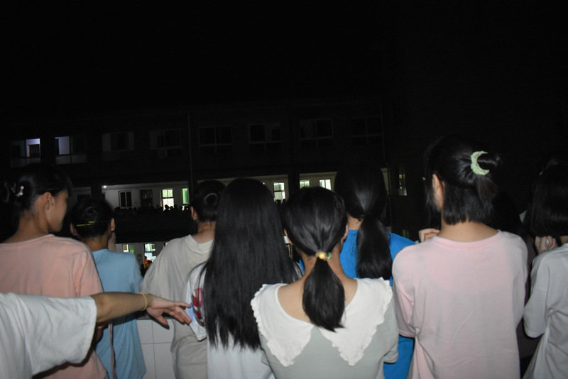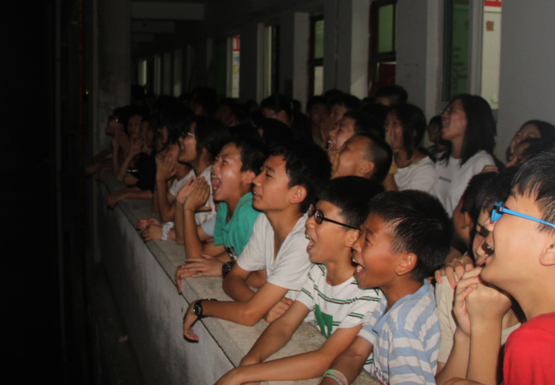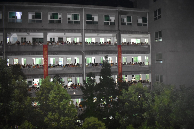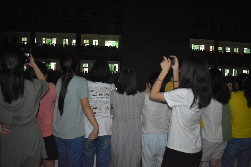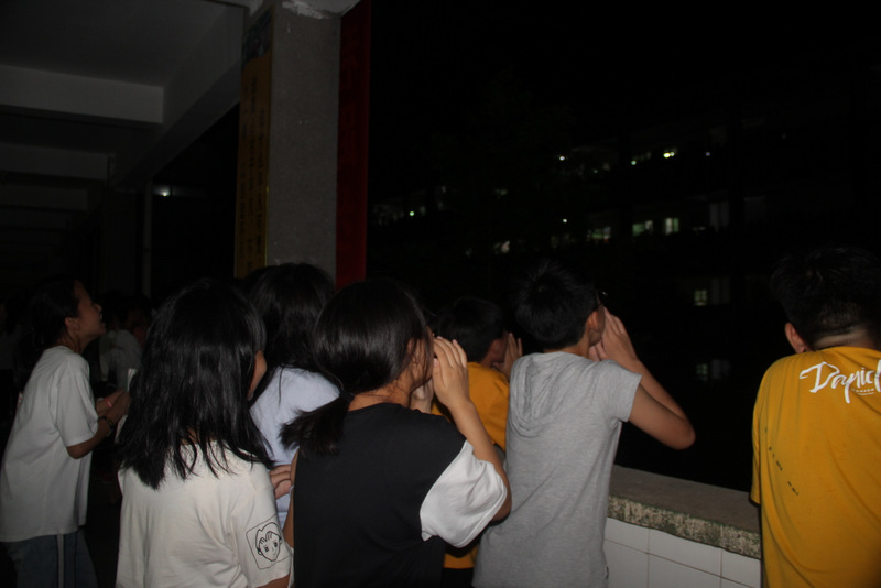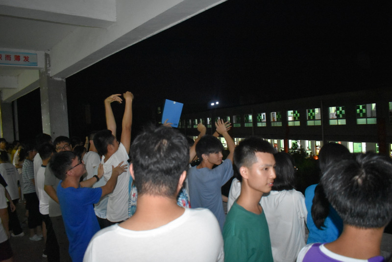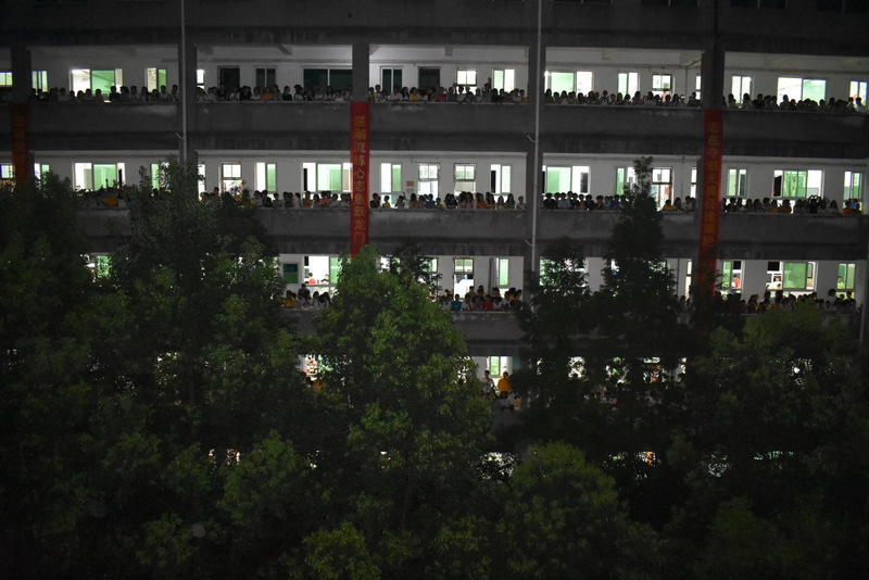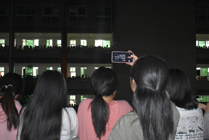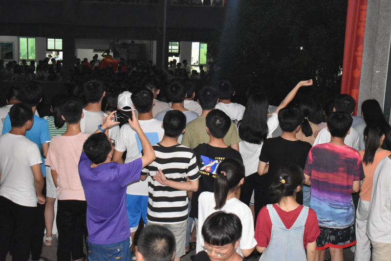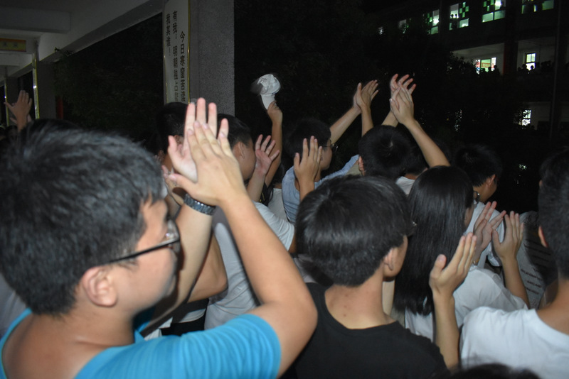7月6日晚8:20,第一节晚自习结束后,前栋教学楼高二年级走廊上传出清脆的喊声“高三加油,学长加油!”。一石激起千层浪,一瞬间,教学楼走廊上的人越来越多,声音越来越洪亮,准初一、初二的同学也为学长呐喊助威!“天王盖地虎,全上985!宝塔镇河妖,全上211!”记者站在教学楼中间的通道上,一浪高过一浪的呼喊,让人血脉喷张,激情四射,呼喊声、歌声、掌声交响成乐,响彻青麓山,经久不息。
