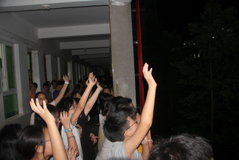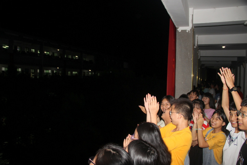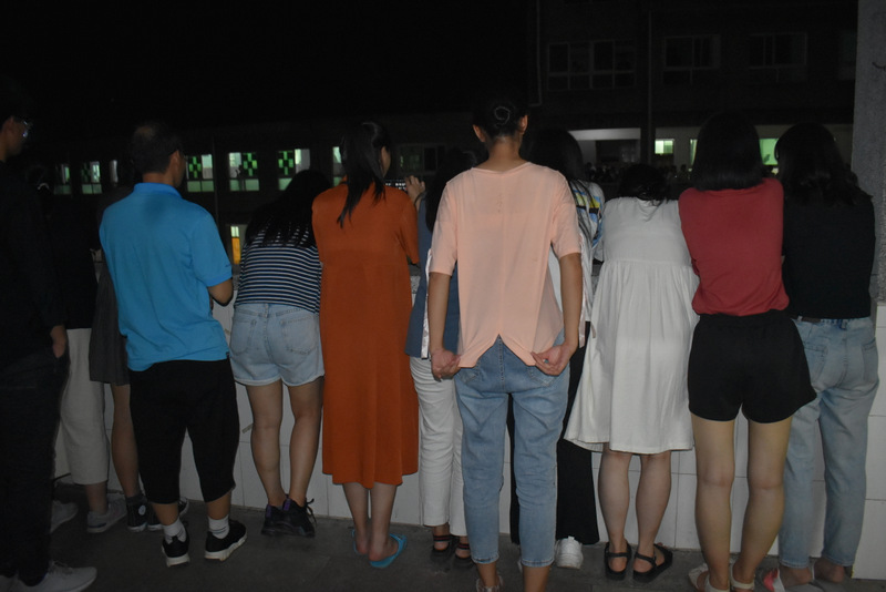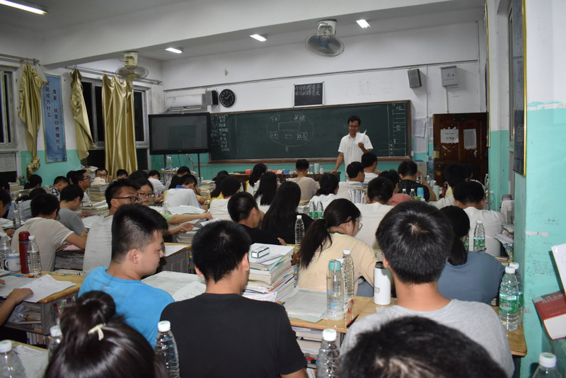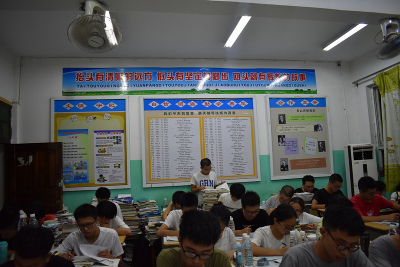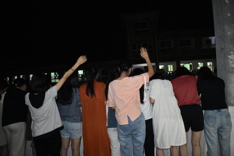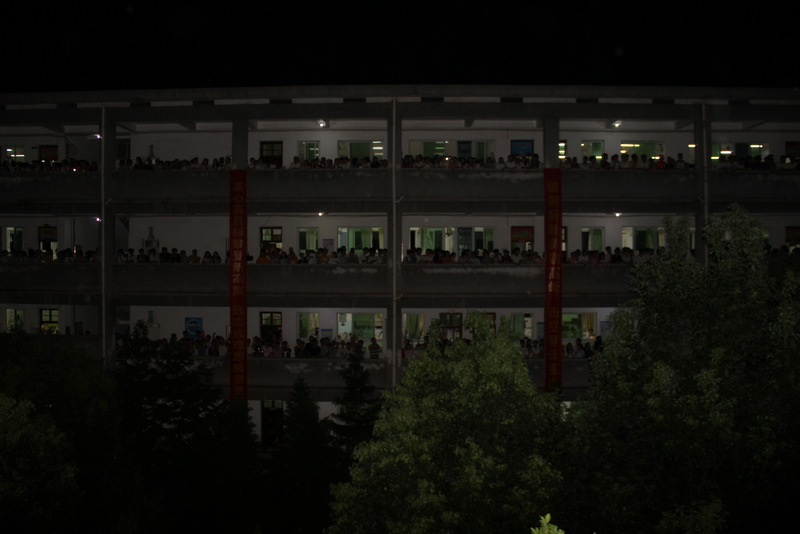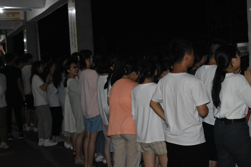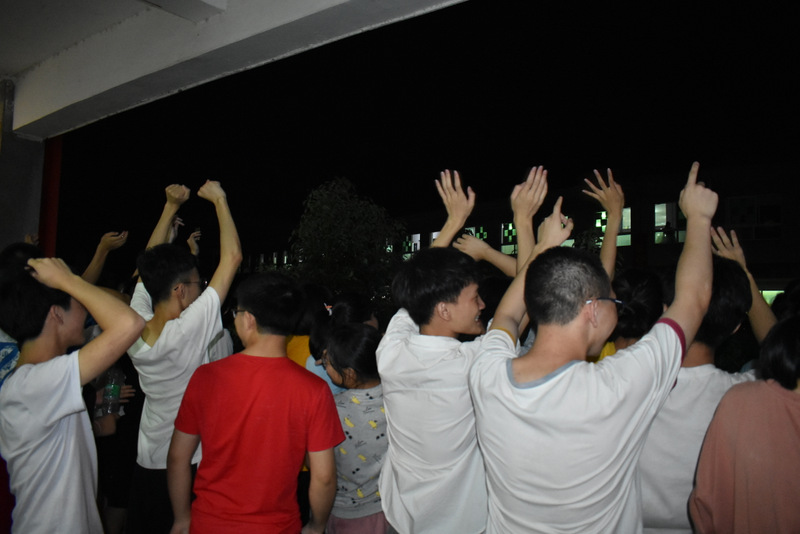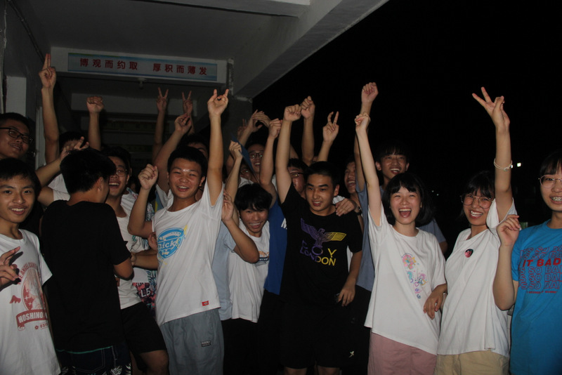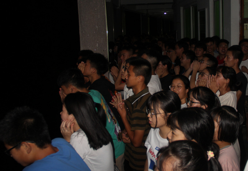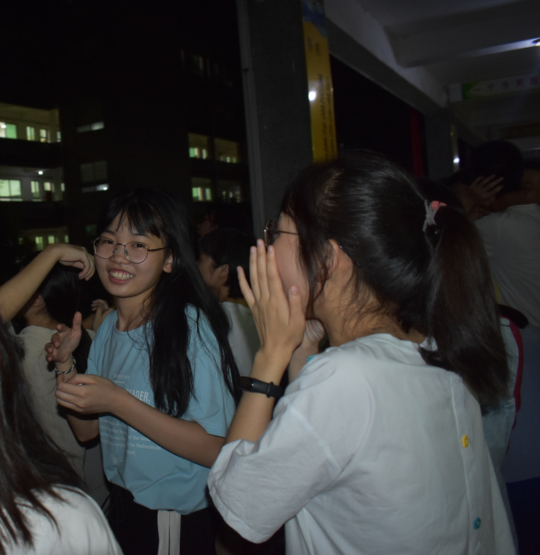 7月6日晚8:20,第一节晚自习结束后,前栋教学楼高二年级走廊上传出清脆的喊声“高三加油,学长加油!”。一石激起千层浪,一瞬间,教学楼走廊上的人越来越多,声音越来越洪亮,准初一、初二的同学也为学长呐喊助威!“天王盖地虎,全上985!宝塔镇河妖,全上211!”记者站在教学楼中间的通道上,一浪高过一浪的呼喊,让人血脉喷张,激情四射,呼喊声、歌声、掌声交响成乐,响彻青麓山,经久不息。