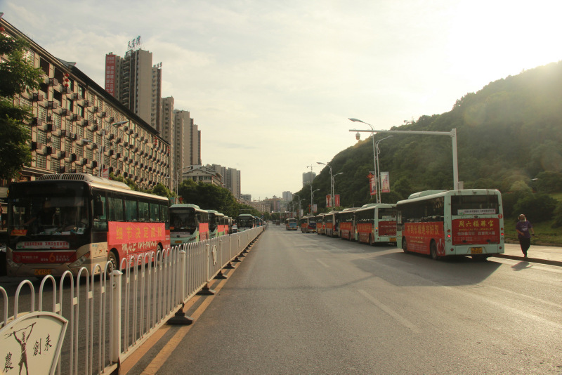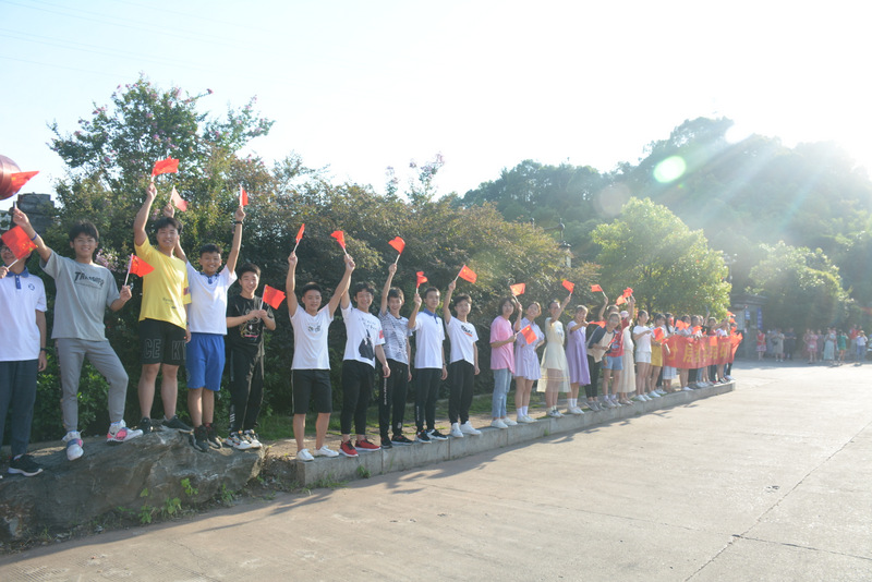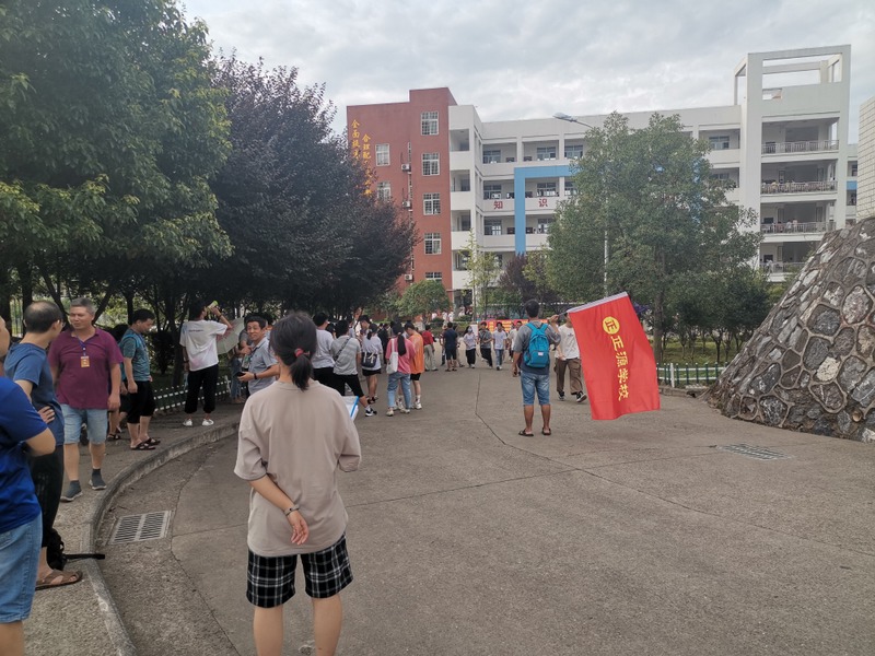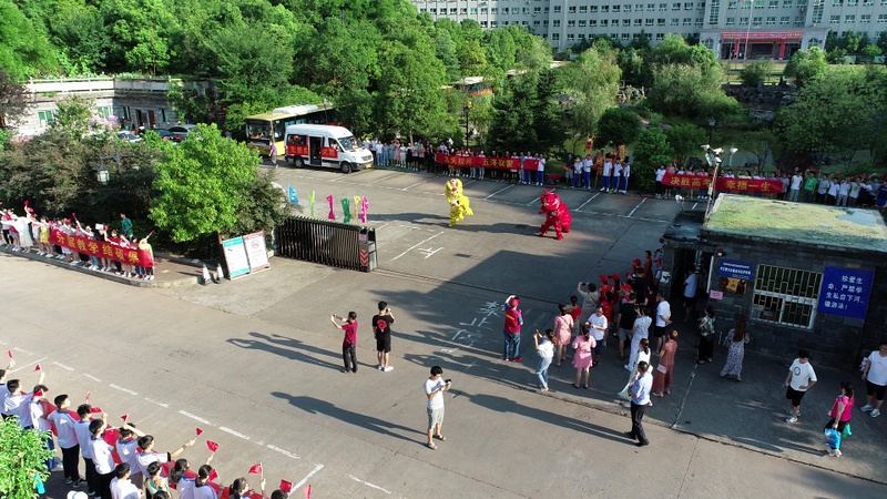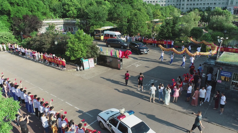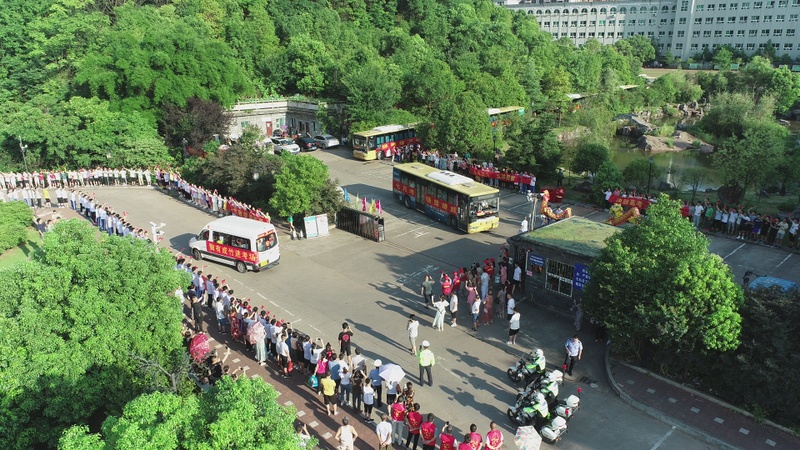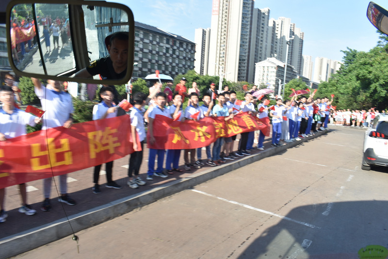 7:28,交警开路,罗校长领航,送考车队缓缓驶出学校大门,高二年级组织的欢送队伍再次把送考的气氛推上高潮,孩子们整齐的站在两边人行道上,手挥红旗,为学长出征呐喊助威。车队进入联络线后,车队兵分四路,分别朝一中、二中、职高、实验中学方向,踏梦前行。