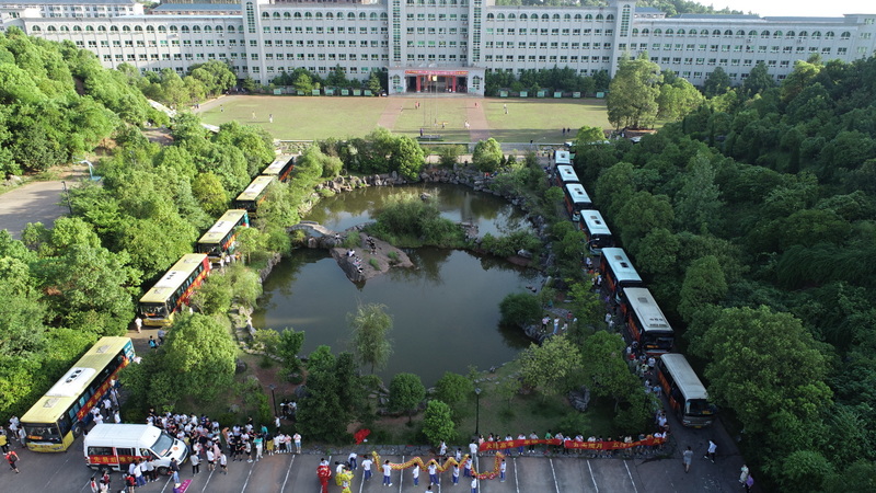 清晨,阳光从东边洒进校园,干净且温柔。6:30,生活老师准时吹响起床哨,考生们不紧不慢地起床、洗漱。宿舍外,72辆送考车辆沿学校环校道路依序停靠,航拍俯瞰,宛如青麓山里的两条盘虬卧龙,正蓄势游戏耒水。