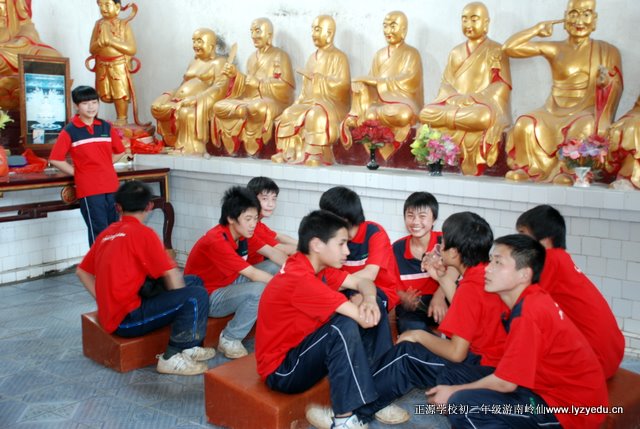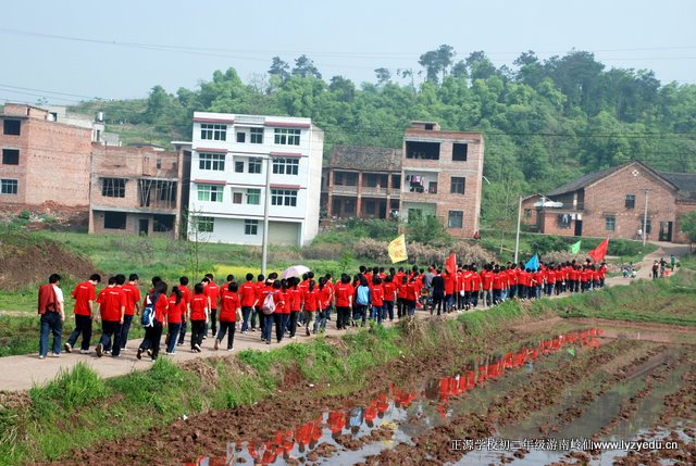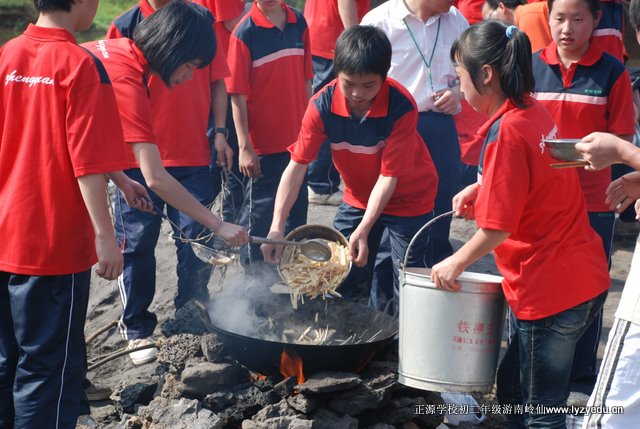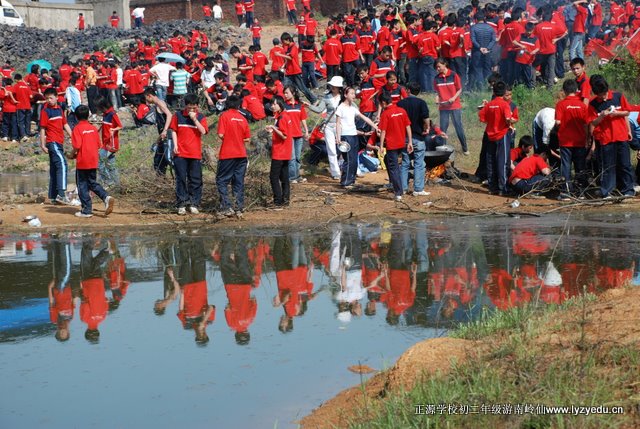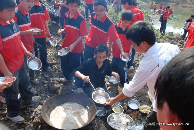 此次春游的目的地是南岭仙。队伍由学校出发,经过“国际新城”施工工地、五里牌二组,至三桥村,然后弃大路,走小路。从三桥村到锡里村,走的全是田间小道,学子们呼吸着带有泥土芳香的空气,饱览了田园风光,见识了“小桥、流水、人家”,心情特别的惬意。由锡里往北走,穿过铁道,翻过一条山脊,至王家湾。再经周家湾、南岭村7组,铁合金厂,便到了南岭仙的山脚下了。“红衫军”经过近四个小时的长途跋涉但兴致不减,他们一鼓作气,登上山顶,来到了南岭仙。学子们有的烧香拜佛;有的眺望远方,感受“一览众山小”的意境;还有的忙着摄影留念。场面热闹却不凌乱,展示了学子们良好的素质。在山顶稍事休息后,“红衫军”又快速移动到山下,至铁合金厂附近开始野炊。这时最忙的要算我们罗校长了,一会儿教孩子们如何包饺子,一会儿忙着给孩子们拍照,还不时地与学生们合影留念,十二个班他全走到了,拍个不停,忙得汗流浃背。学生们也训练有素,分工合作,很快就做出了香喷喷的午餐……