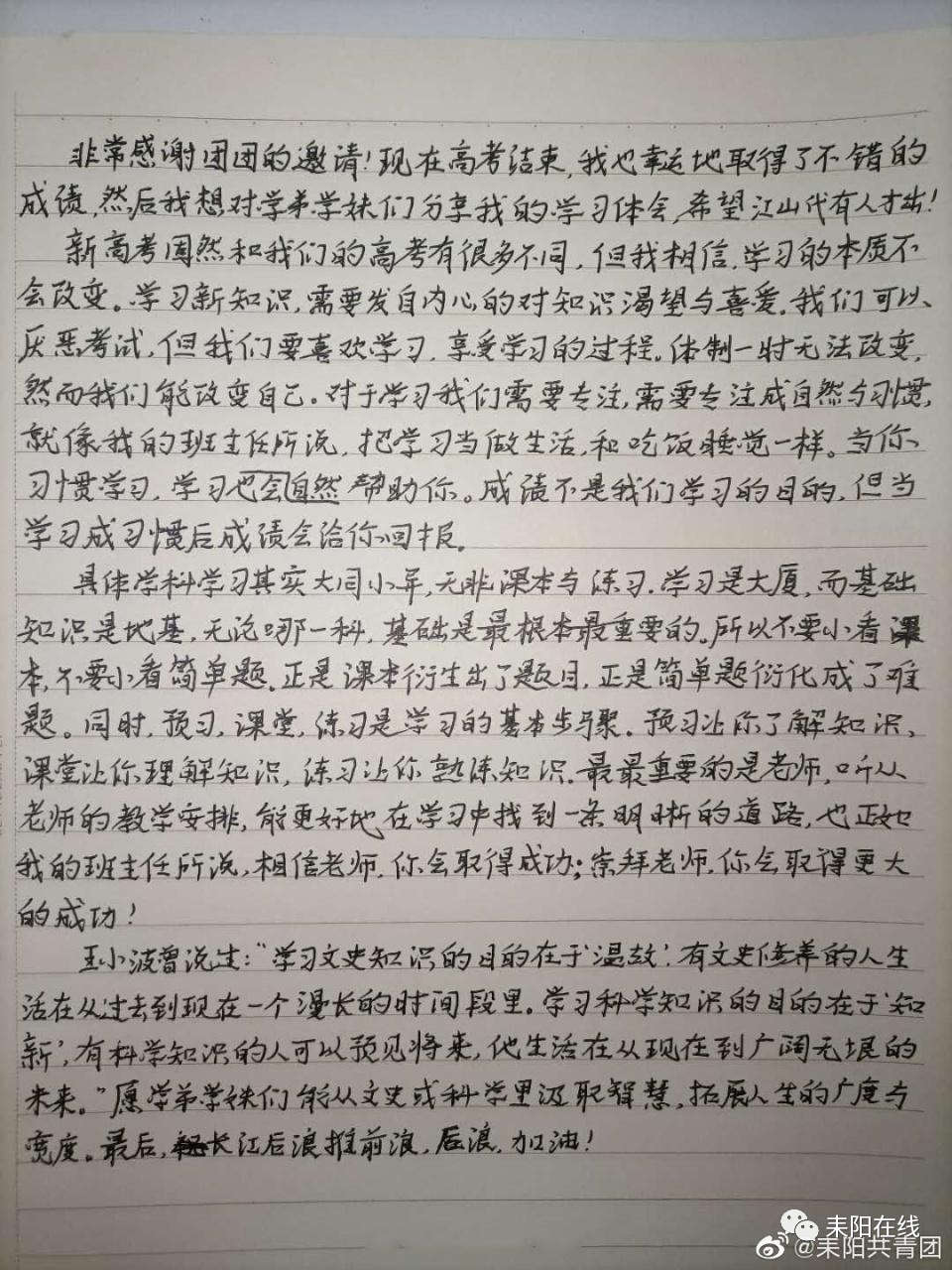 耒阳在线:耒阳“考古女孩”给共青团寄出手写信,介绍考取北大武功秘笈
