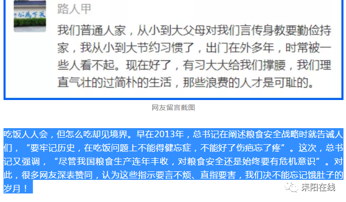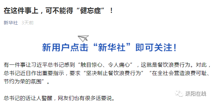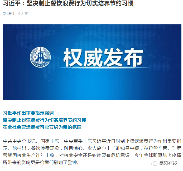 近日,习近平总书记对制止餐饮浪费行为作出重要指示:“厉行节约、反对浪费”。新华社、人民日报等权威媒体连续发文跟进宣传。