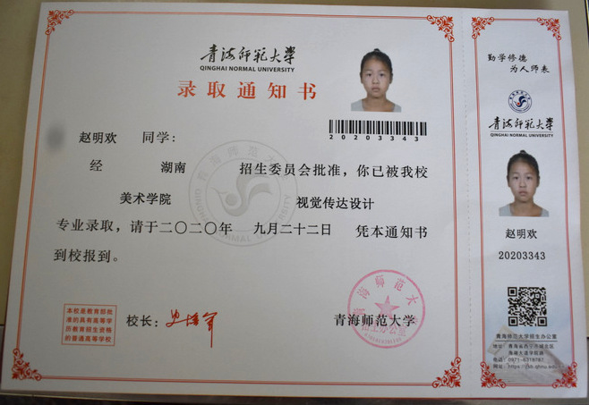 连日来,各大高校录取通知书逐渐落入主人之手,喜讯一个接连一个传到学校。9月7日,家住水东江街道泗门洲镇石下村1组的赵明欢同学拿到了自己的通知书,以文化395分,专业240分的成绩,被青海师范大学美术学院视觉传达设计专业录取。