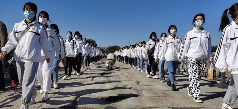 当天上午七点,励志团队从宾馆出发,统一乘坐地铁并转公交来到卢沟桥。十月初的卢沟桥上,永定河吹来的风冰冷刺骨,同学们分两列缓缓地走在桥面上,面对千姿百态、栩栩如生的石狮,却无心欣赏。83年过去了,日军侵华留下的弹孔仍在。参观完毕,北大考古女孩钟芳蓉的奶奶勉励现场的同学们,努力学习,为国家争光,为人民争光。