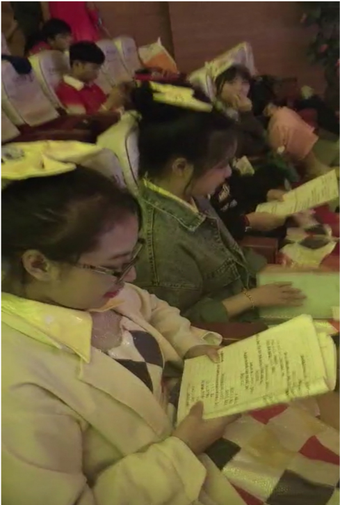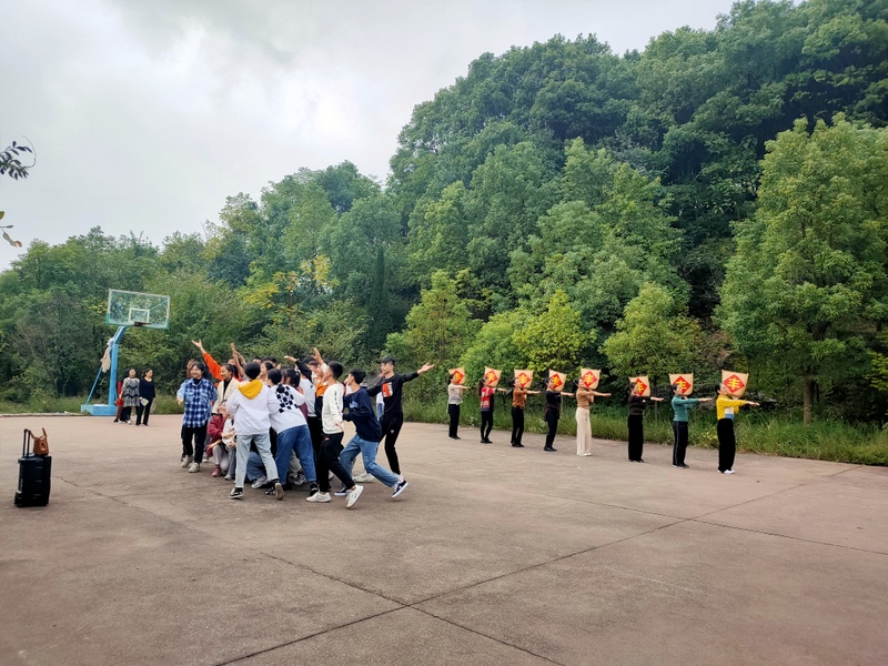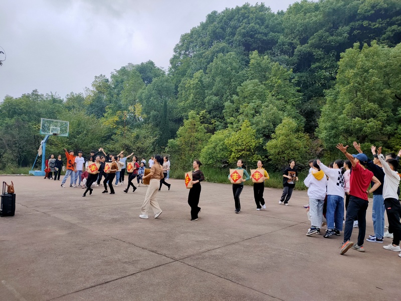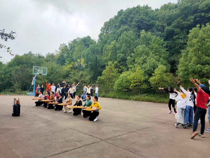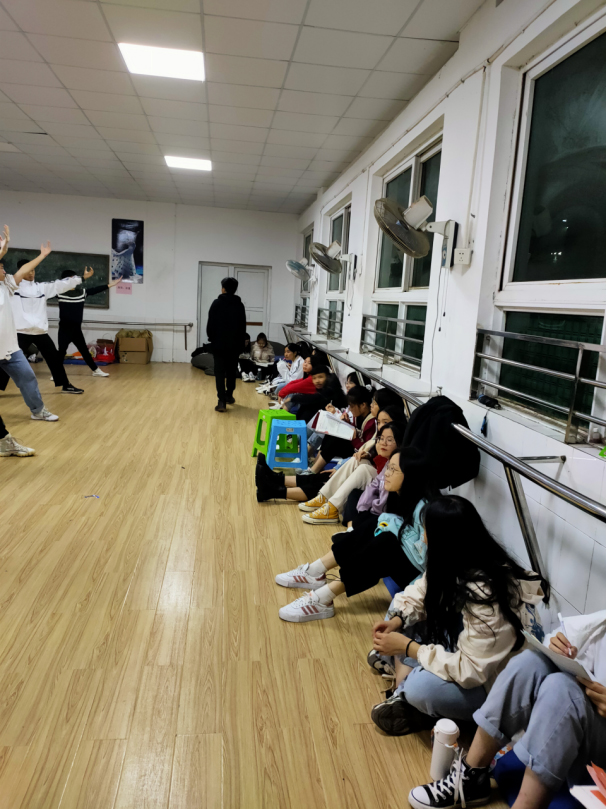 为了在本次晚会上把最好的节目展现给观众,学校领导层十分重视,九月初迅速召开了调度会,组织创作班子,由音乐组长李娟老师牵头,进行整体策划,构思节目形式及舞蹈动作设计,九月中旬开始排练。根据节目要求,出场演员108人,其中正源学校包括7名老师共93人,媒婆和送亲队伍都是由耒阳市戏曲协会的15名会员友情出演。参演的学生中,21名舞蹈专业生,其他65名非专业学生,这对于非舞蹈专业的李娟老师及第一次编排舞蹈的张鸣罡老师来说,压力巨大。编排过程中,各种问题和小状况时有发生,两位负责老师每天排练到晚上十点多,在排练的过程中经常会看到这样的画面:因为参加表演的学生中百分之80都是高一高二两个年级的,学习任务重,在排练现场,休息的时间里总能看到坐在地上学习的孩子们,让排练老师既欣慰又心疼。