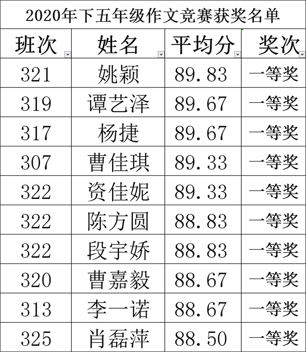 比赛结束后,语文老师从各班选出5篇优秀作文参加年级复评,再由全体语文老师流水评阅,取平均分,最终评选出一等奖10名,二等奖20名,三等奖40名。
