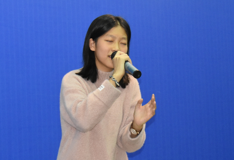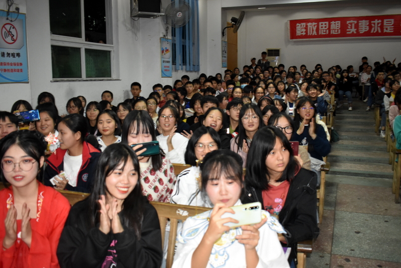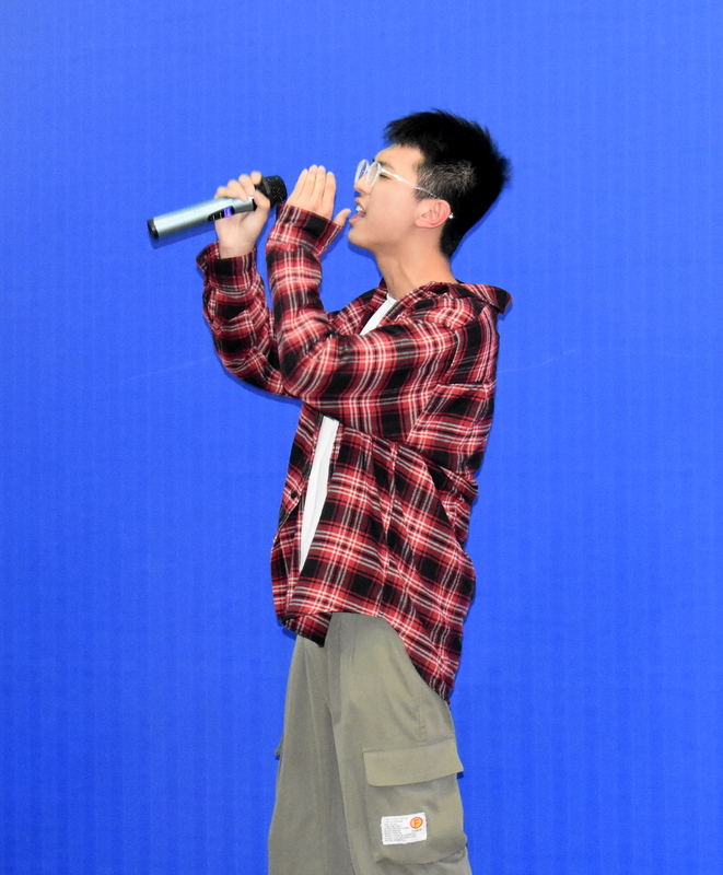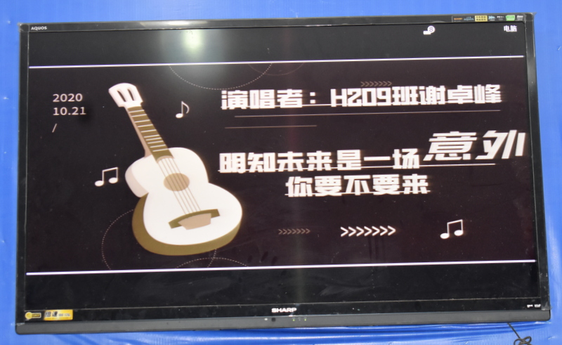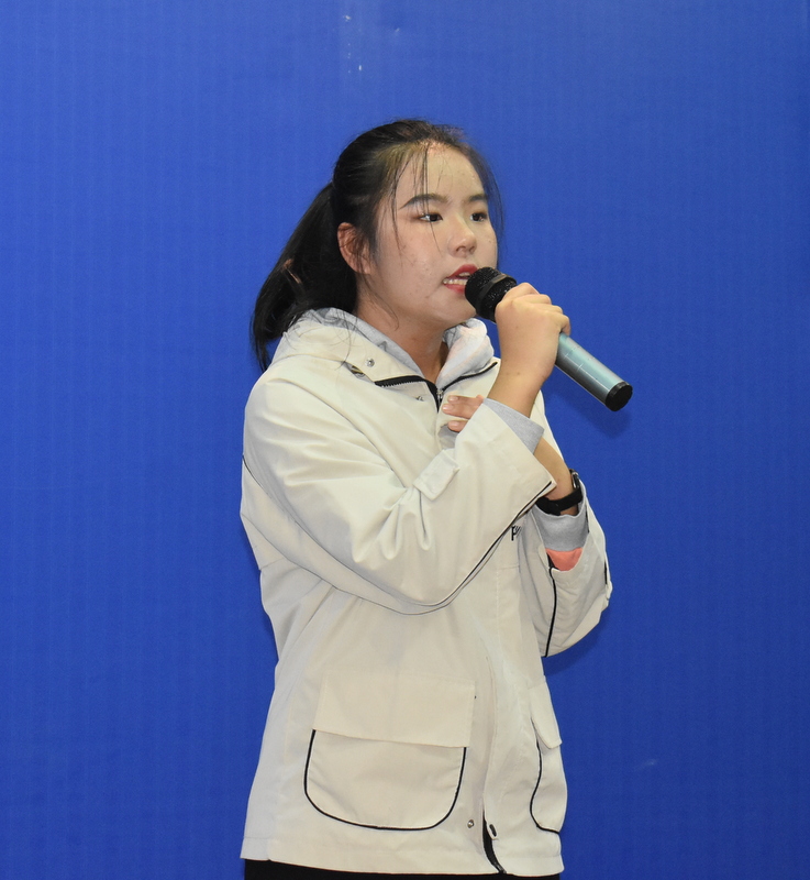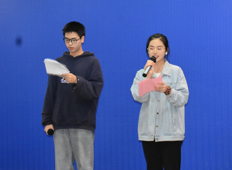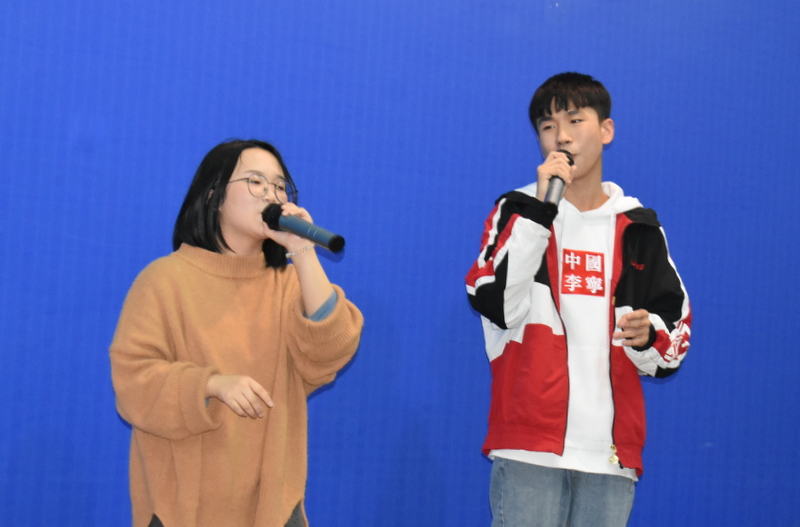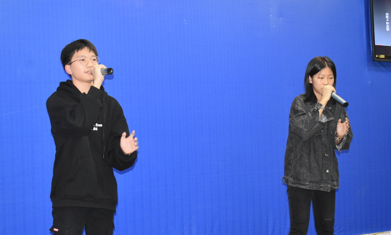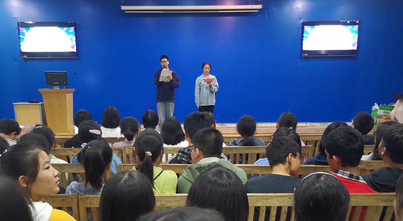 10月21日下午六点四十,决赛在报告厅正式举行。观众凭票入场,脸上洋溢着兴奋。在大家齐唱《奇迹再现》的歌声里,两位主持人吴月婷、谷跃臻带着热情的笑容上场,为观众们揭晓了比赛流程:独唱、中场和助唱环节。