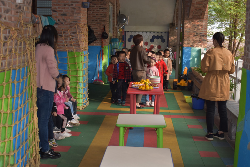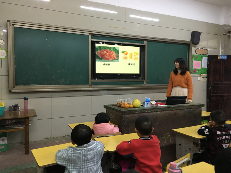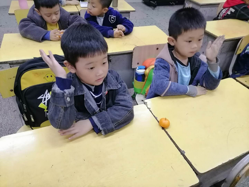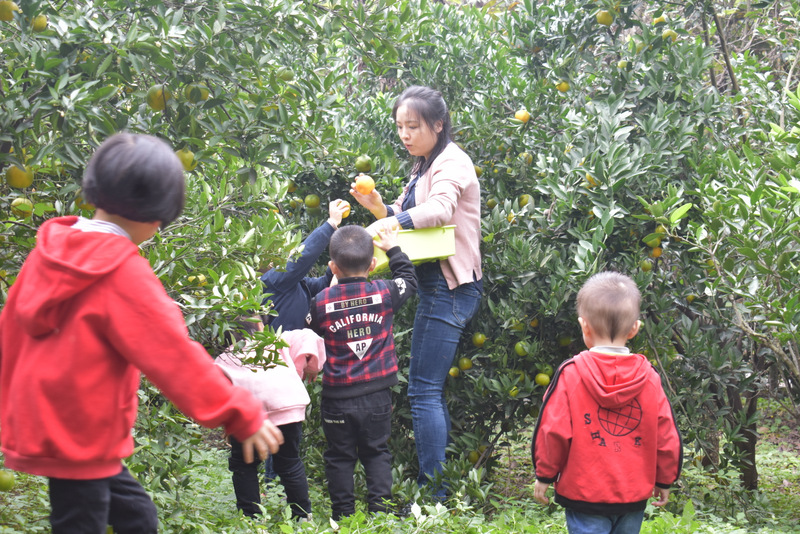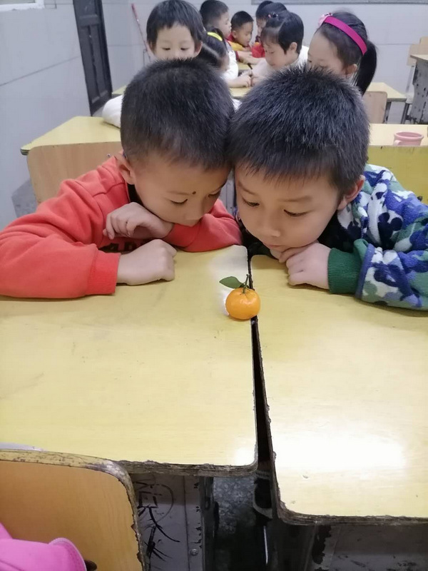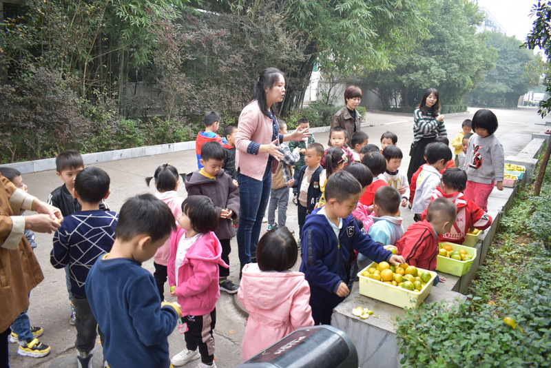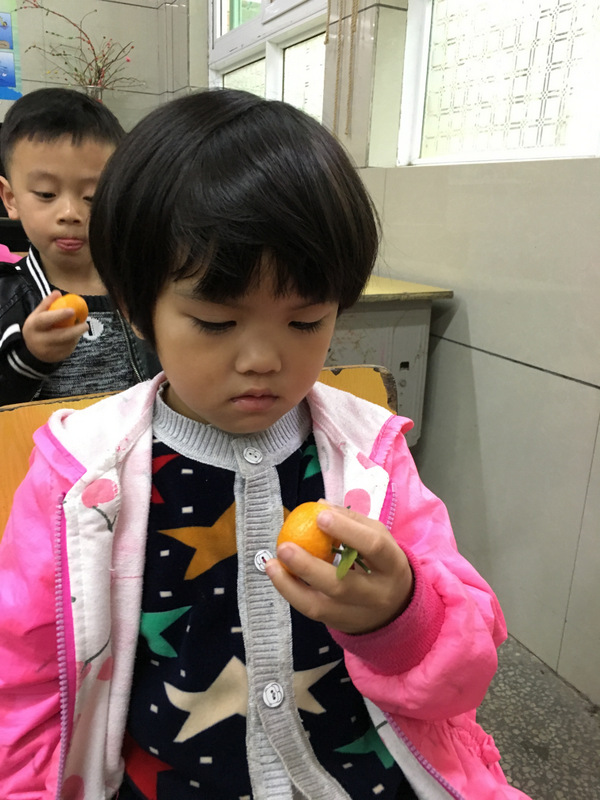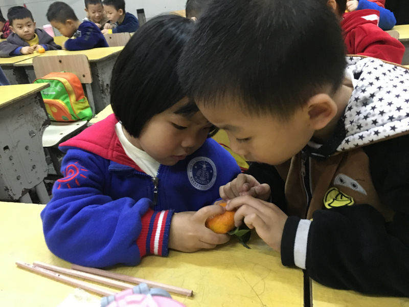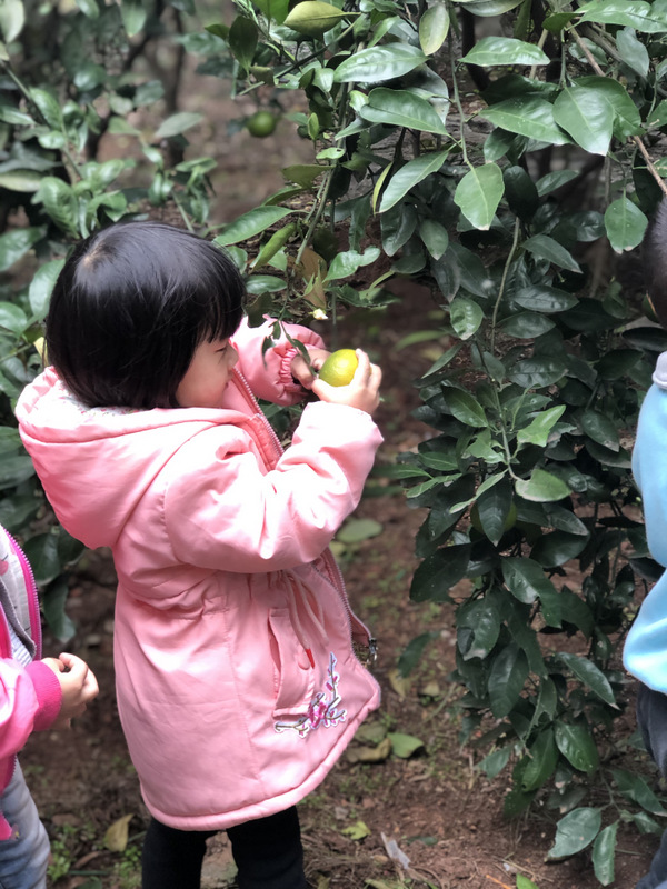 采摘之前,贺老师给大家上了一节生动的科学课——好吃的橘子。一节课下来,小朋友们通过仔细观察以及倾听老师的讲解,对橘子的外形有什么特点、分为哪几部分、都有一些什么种类、它有什么功效及作用有所了解。比如,白白的须须叫做橘络,它可以帮助我们止咳化痰,橘子可以分为砂糖橘、贡桔、金钱橘、蜜橘等等。