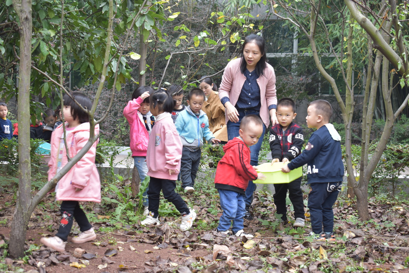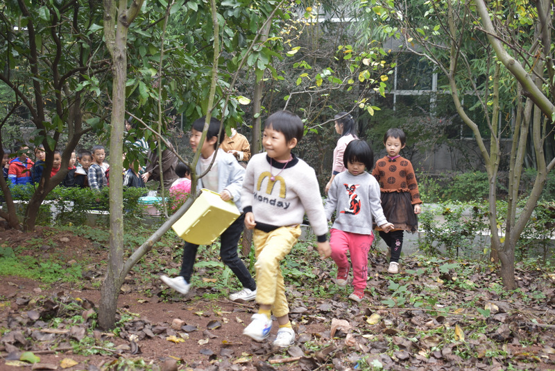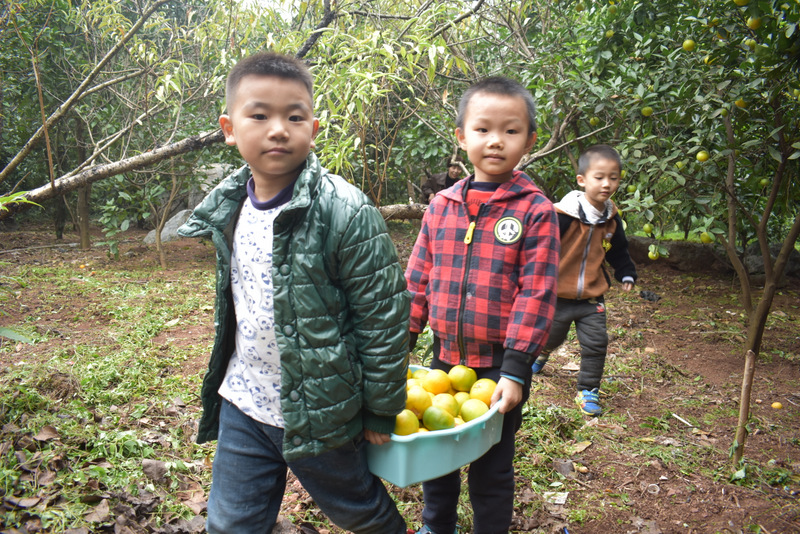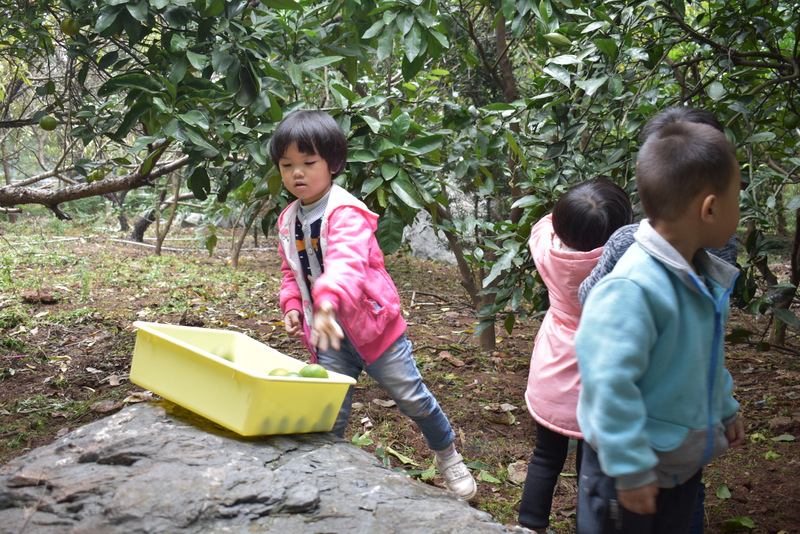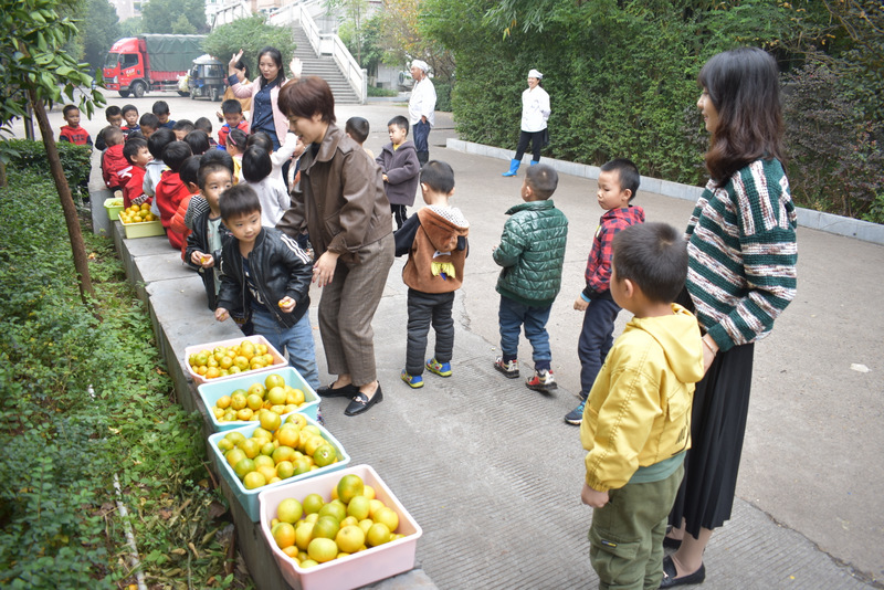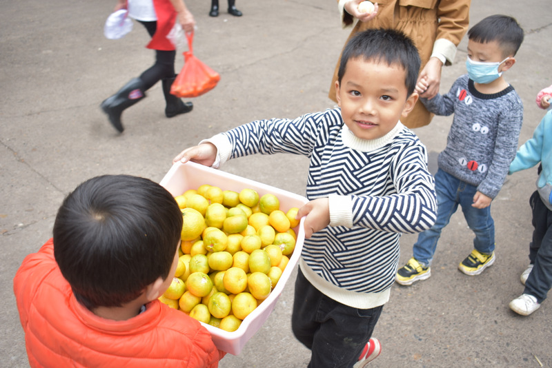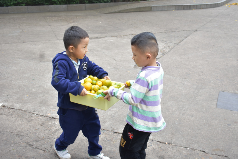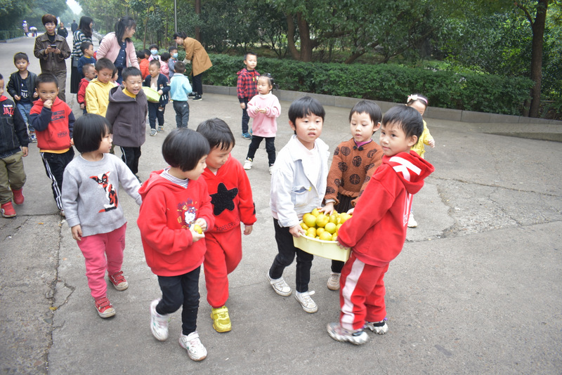 这么多的橘子,怎么拿回去呢?别着急,我们的小朋友个个都是大力士,抱的抱,抬的抬,都想出一份自己的力。有的小朋友实在抱不动了,就停下来休息一下,老师想帮忙都不让呢。