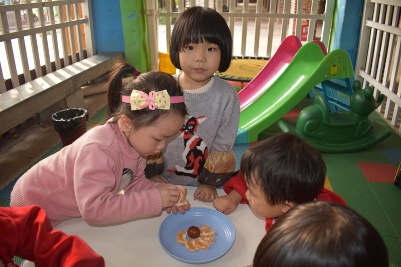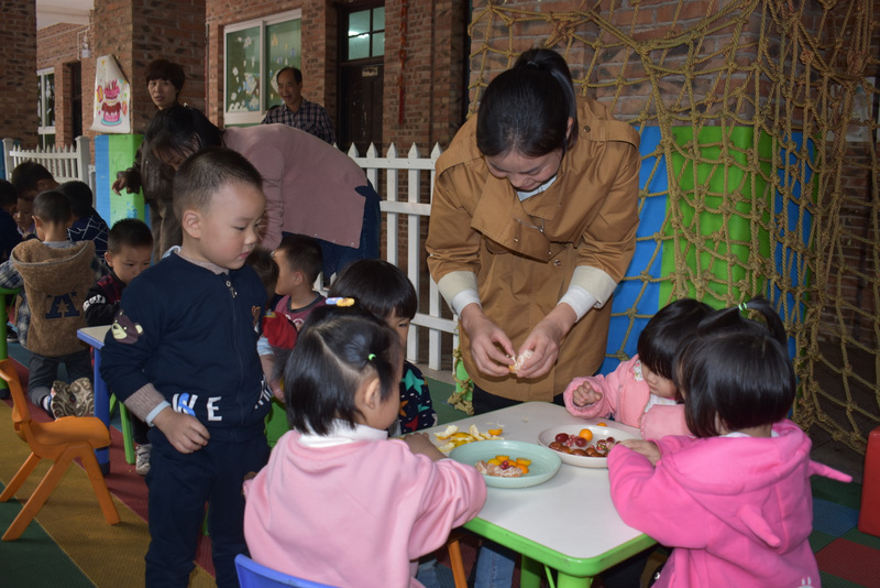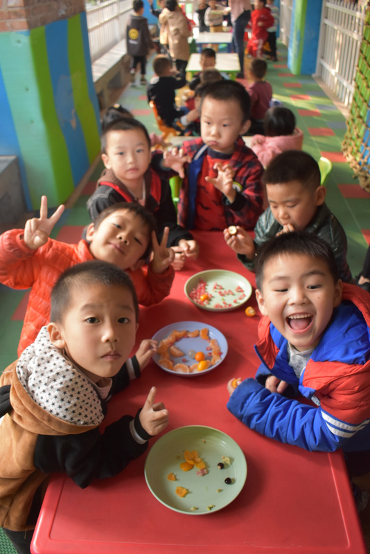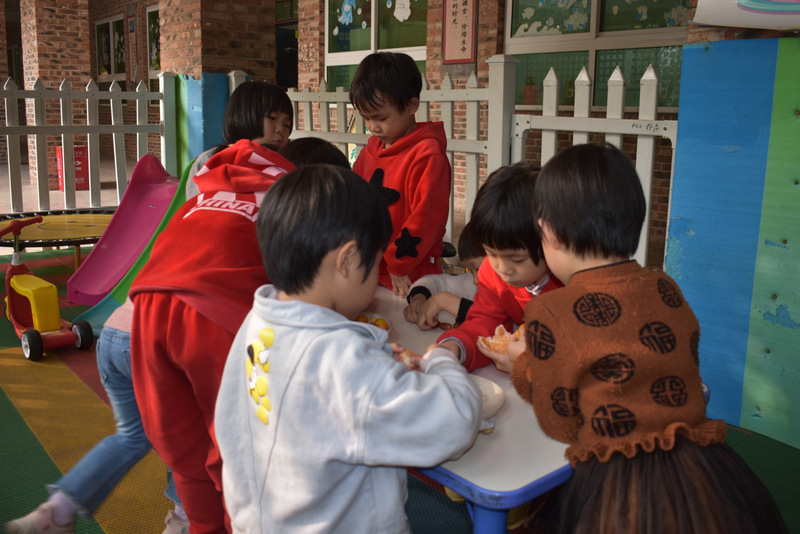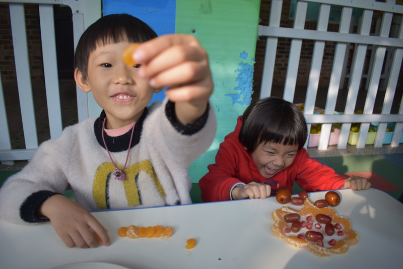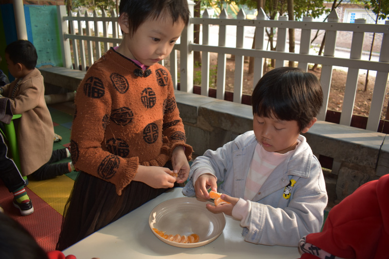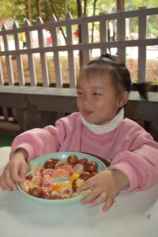 收获了六大框橘子,孩子们聚集在幼儿园活动区,用水果摆起了拼盘,把劳动实践课推向了高潮。橘子、桂圆、红枣、石榴、红提成了孩子们的拼盘材料。六人一桌围聚在一起,发挥孩子们独特的想象,用橘子做眼睛,红枣当鼻子,石榴变成了牙齿,人物形象呈现在碟子里,有模有样。把橘子一片片掰开,搭配红枣、红提围一圈,中间用橘子做成花蕊,一朵漂亮的水果之花绽放在托盘里。各种造型,随心所欲,各具形态。