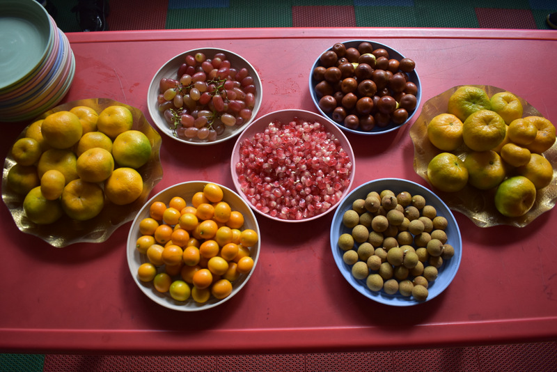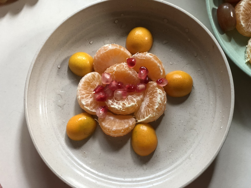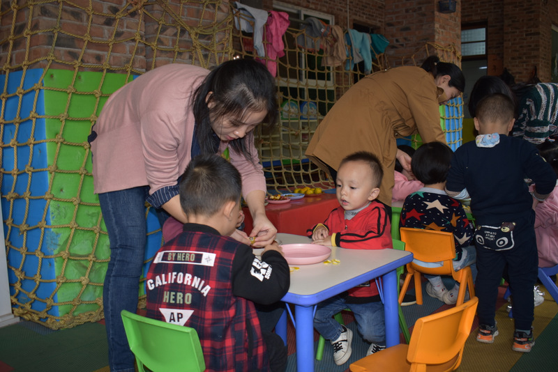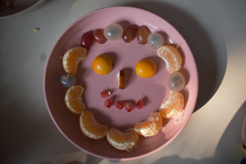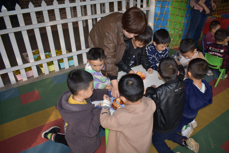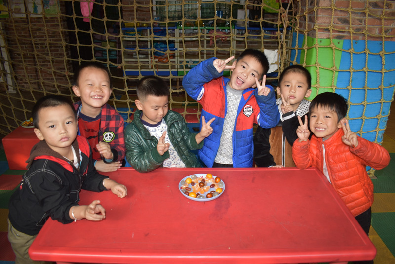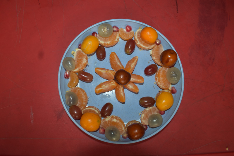 收获了六大框橘子,孩子们聚集在幼儿园活动区,用水果摆起了拼盘,把劳动实践课推向了高潮。橘子、桂圆、红枣、石榴、红提成了孩子们的拼盘材料。六人一桌围聚在一起,发挥孩子们独特的想象,用橘子做眼睛,红枣当鼻子,石榴变成了牙齿,人物形象呈现在碟子里,有模有样。把橘子一片片掰开,搭配红枣、红提围一圈,中间用橘子做成花蕊,一朵漂亮的水果之花绽放在托盘里。各种造型,随心所欲,各具形态。
