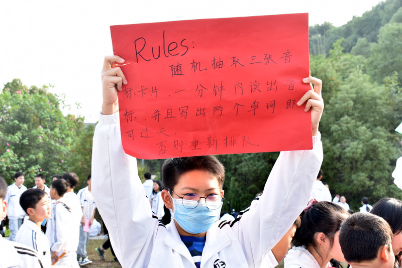 本次嘉年华英语活动意在为广大爱好英语的同学们提供一个展示舞台,营造健康向上、积极进取的学习氛围,切实提高英语口语水平。初一年级每个同学都拥有一张过关卡,每过一关,他们就会得到一个老师的签名,签名越多,得到的奖品越多。每一个英语老师都设立了关卡,比如:物以类聚、单词捉迷藏、单词消消乐、根据音标读写单词、趣味跳绳、听口令指五官、你划我猜、规定时间内说出含有指定音标的单词、看图片猜动物、字母组单词、萝卜蹲等,有易有难,能过多少关就看自己的能力了。同学们摩拳擦掌,跃跃欲试。活动持续了两个小时,在这欢乐的学校广场里,有的同学欢呼雀跃,因为过了一关又一关。有的同学眼里掩不住失落,因为失败了。还看见一位男生在抹眼泪,原来是好多关卡他都来不及排队,不能尽情地去过关斩将。