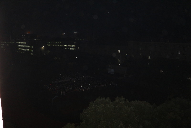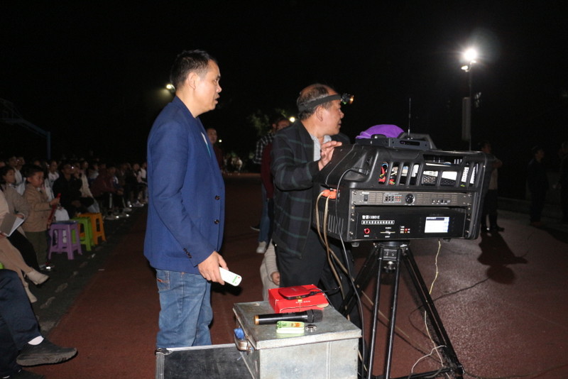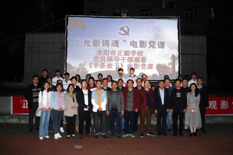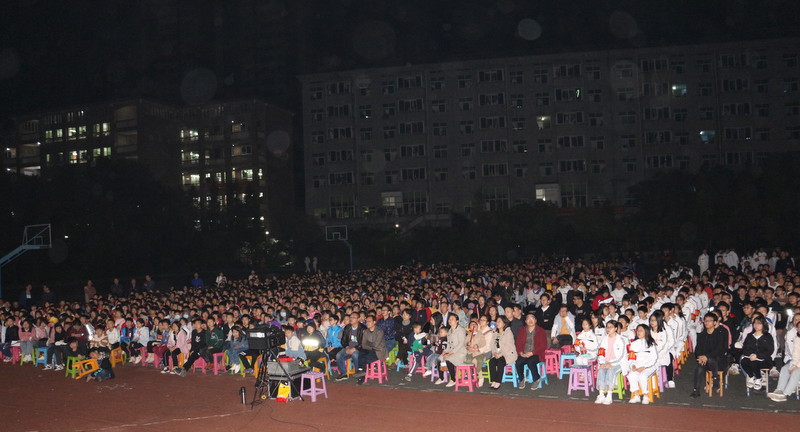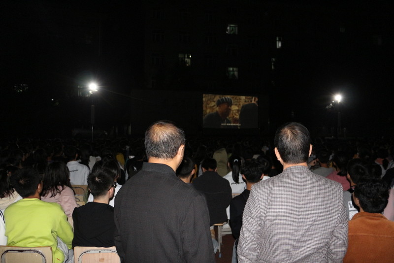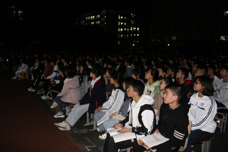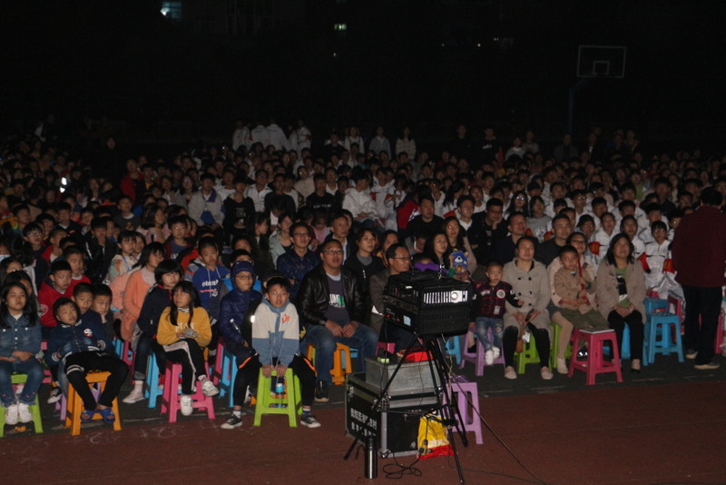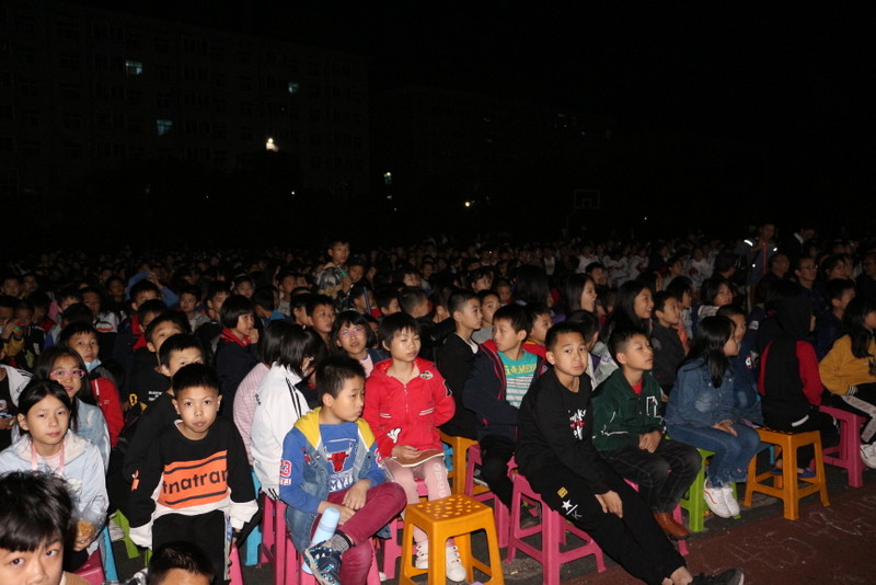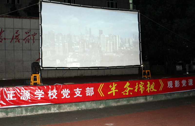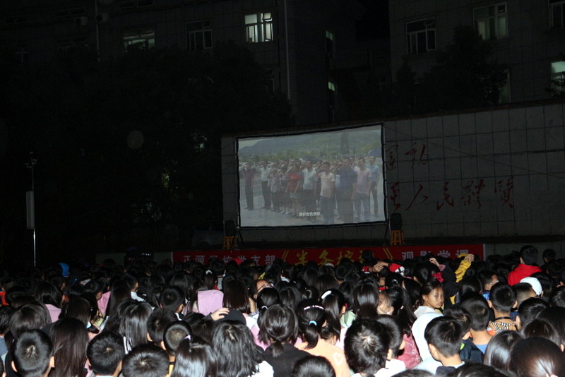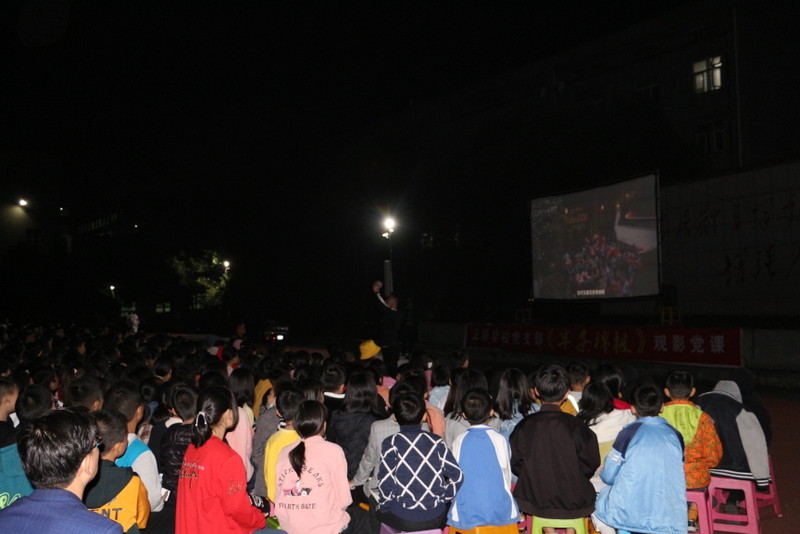 晚上七点,小学部运动场变身露天电影院,学校党员、准初一年级师生、全校团员、学生会干部及学校教师1800余人,端坐在运动场内,观看电影《半条被子》。