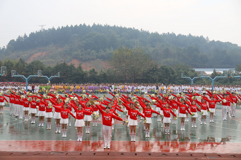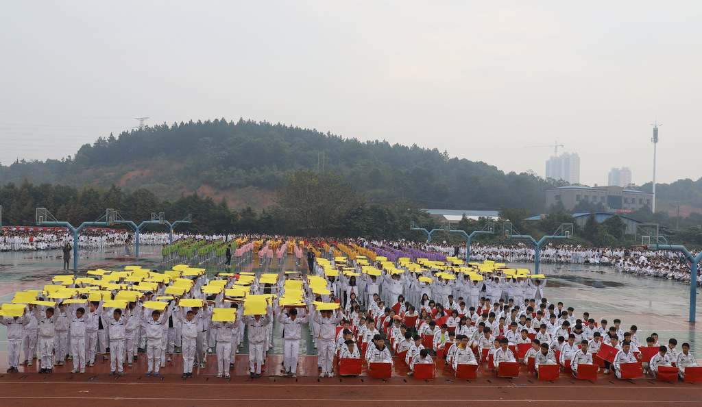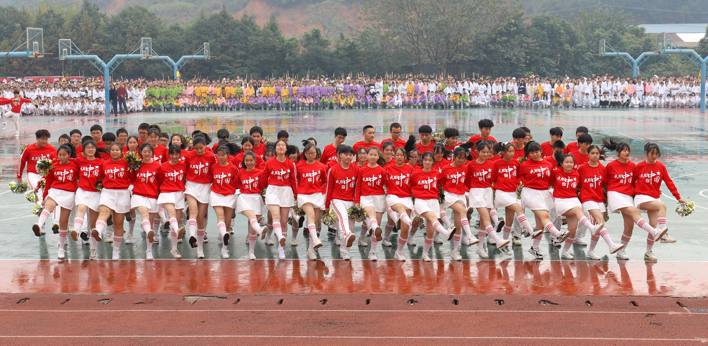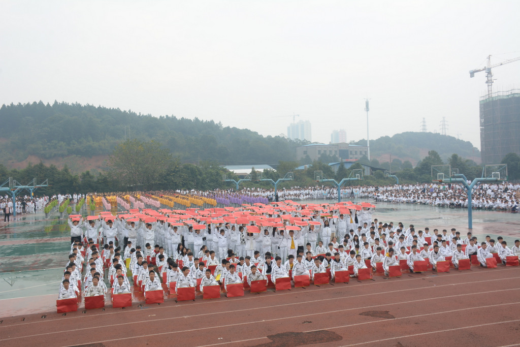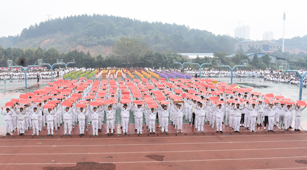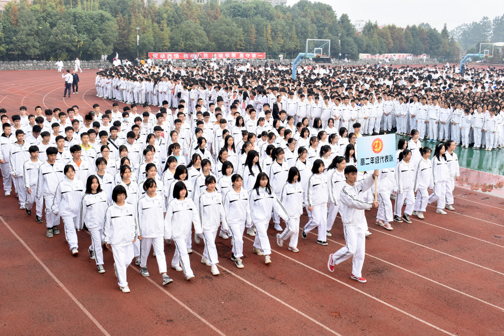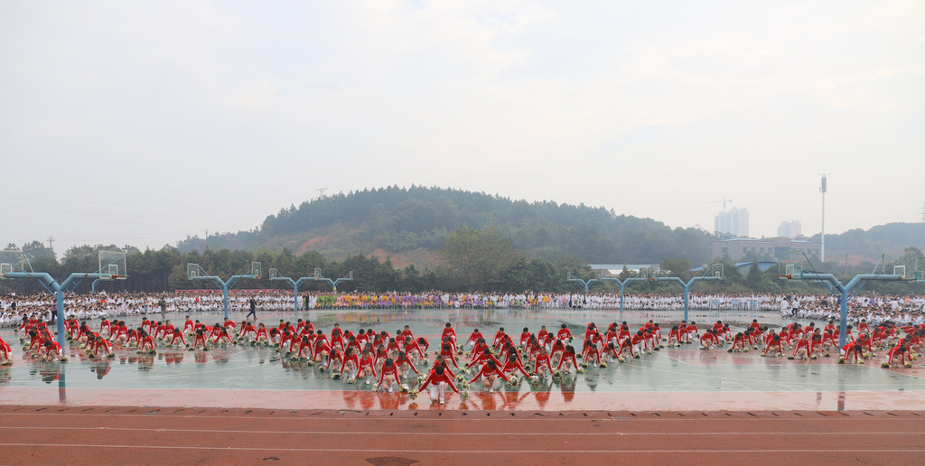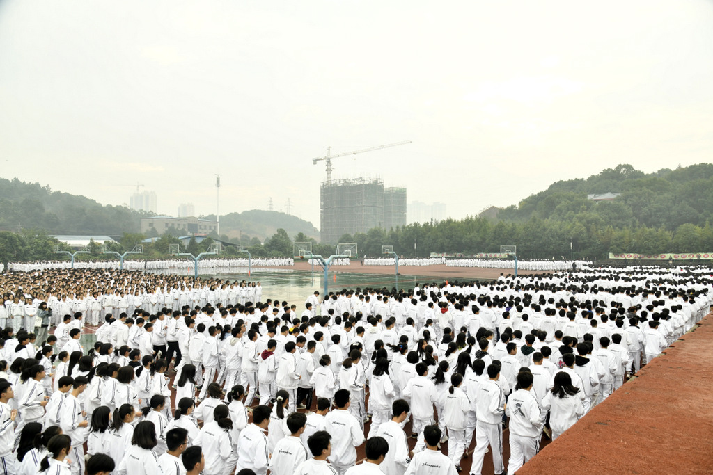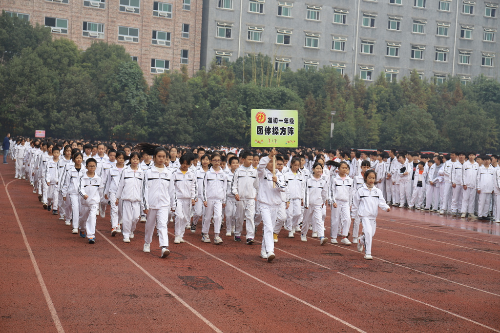 中学生运动场, 万人跑操队伍已经排成一百多个方阵整装待发;从准高一、高一两个年级抽调的1000名太极学员已在西侧的环校步道集结就绪;各大表演队伍也已经着装整齐,化好妆容散落在周边的篮球场、排球场、羽毛球场,摩拳擦掌等候入场。熟悉的“一日两千,一生康健”广播响起,百余个方阵应声而动,首尾相连,行是行,列是列,阵仗森严,嚯嚯有声。环形跑道化身为铁轨,百余个方阵俨然洁白的高铁列车一般,在激昂的广播节奏中鱼贯前行……