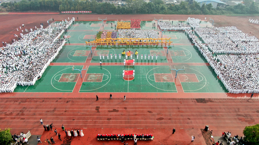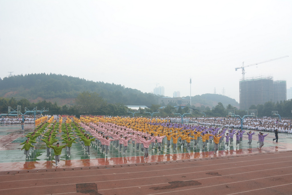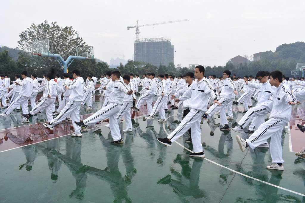 独创“5+3+4”特色学制的正源中学部共有8个年级和一个艺术部。分属8个年级和艺术部的跑操队伍各自退场归队的同时,来自准高一和高一两个年级的1000名同学已然悄无声息地出现在运动场中央。悠扬的乐曲声中,马步扎下,云手扬起,操场中央一片行云流水。