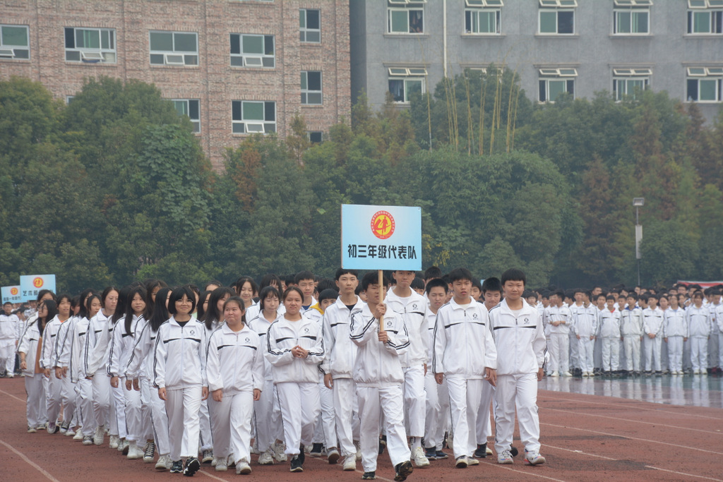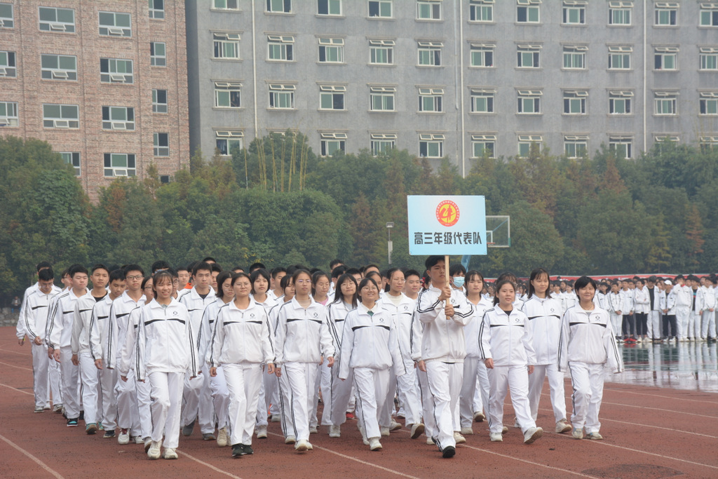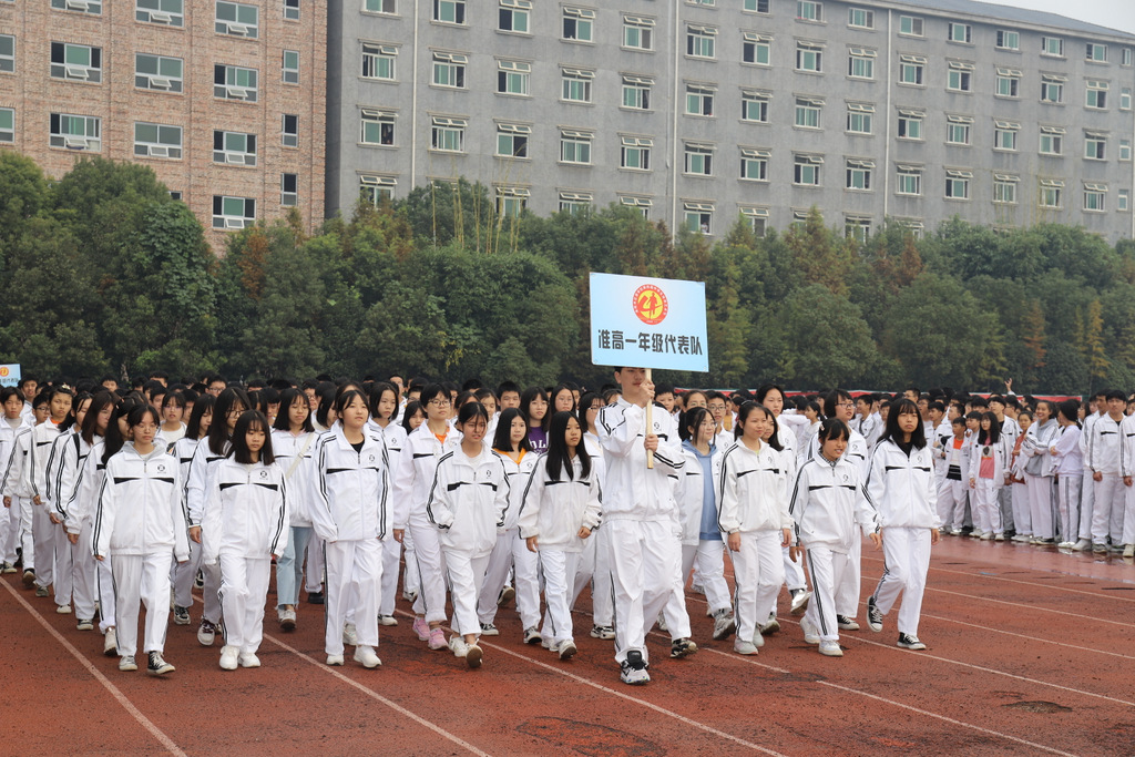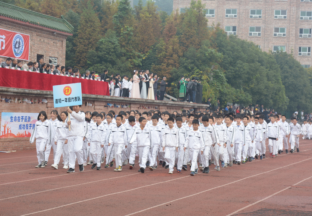 《运动员进行曲》响起,各年级的表演方阵、运动员方阵紧随国旗方阵与会徽方阵,迈着坚定的步伐展现在主席台前。